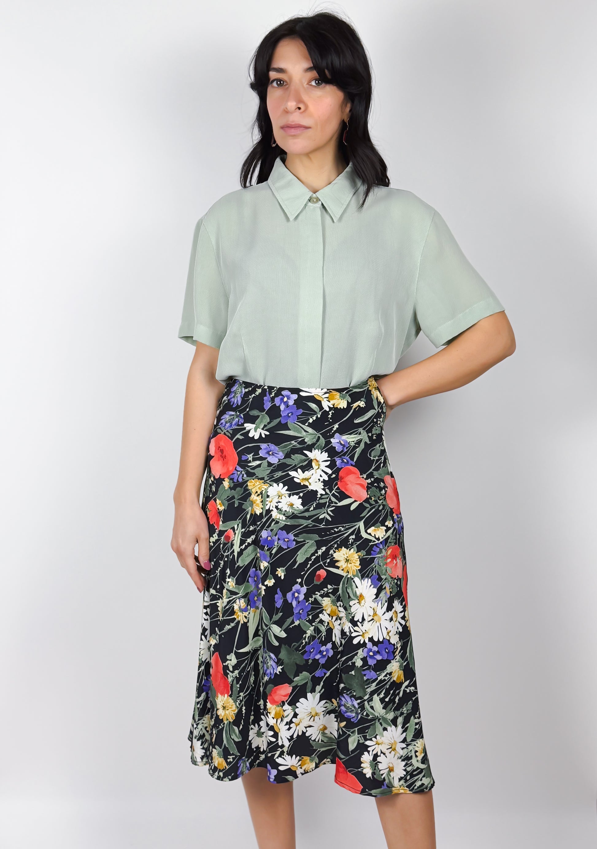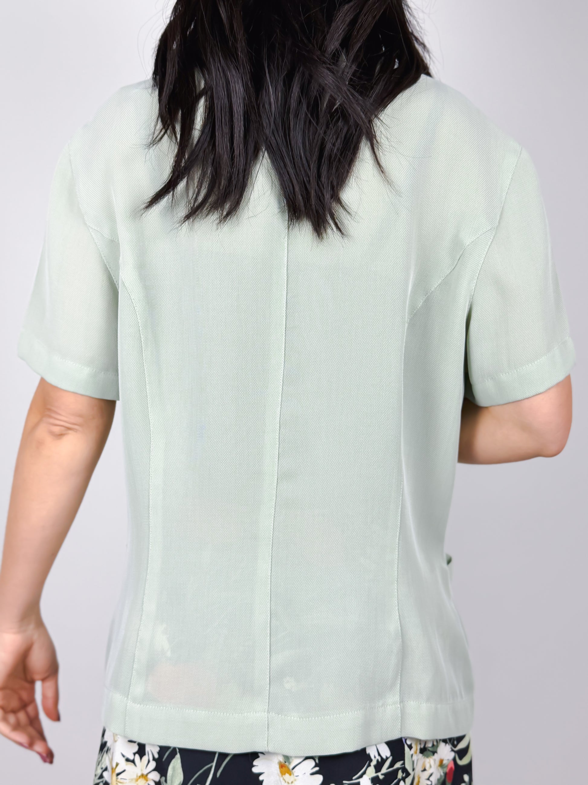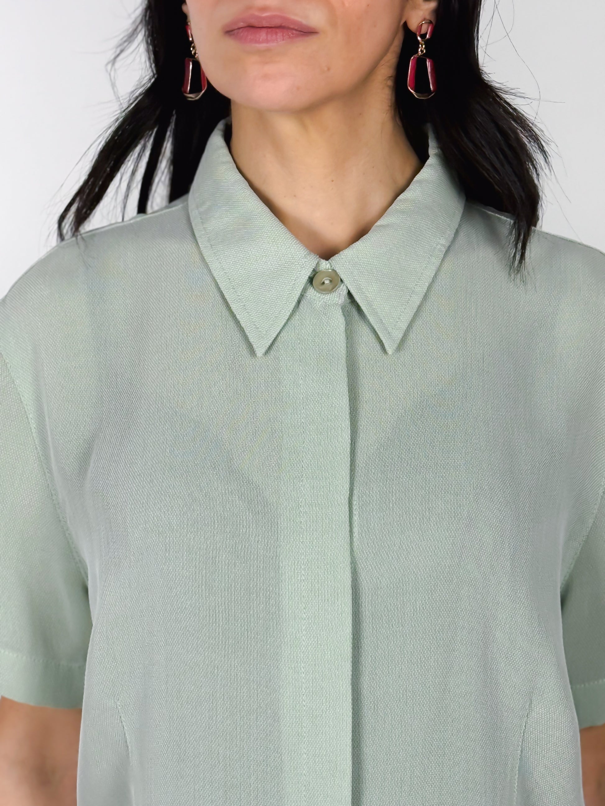 Camicetta anni '90 verde menta, mezze maniche e tasche frontali. Leggermente avvitata, chiusura con bottoni a scomparsa e un bottone finale visibile. Ottima qualità, tessuto leggero e rifiniture dettagliate. Made in Italy, marchio Vittoria Verani.