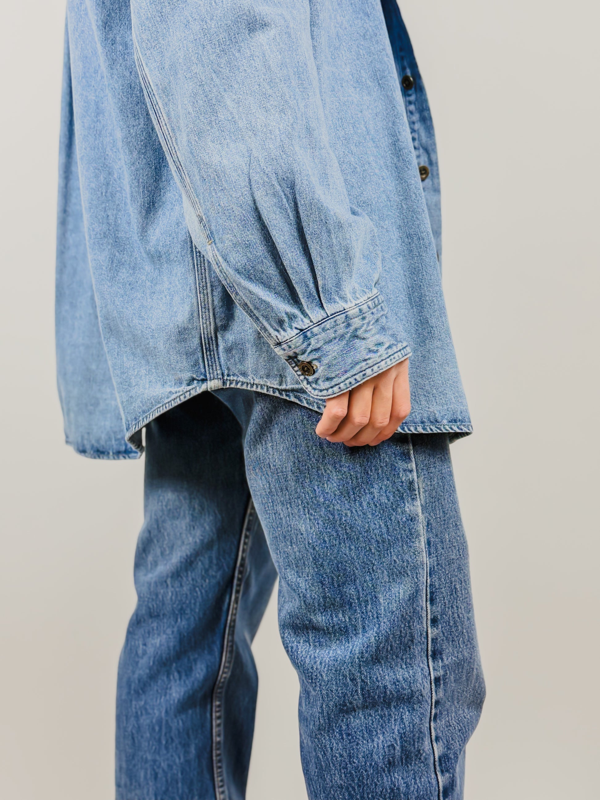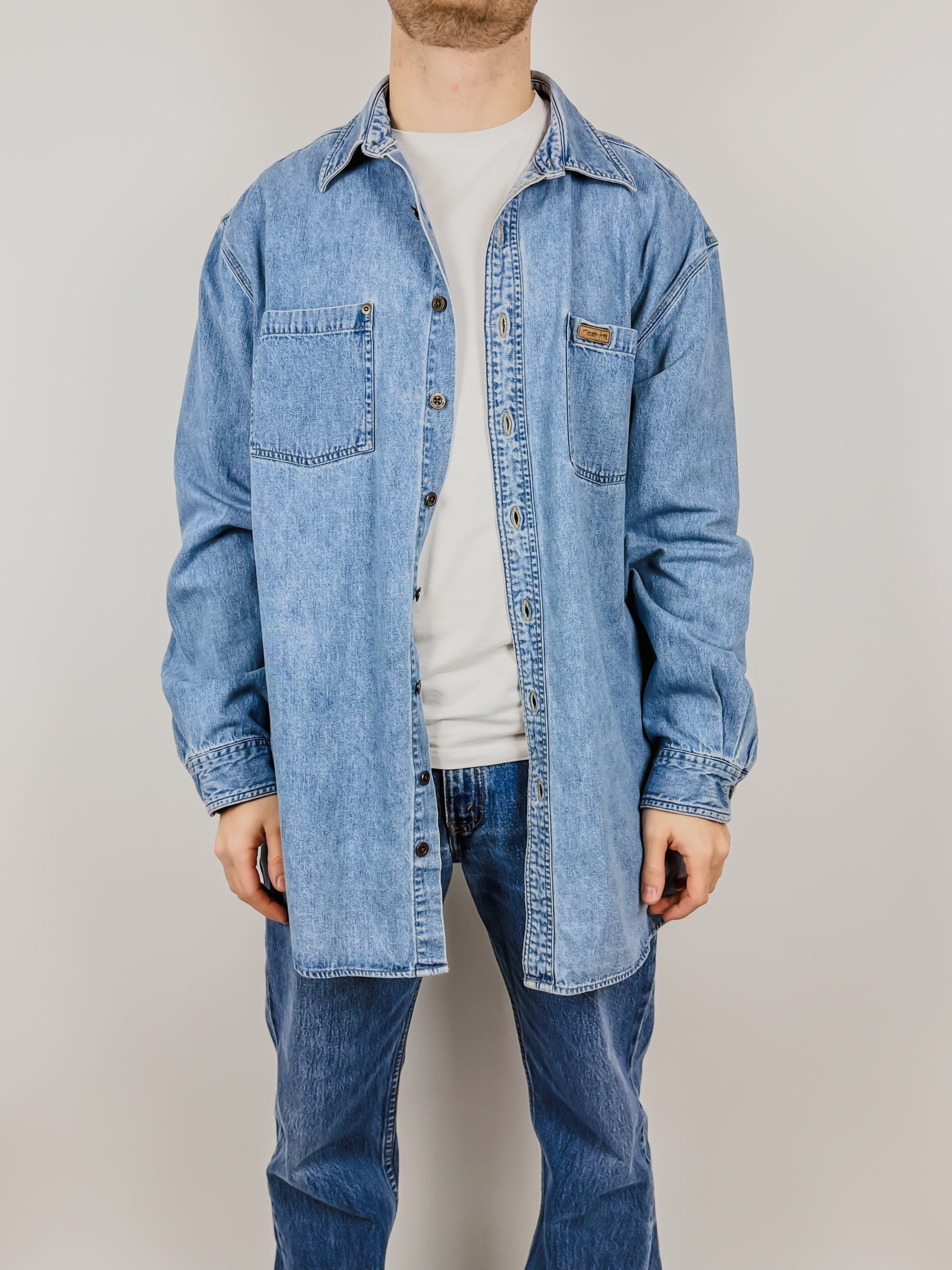 Carhartt denim shirt, light wash, logo button fastening, double button cuffs.