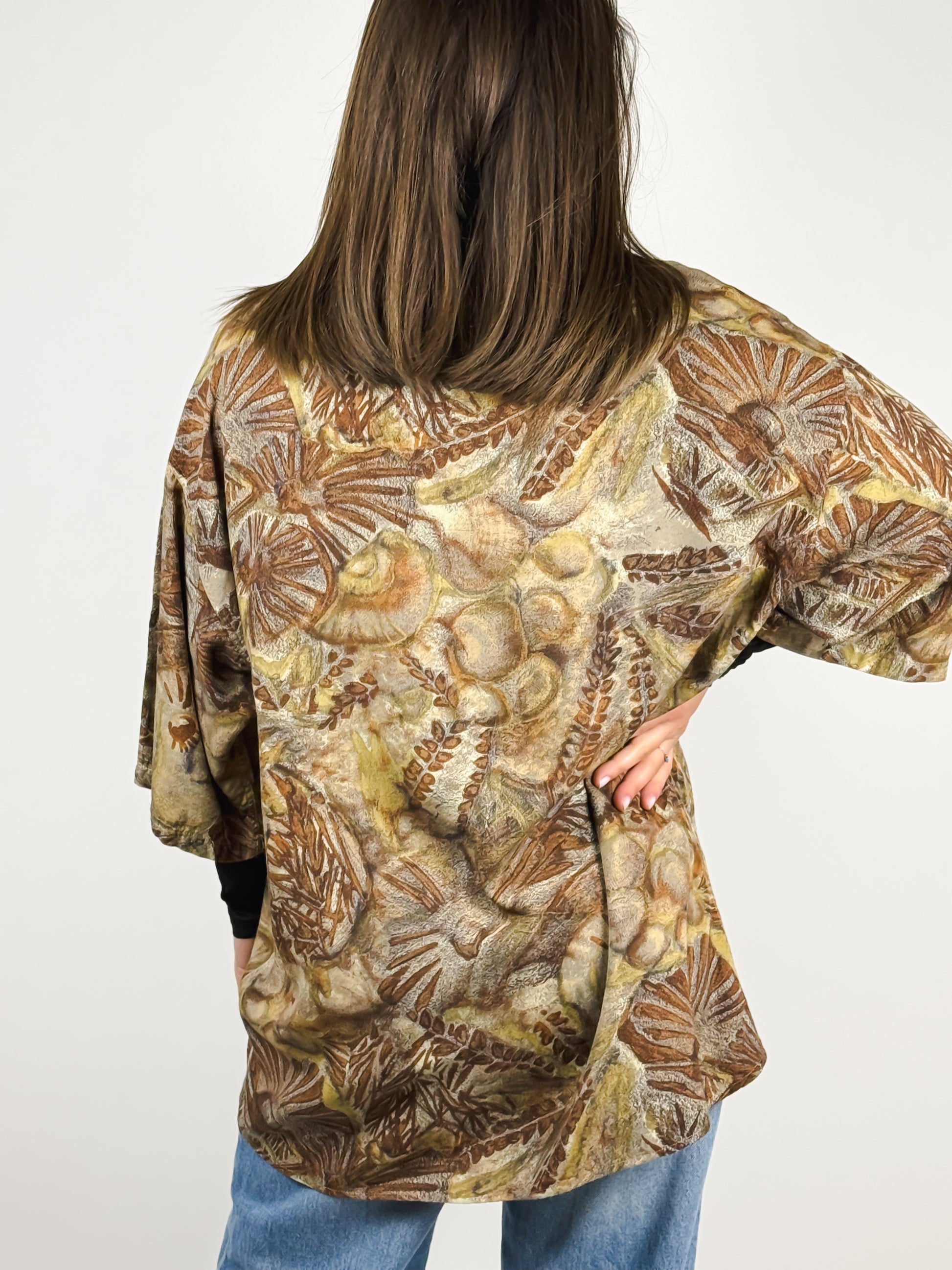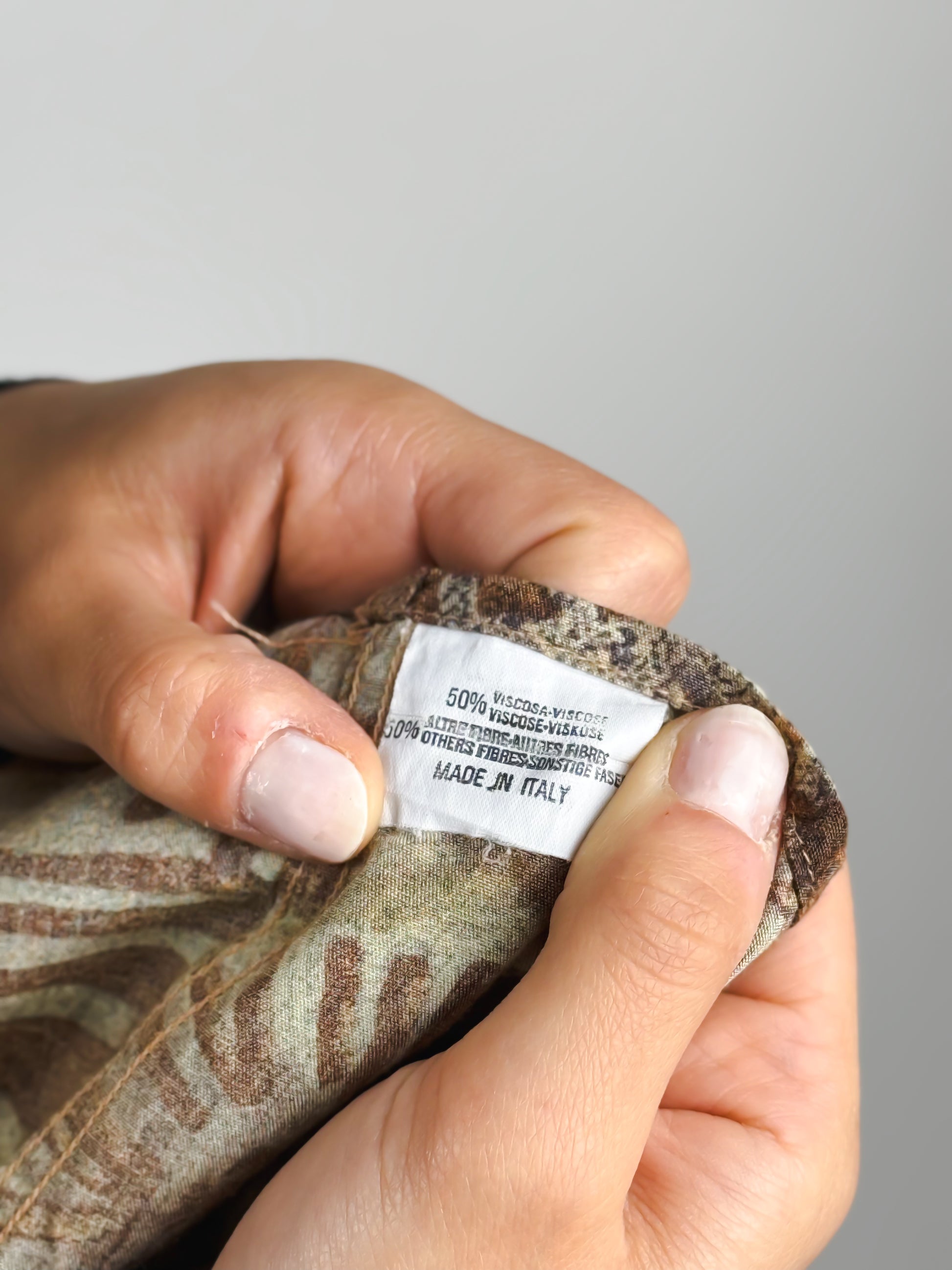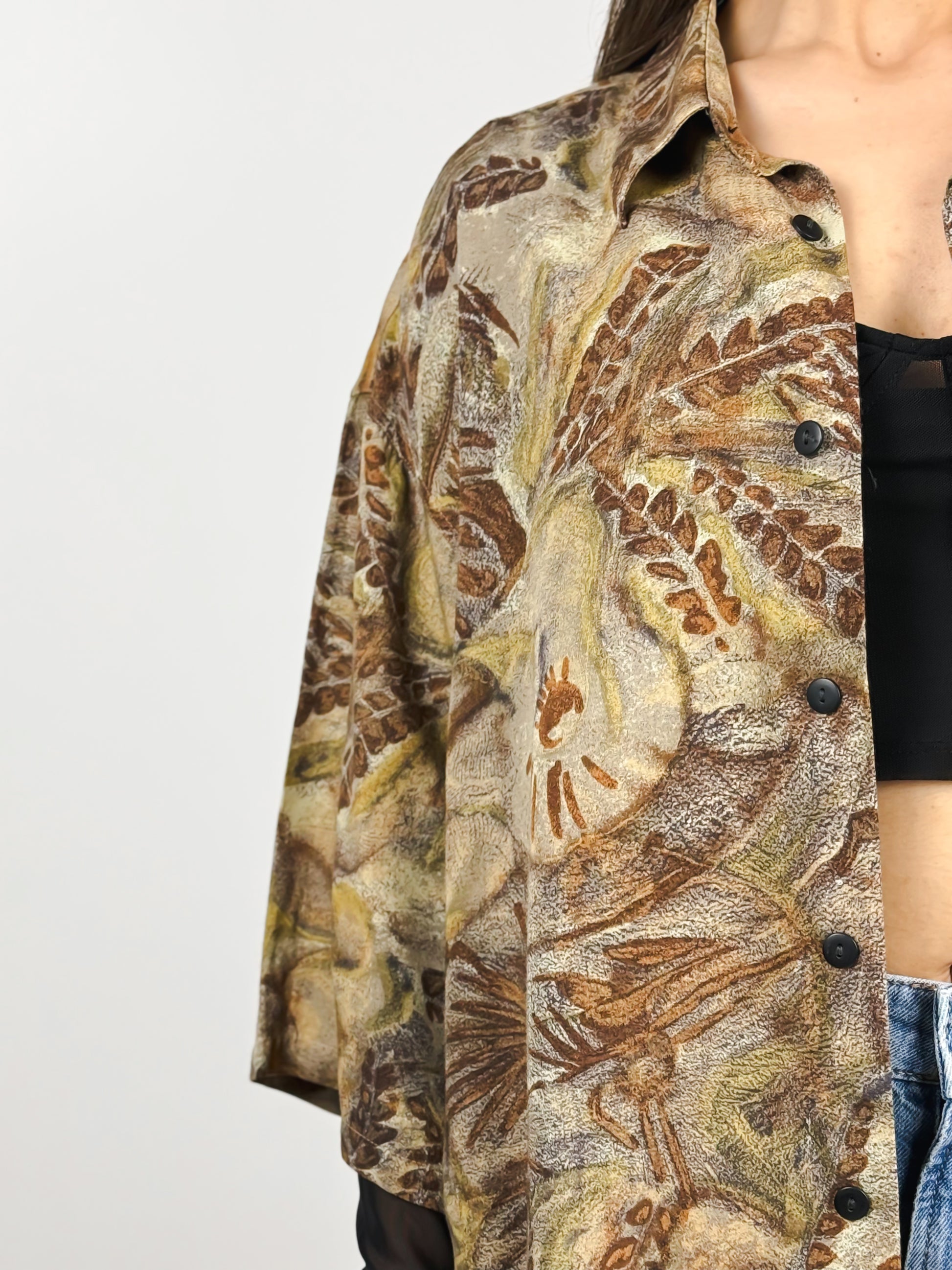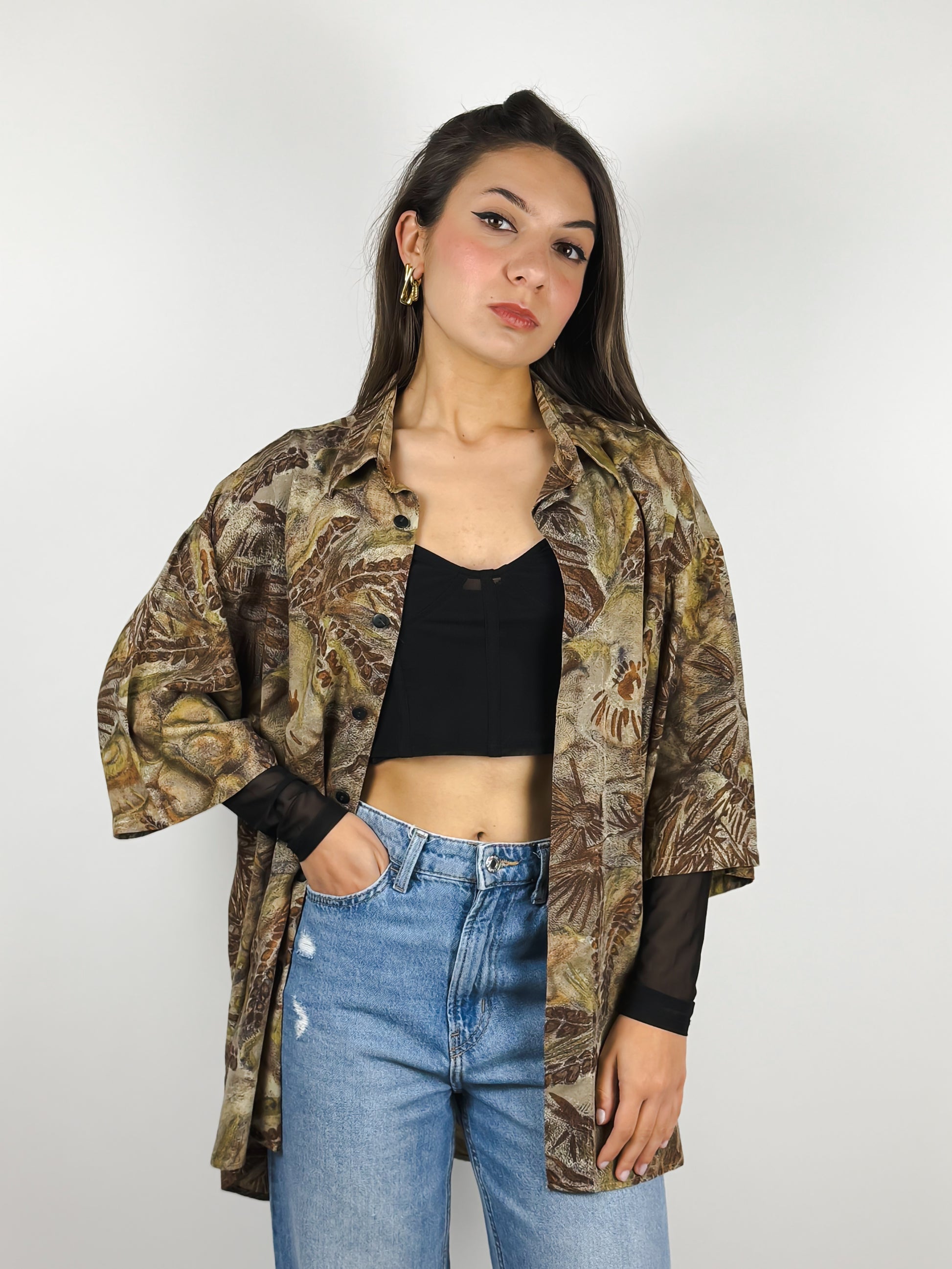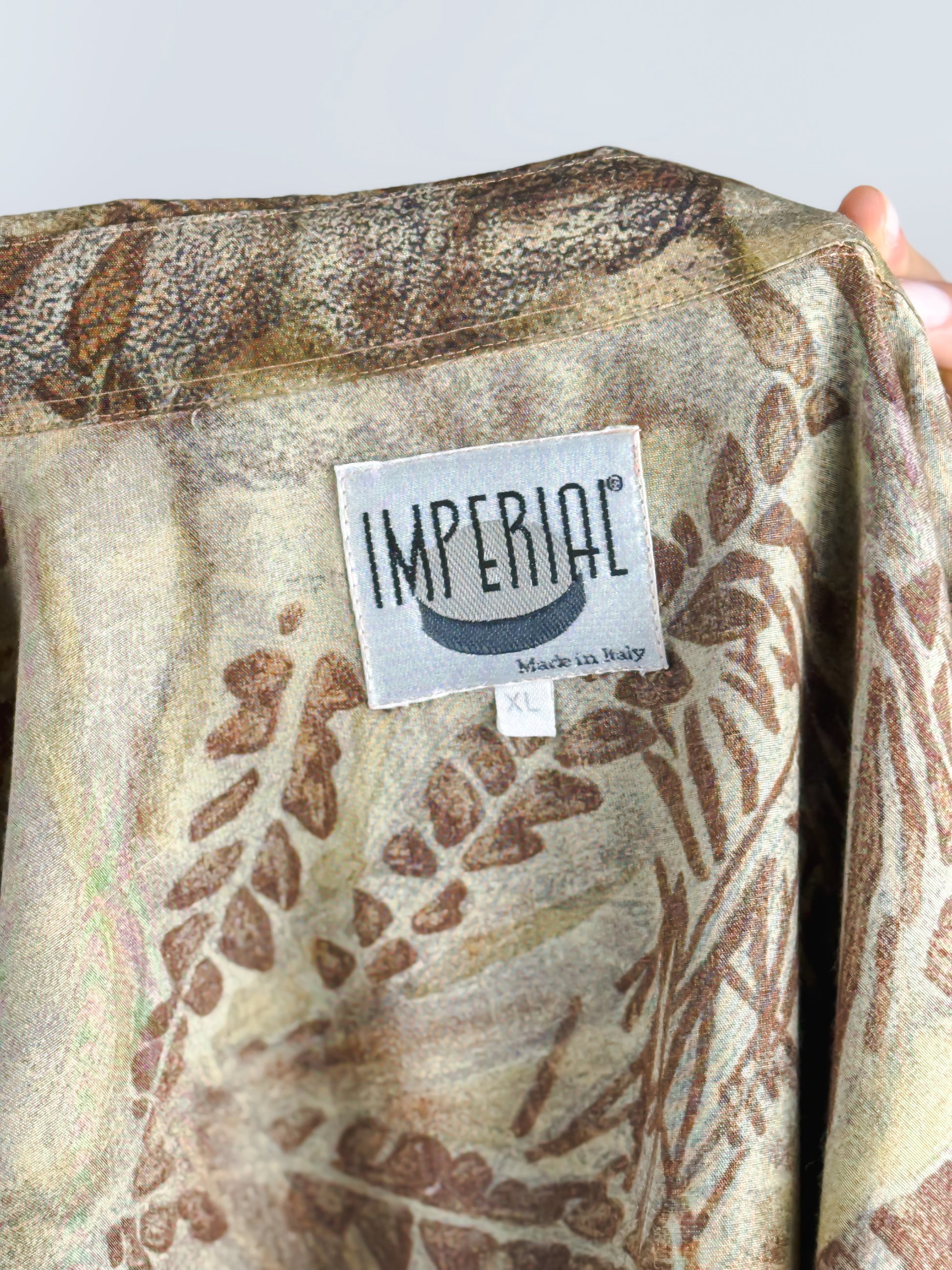 Camicia vintage anni '90 a mezze maniche firmata Imperial, Made in Italy, è un capo dal taglio maschile ma perfettamente indossabile anche in chiave unisex. Realizzata in morbida viscosa, è leggera e fresca, ideale per la stagione primavera/estate. La fantasia floreale nei toni marrone e verde militare richiama lo stile jungle o safari con un tocco sofisticato e anni ’90.