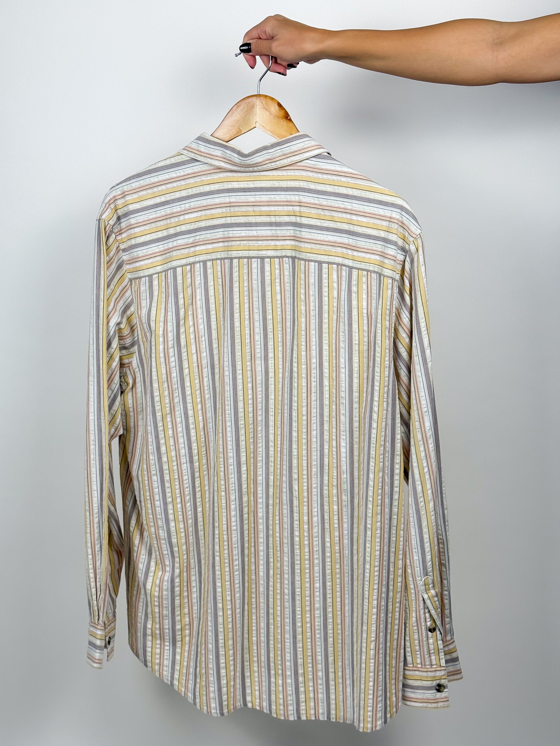 Camicia vintage Timberland da uomo in cotone leggero, con fantasia a righe verticali sui toni del beige, grigio e giallo. Modello classico con colletto tradizionale e chiusura frontale con bottoni. Logo ricamato sul petto. Vestibilità comoda.