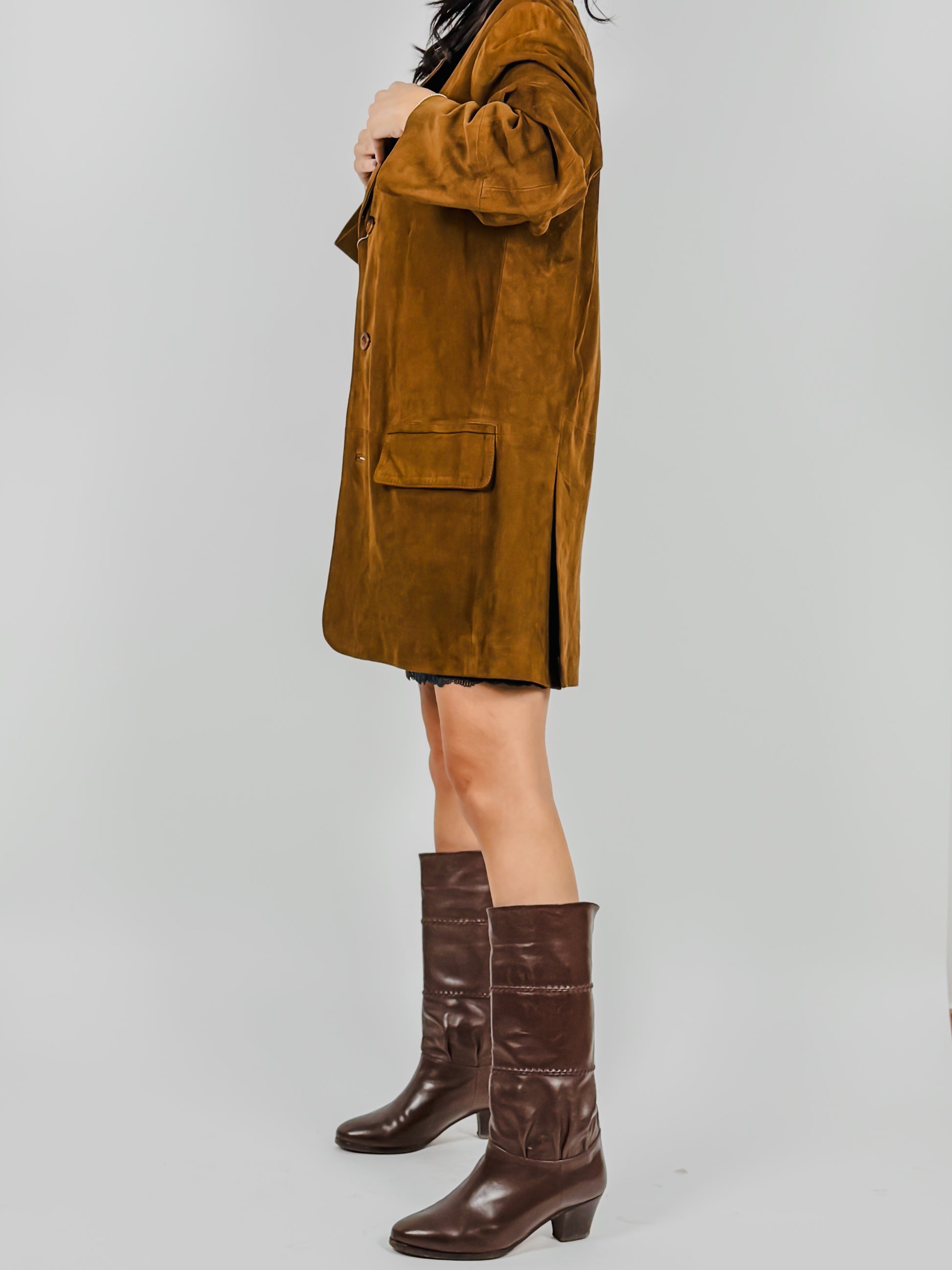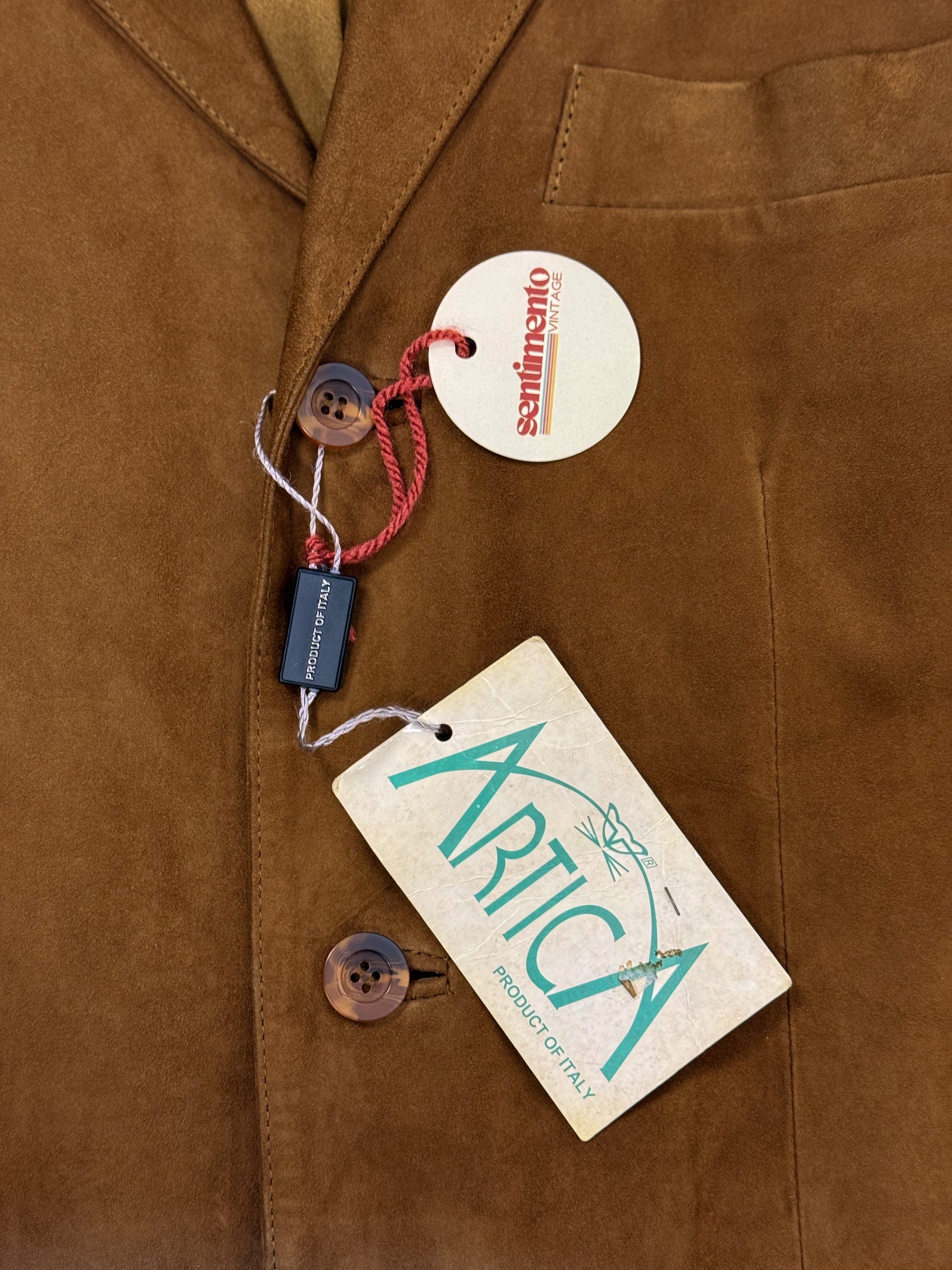 Suede jacket made in Italy, still with original label and spare buttons. Single-breasted, with 3 buttons, two side pockets and a breast pocket. Excellent workmanship, very soft, fully lined, has two back vents.