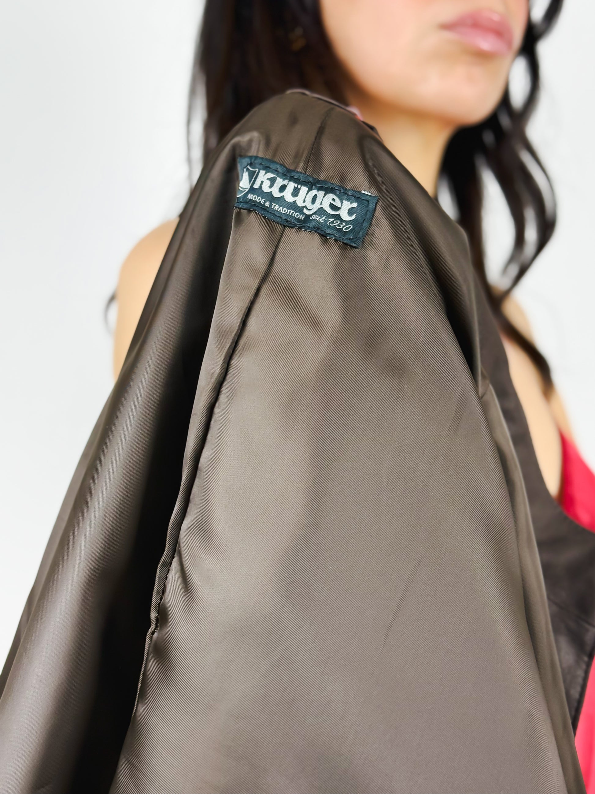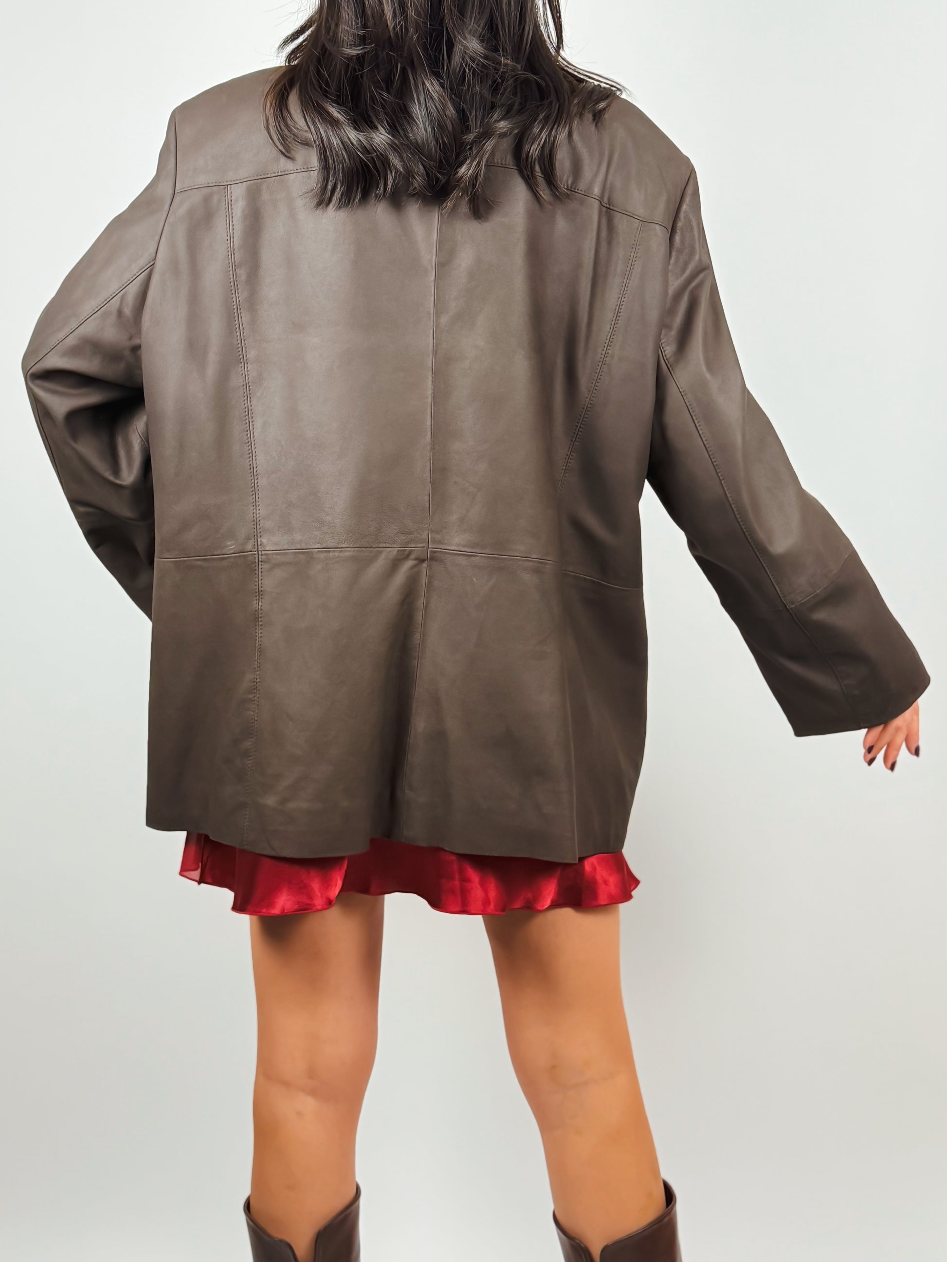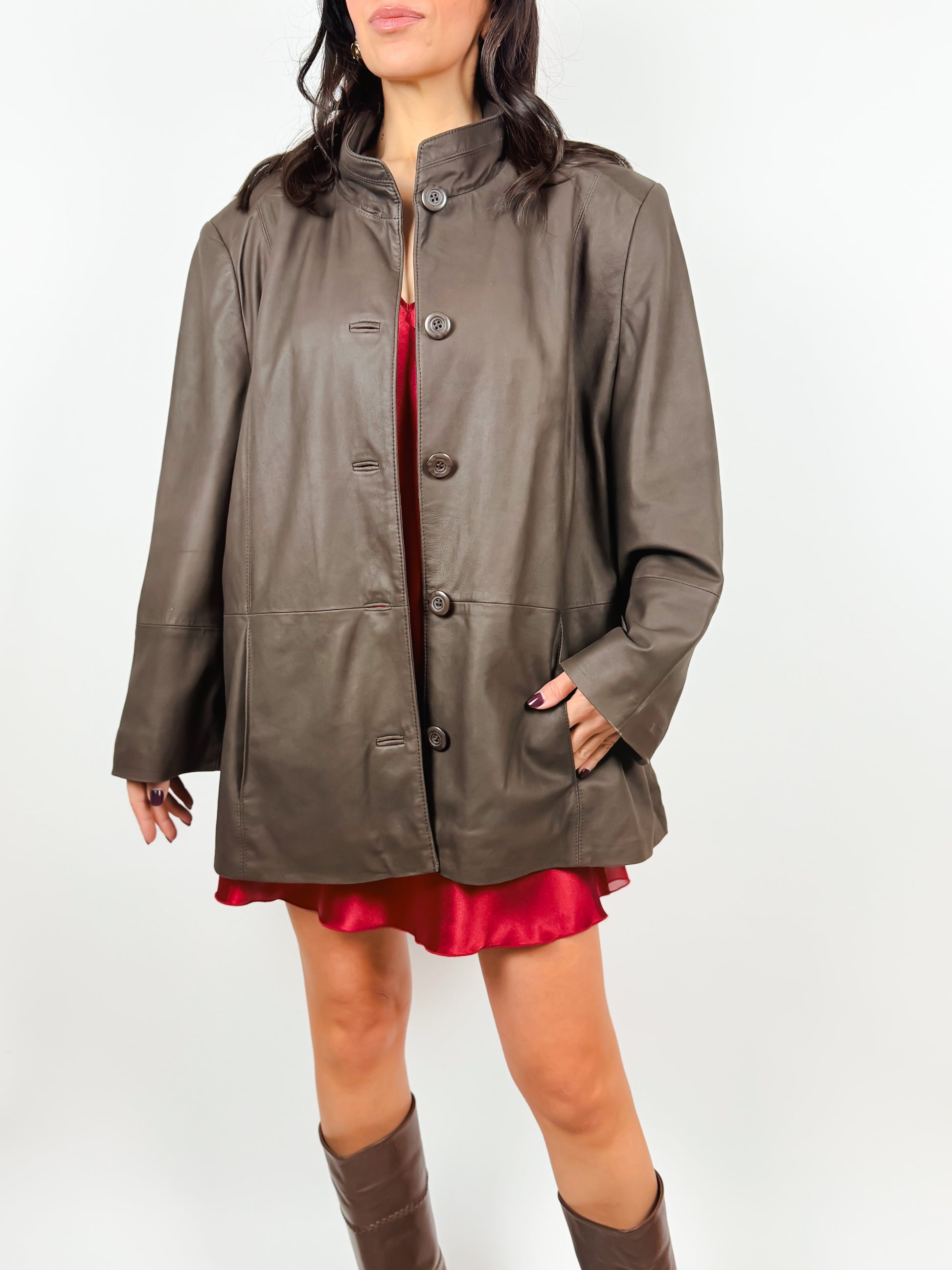 Brown nappa leather jacket, genuine leather. Straight and clean line, mandarin collar, front closure with buttons and two side welt pockets. Padded shoulders. Excellent condition, except for some signs of aging due to the quality of the very delicate leather.