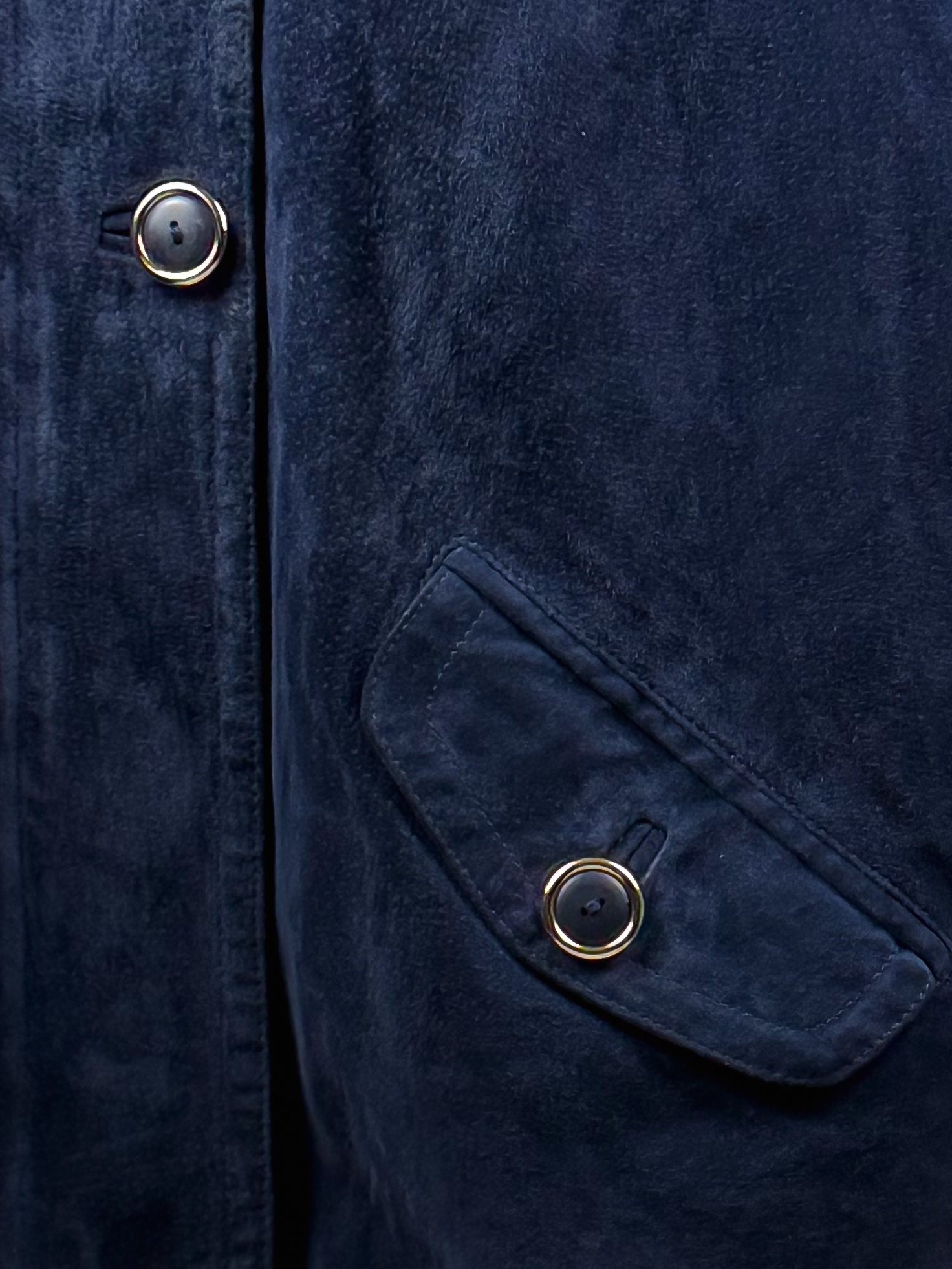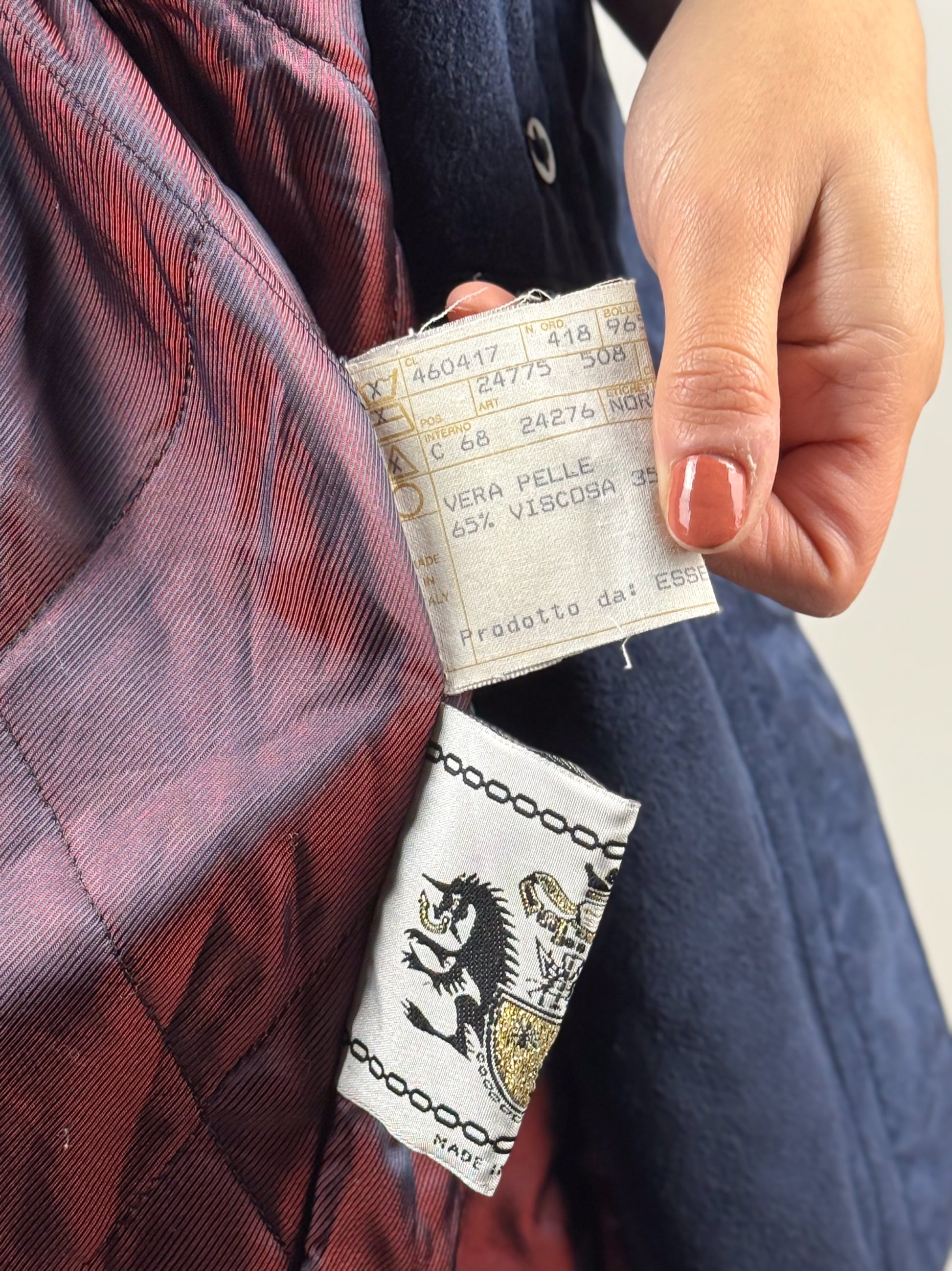 Giubbotto vintage in vera pelle scamosciata blu. Modello anni ’80 dalla linea morbida, presenta una chiusura frontale con grandi bottoni , tasche con pattina e dettagli dorati. Il cappuccio è impreziosito da inserti di pelliccia sintetica. Interno foderato e trapuntato. Un capo di alta qualità, Made in Italy.