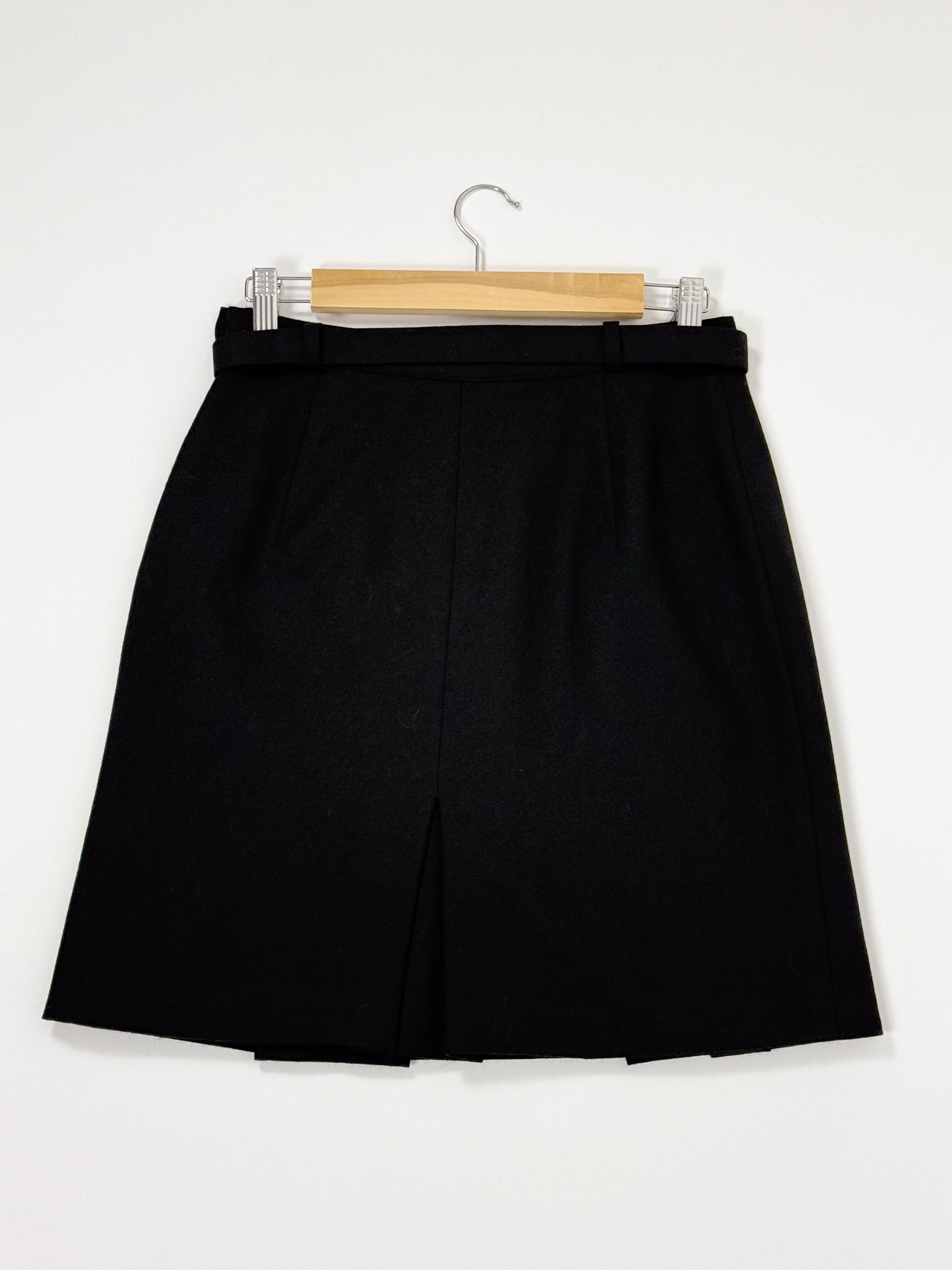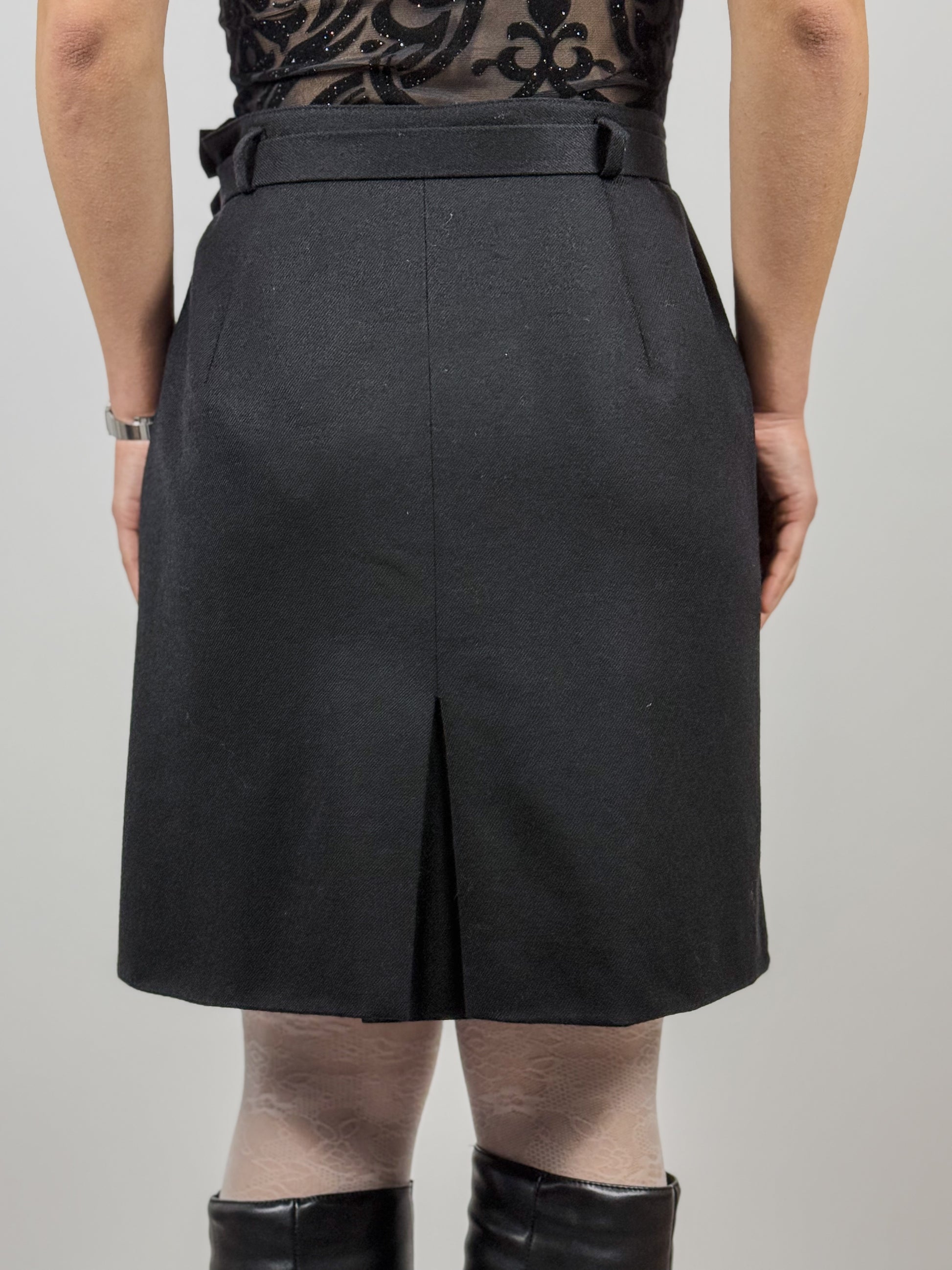 Black Galleria skirt in pure virgin wool Made in Italy. Excellent workmanship, fully lined. Detail of the adjustable wool belt at the waist. Side closure with button and zip.