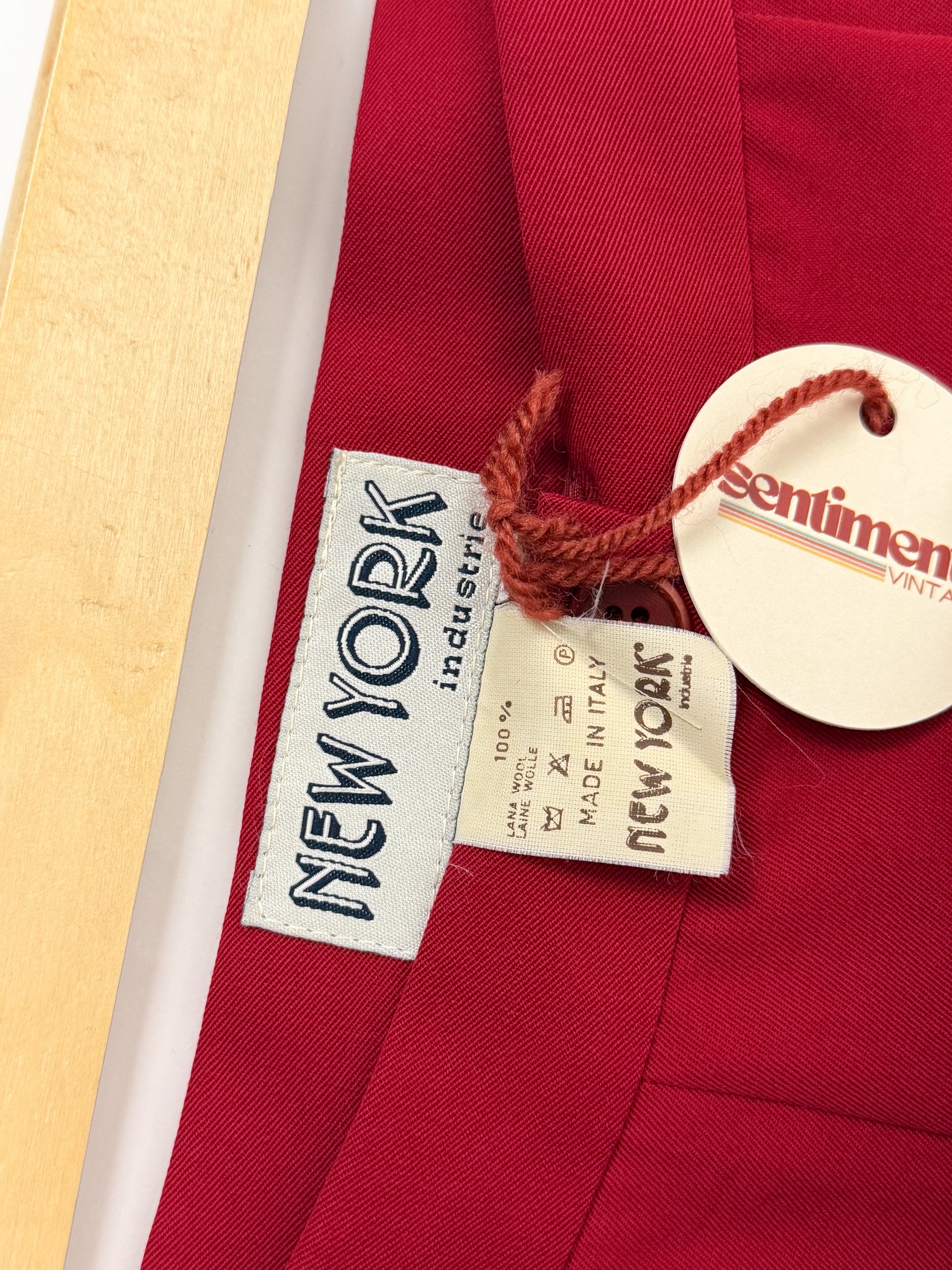 Red miniskirt in fresh wool from the 70s, straight and clean line with pleats. Back closure with hidden zip and presence of internal lining. Made in Italy.