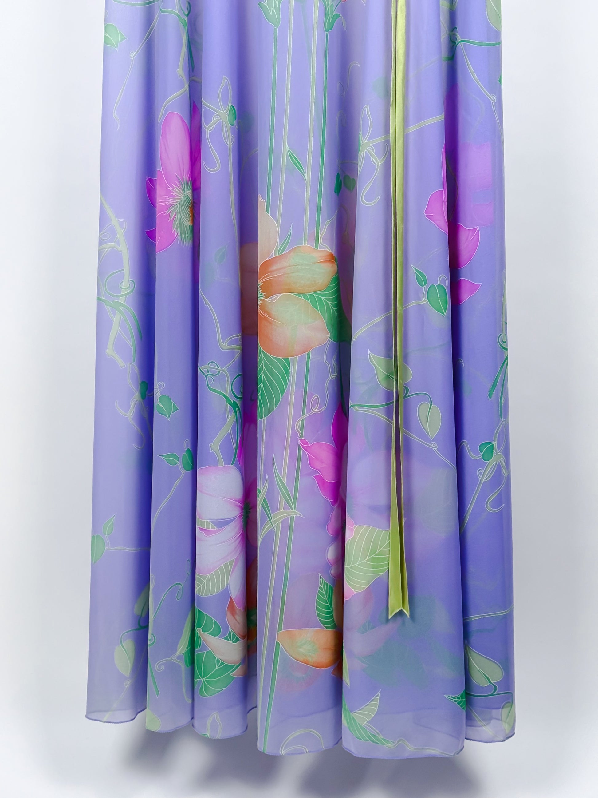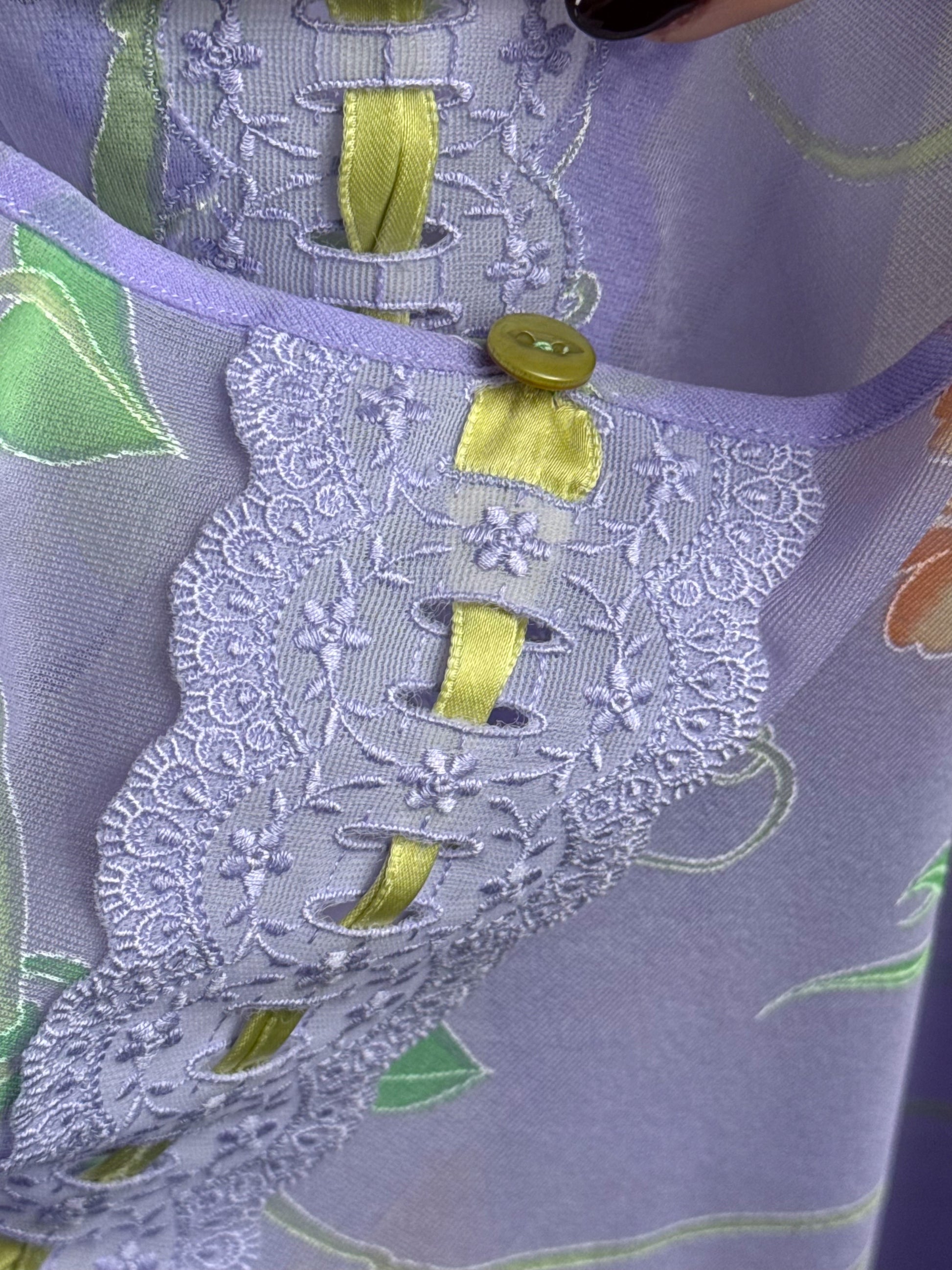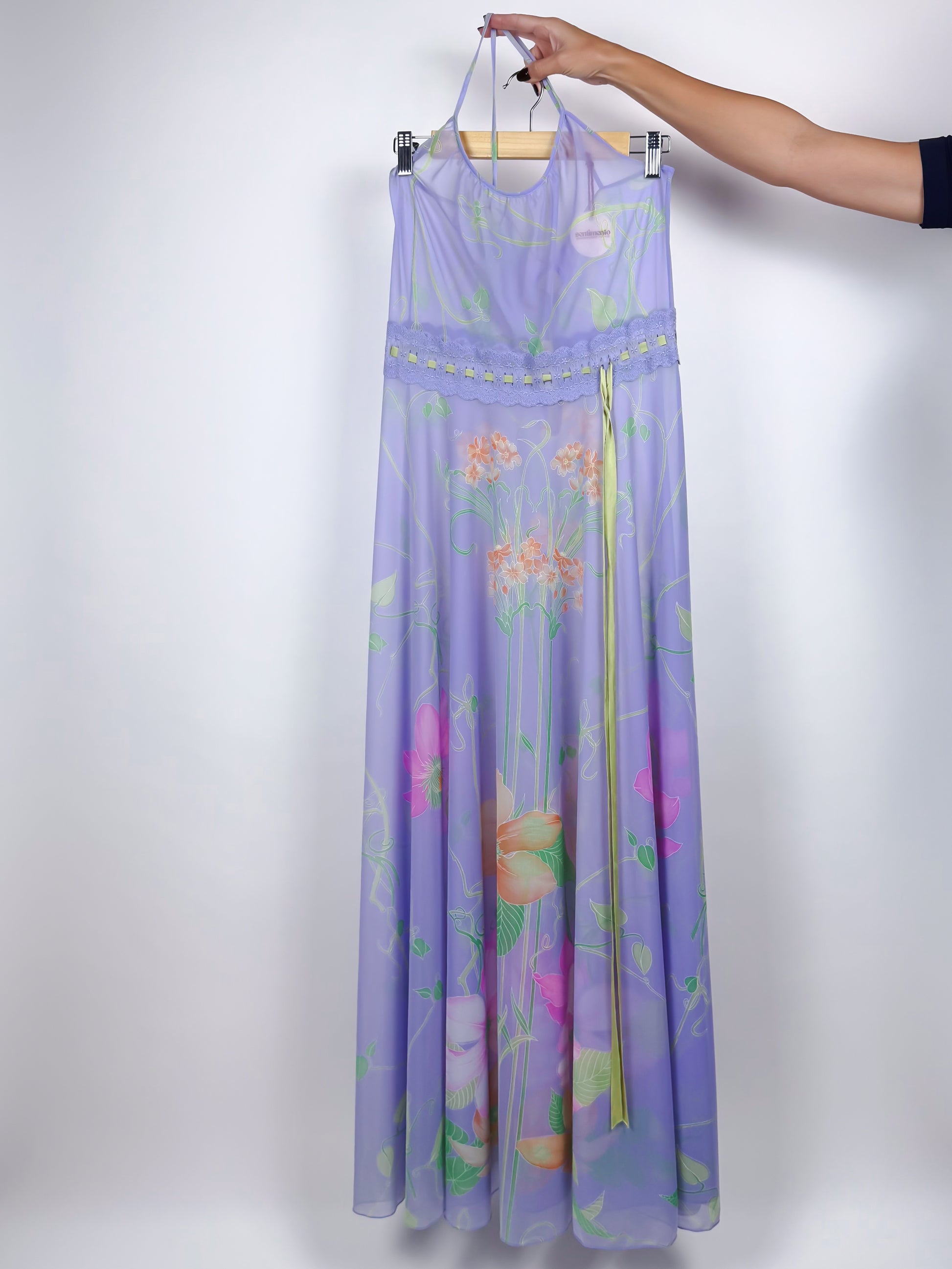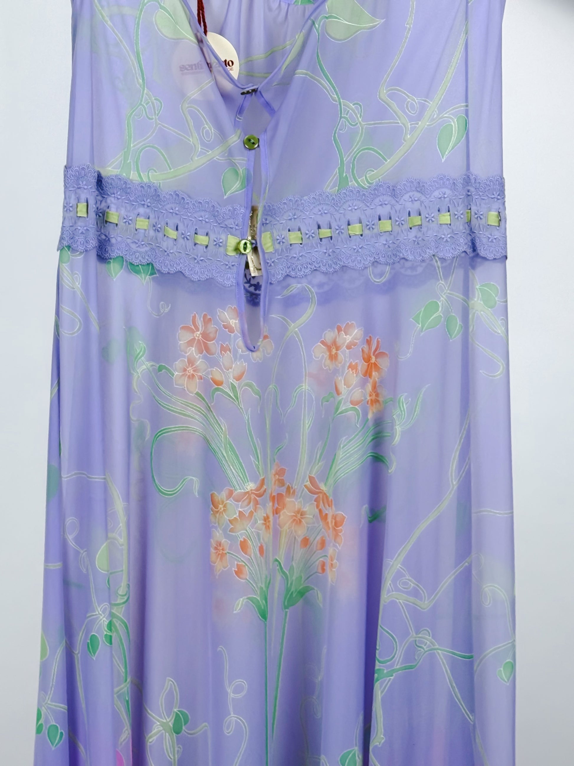 Abito sottoveste lungo vintage La Perla Lingerie in leggero chiffon lilla con stampa floreale multicolore. Il modello presenta sottili bretelline, vita valorizzata da fascia in pizzo con nastro decorativo e linea fluida che cade morbida e semitrasparente fino al fondo. Chiusura sul retro con bottoni. Un capo raffinato e romantico, perfetto come lingerie d’autore o come abito da sera dallo stile sensuale e sofisticato.