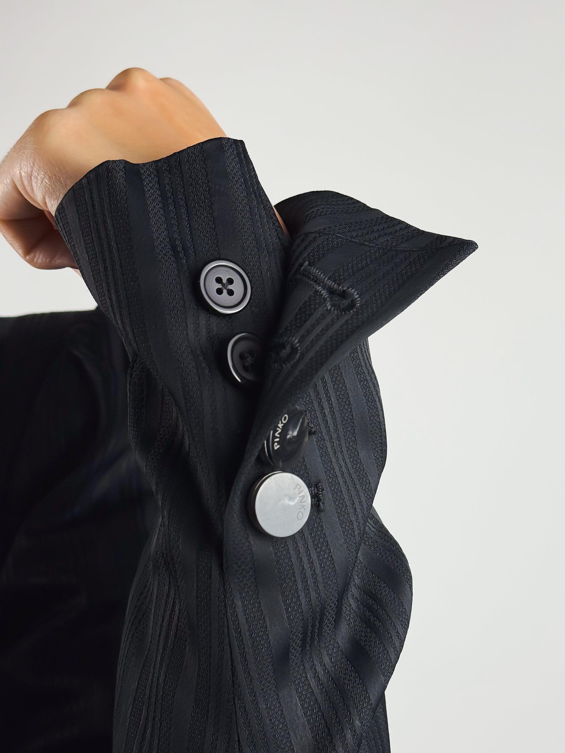 Blazer vintage Pinko anni 2000, realizzato in tessuto nero lucido con lavorazione a righe tono su tono. Modello strutturato e aderente, tipico dello stile Y2K, chiusura frontale a due bottoni e taschine con pattina. Le maniche lunghe presentano una fila di piccoli bottoni decorativi sul polso. Made in Italy.