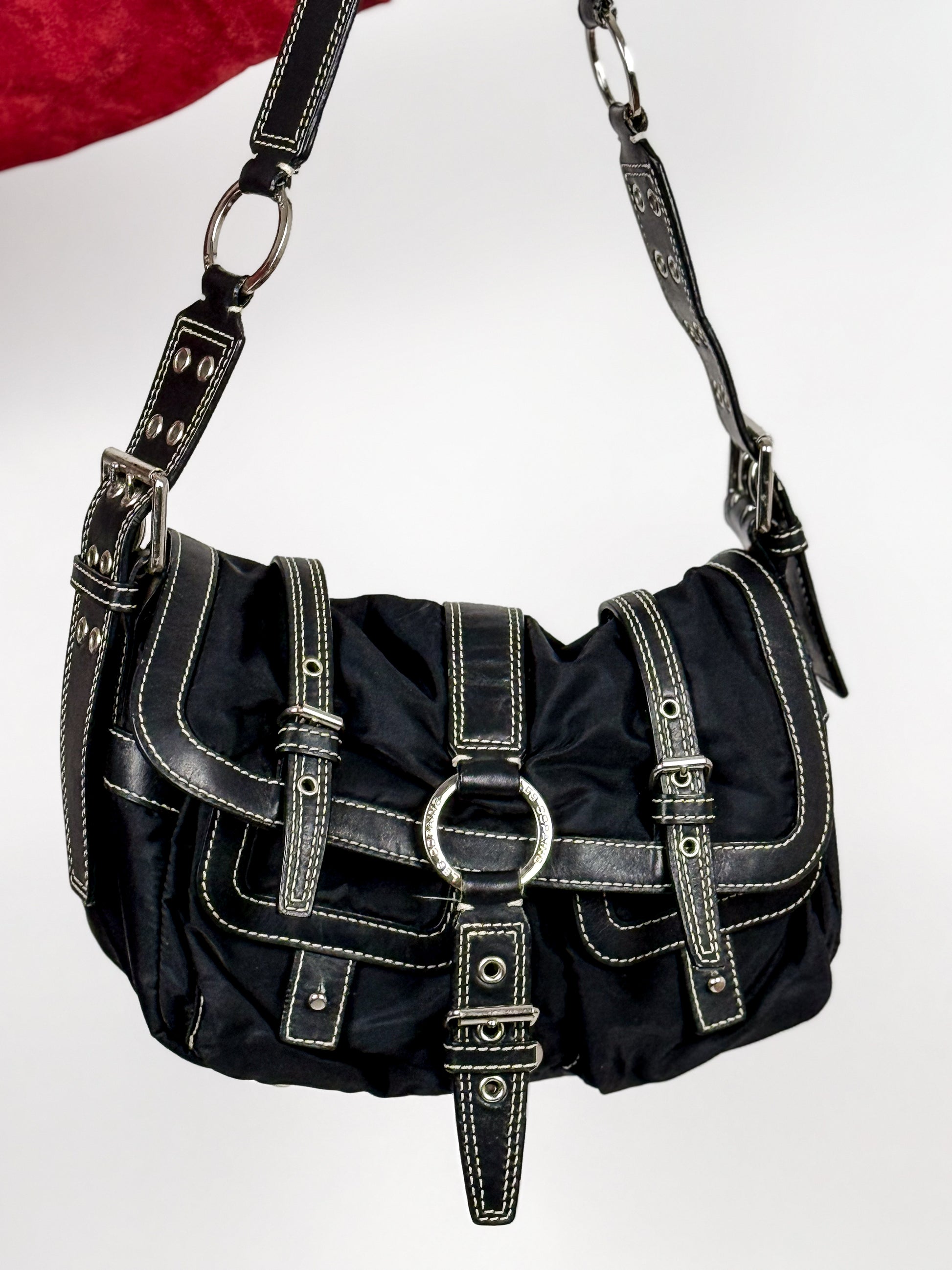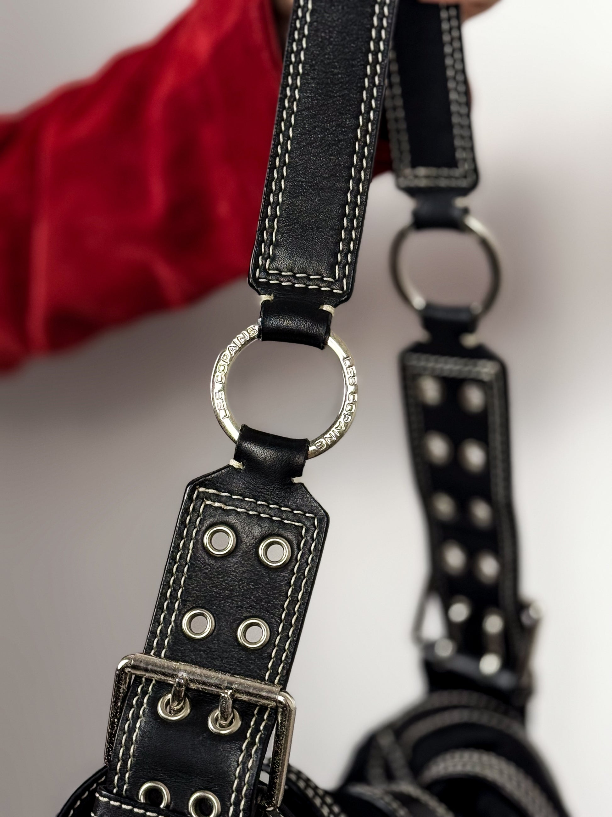 Borsa Y2K Les Copains nera con cuciture bianche e fibbie e borchie argentate. Tessuto impermeabile con inserti in pelle. Lunghezza del manico regolabile e chiusura a clip.