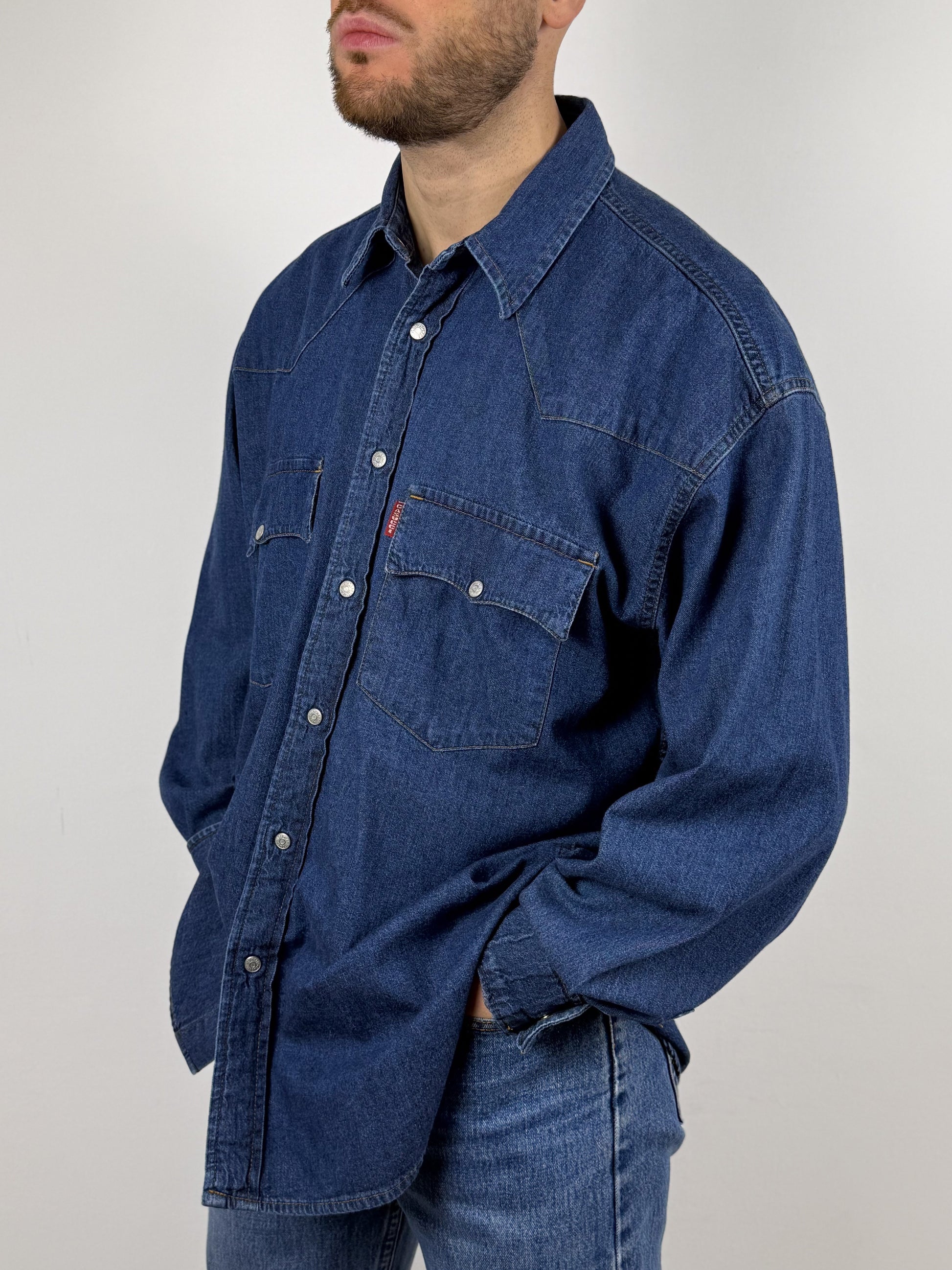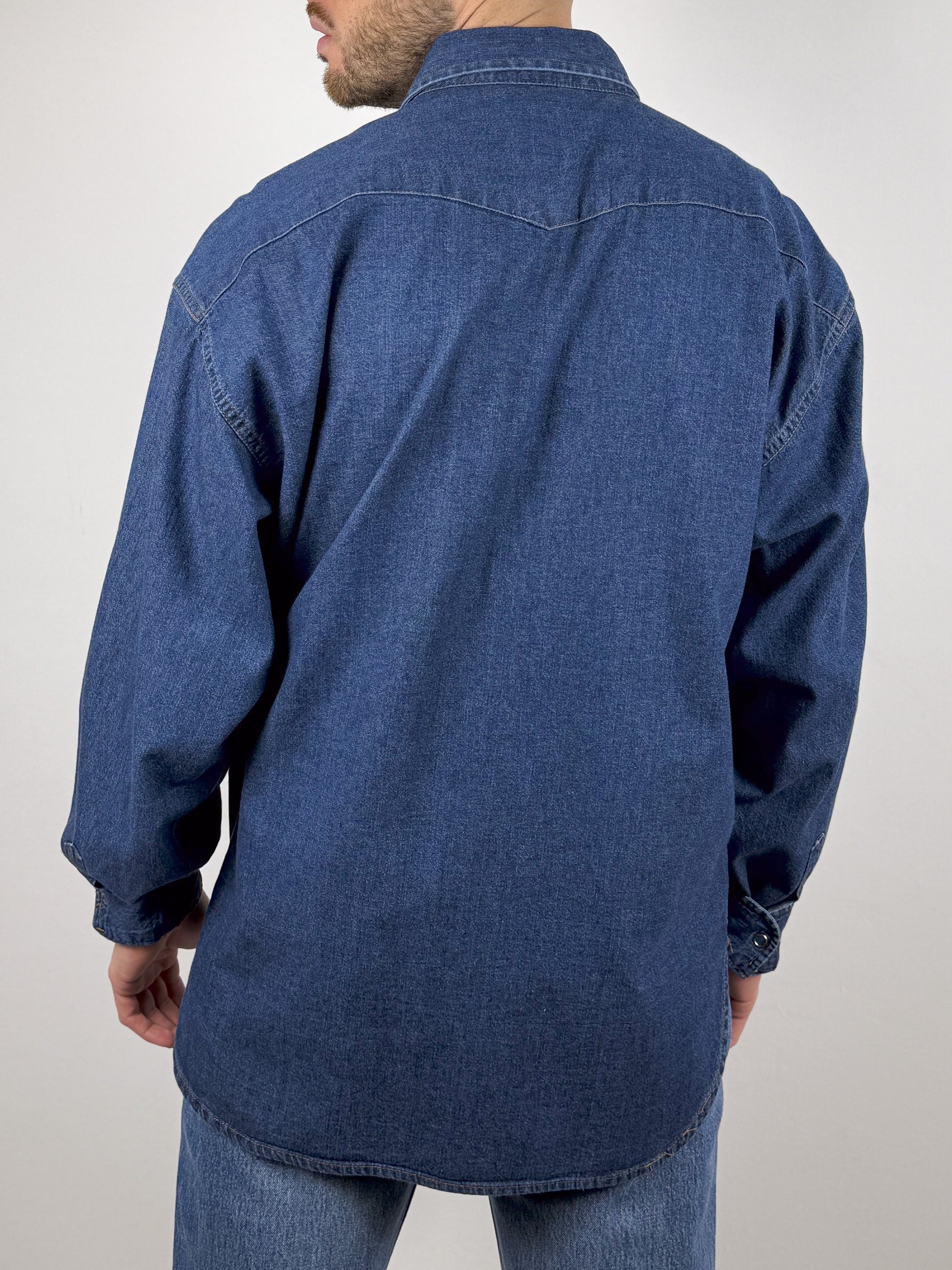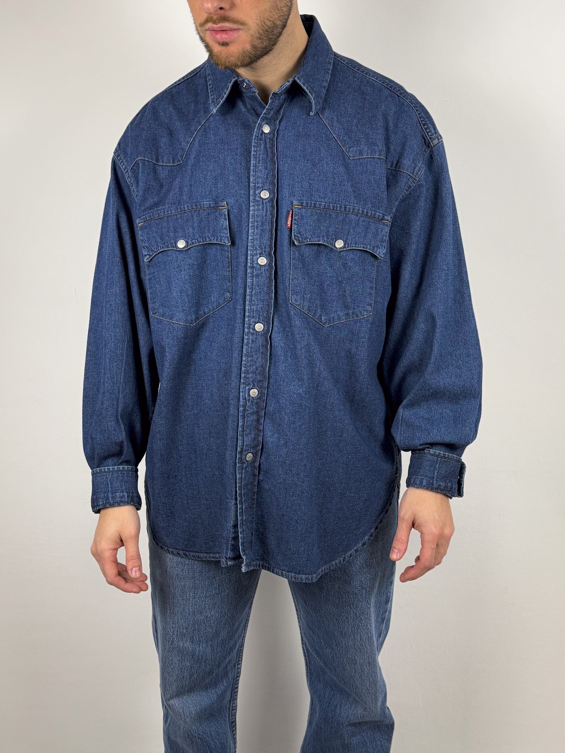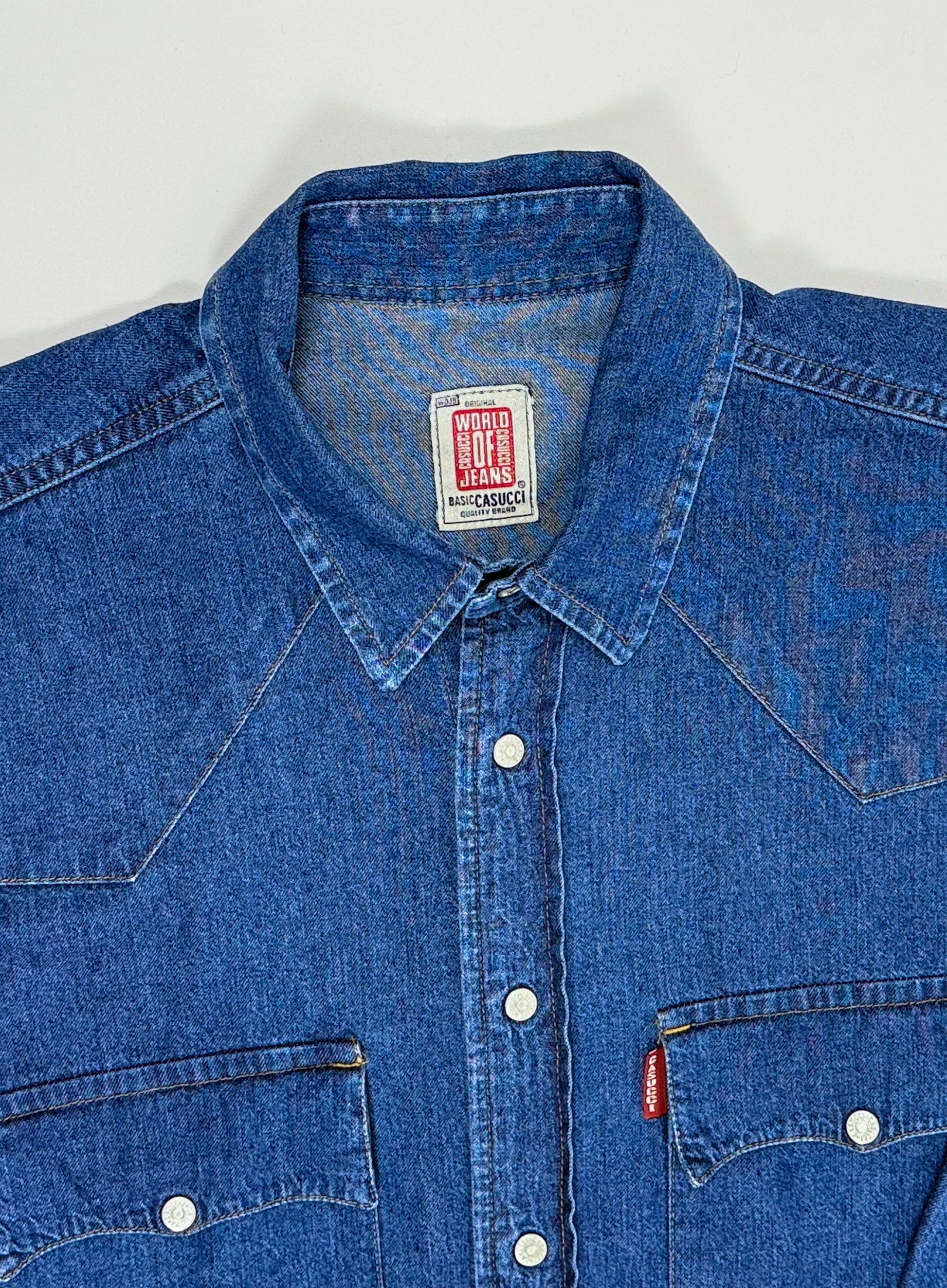 Chemise en jean foncé, Casucci Made in Italy. Modèle classique à manches longues, boutons pression logo et poches poitrine.