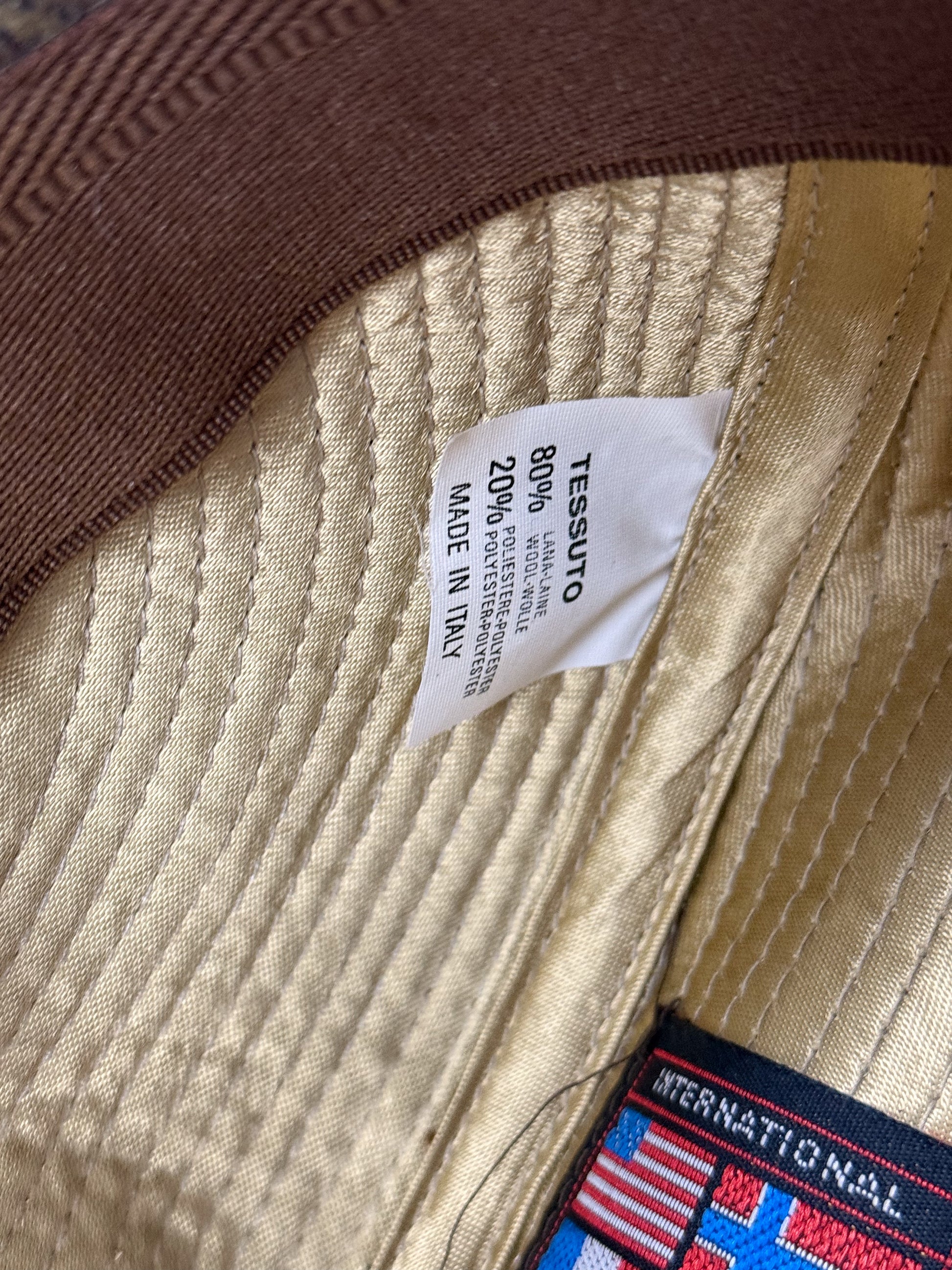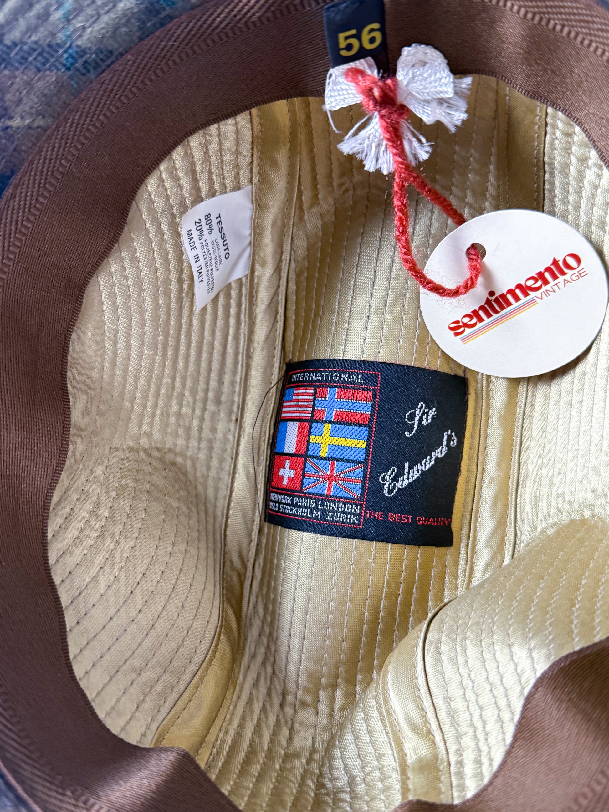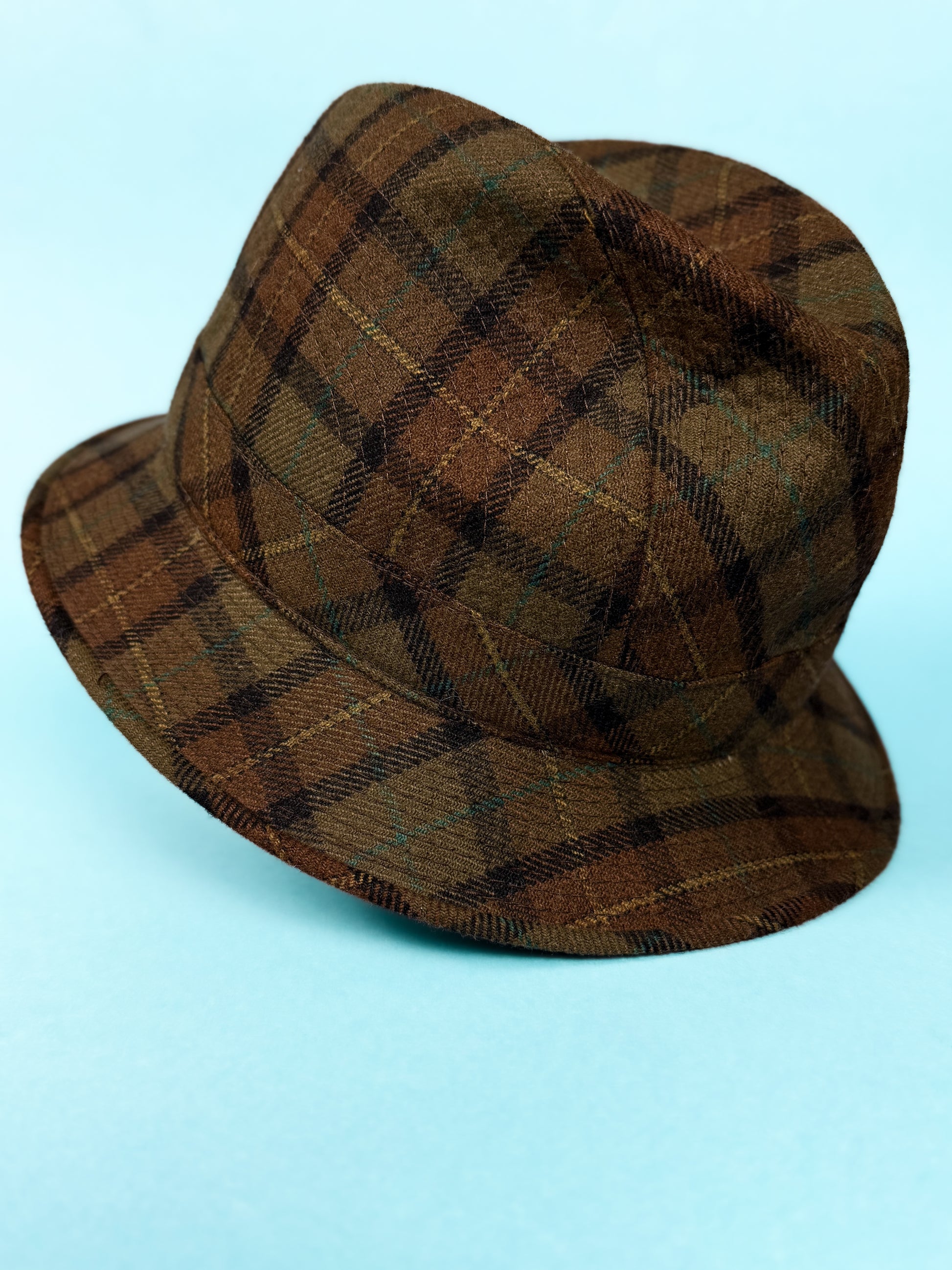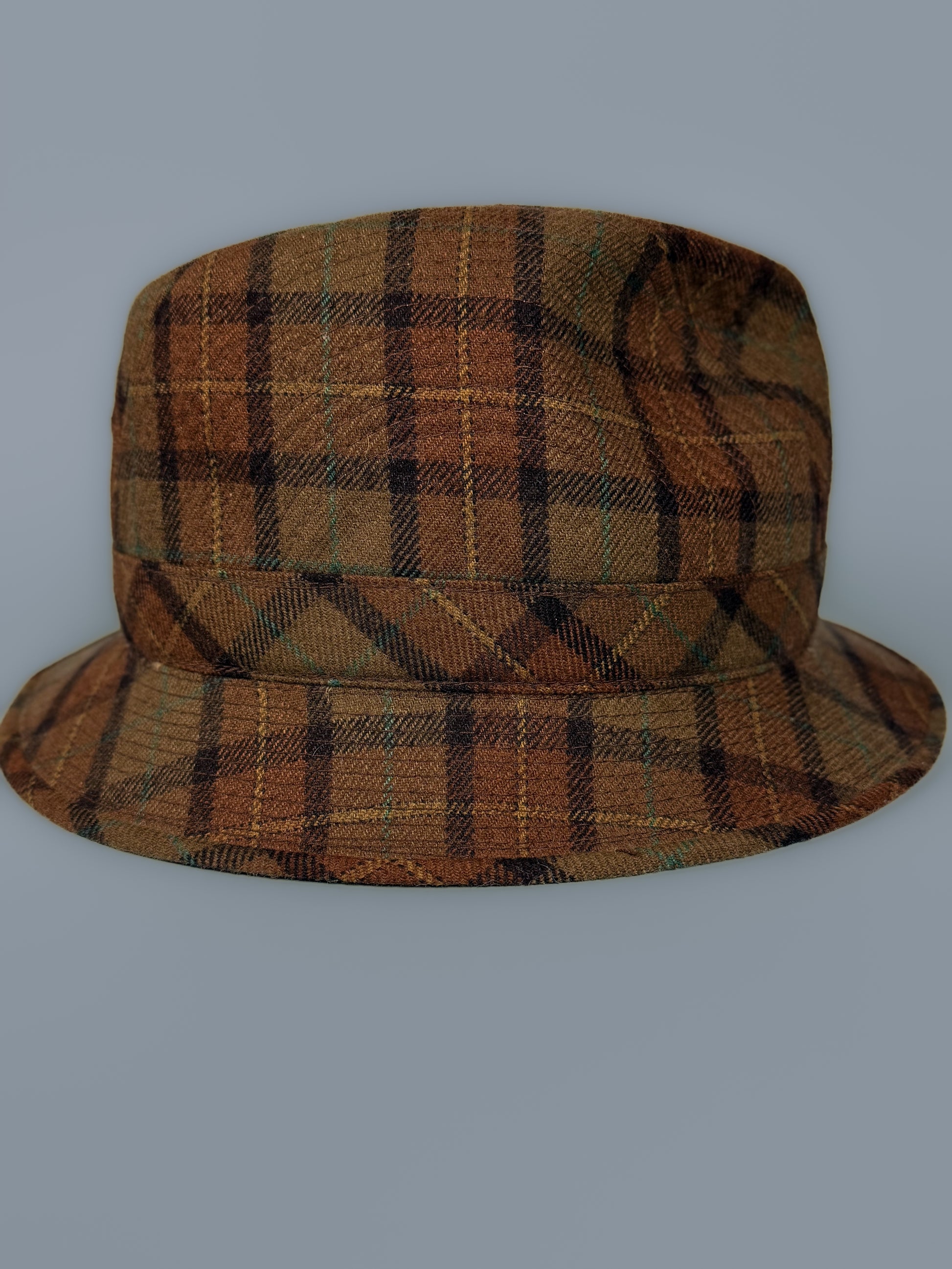 Cappello in misto lana, Made in Italy. Fantasia tartan verde militare e marrone. Fodera di rivestimento interna.