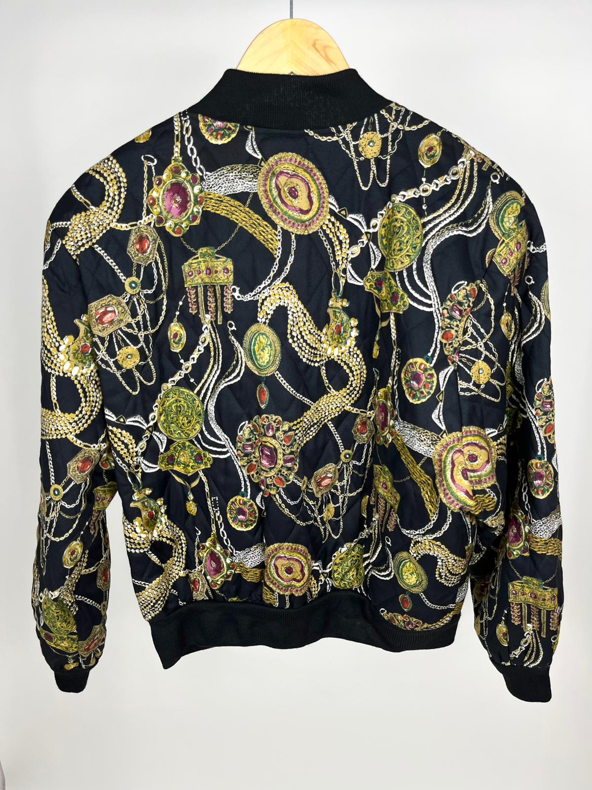 Giubbotto vintage, databile tra la fine degli anni ’80 e i primi anni ’90, caratterizzato da una ricca fantasia barocca ispirata ai gioielli, con catene, pendenti e dettagli ornamentali multicolor su fondo nero.
