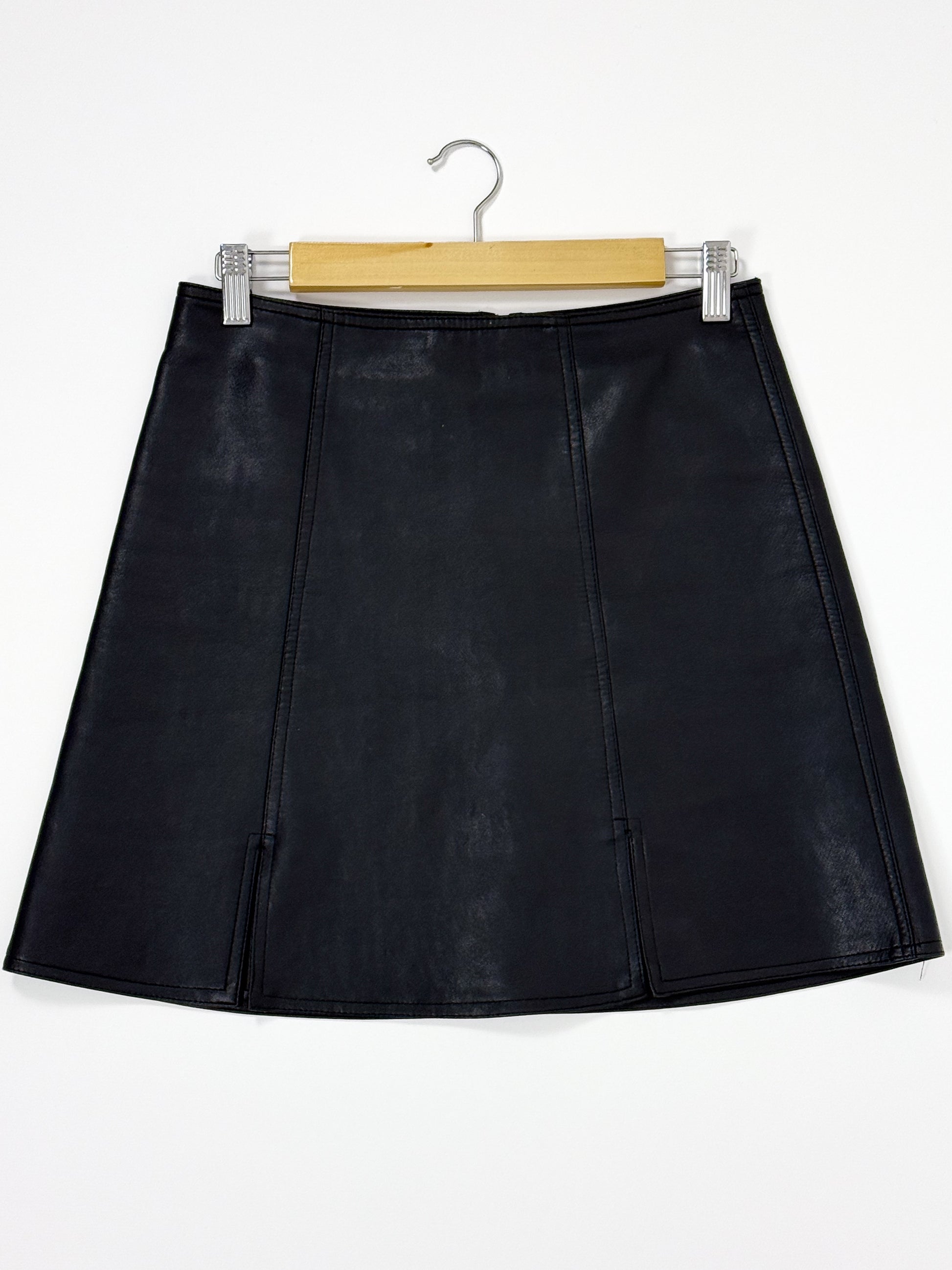 Jupe en cuir noir, avec deux fentes devant et fermeture zippée au dos. Légèrement évasé, avec doublure intérieure. La peau est douce et confortable