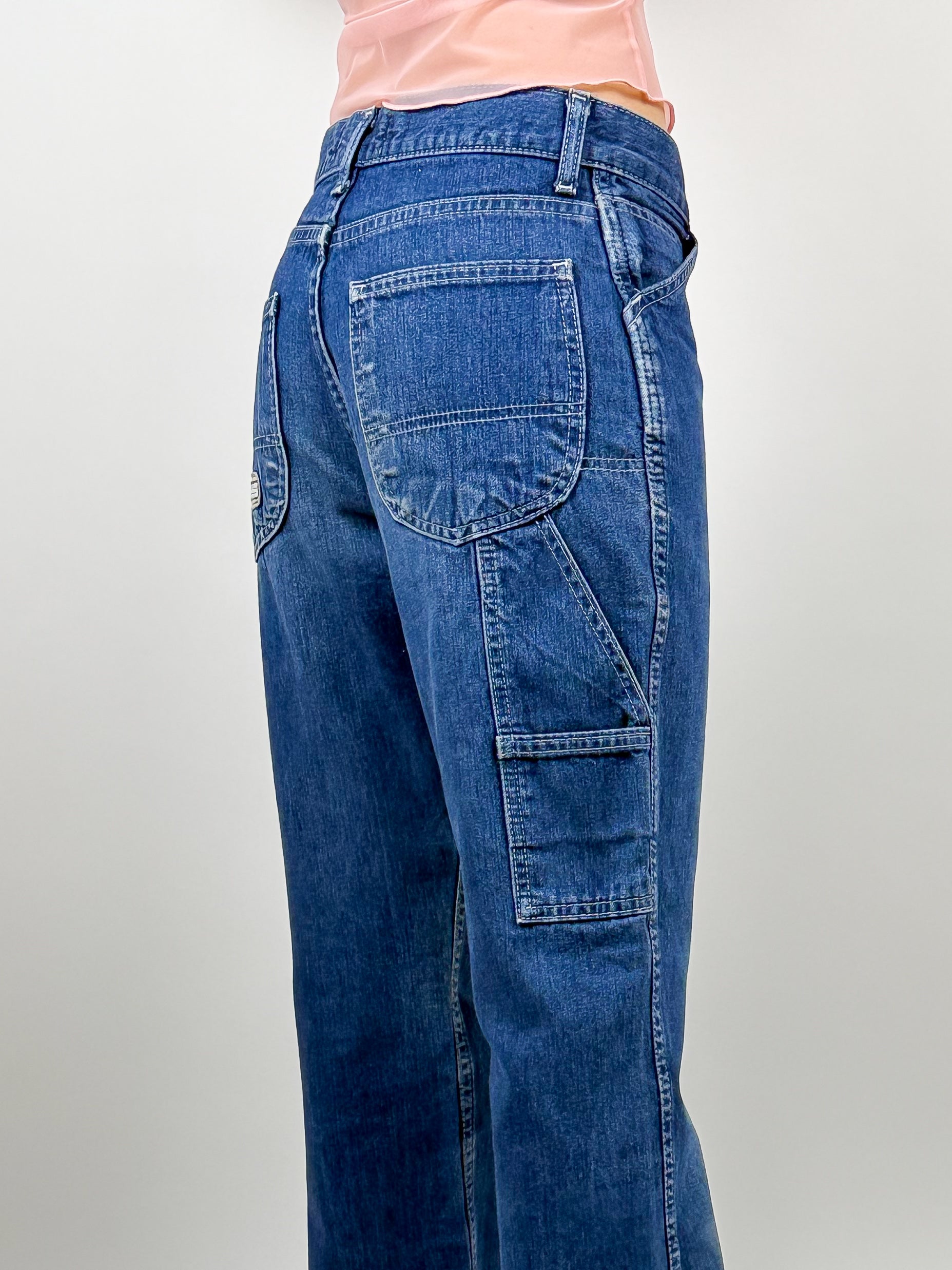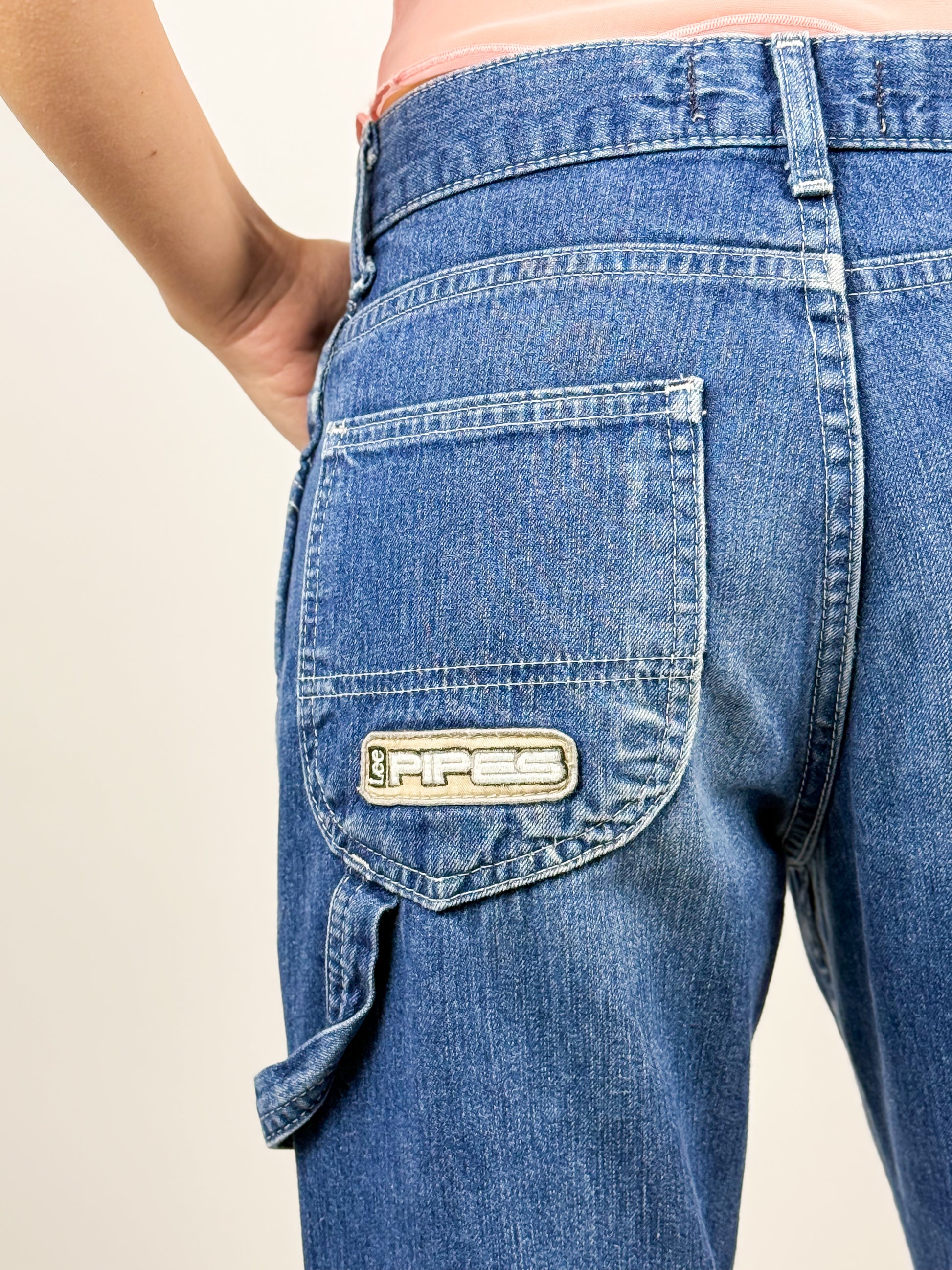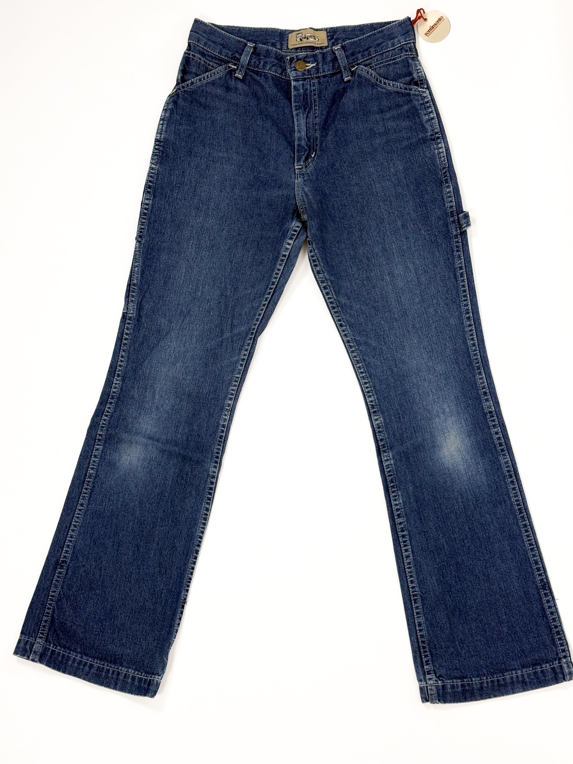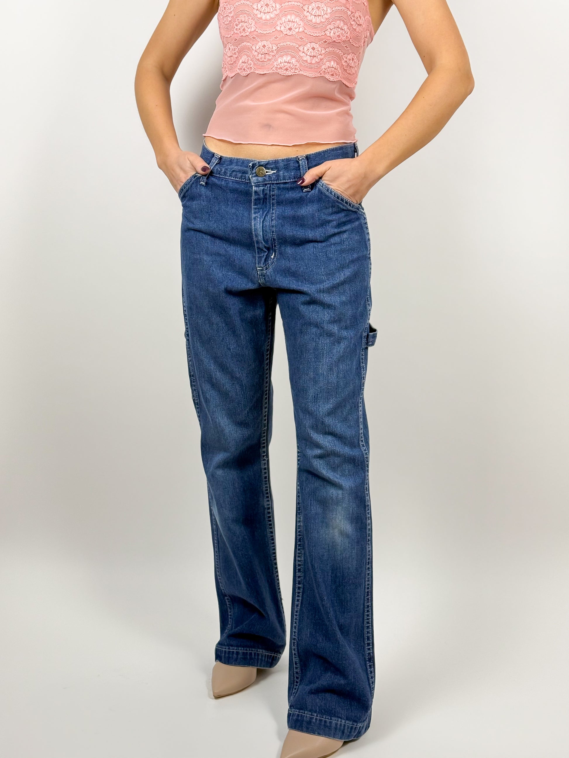 Jean évasé Lee Pipes Carpenter des années 90 avec logo sur la poche arrière. Modèle iconique avec passant pour marteau et poche à outils. Coupe régulière et droite, délavage moyen avec surpiqûres blanches. Fermeture zippée et bouton logo.