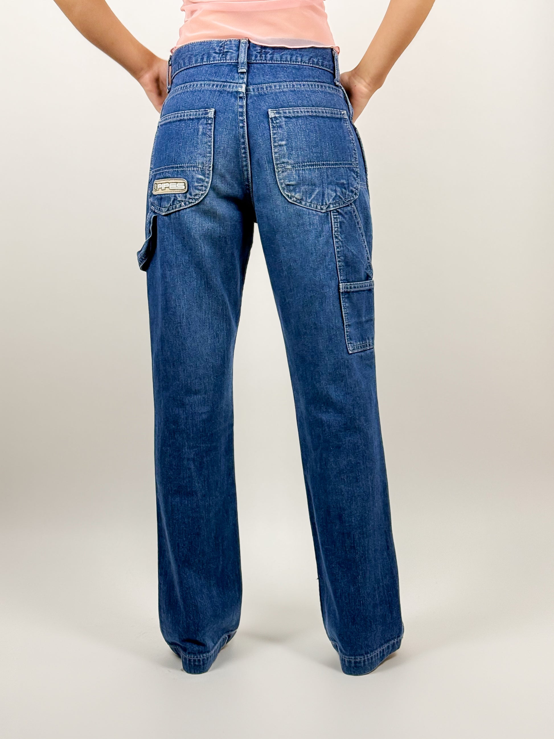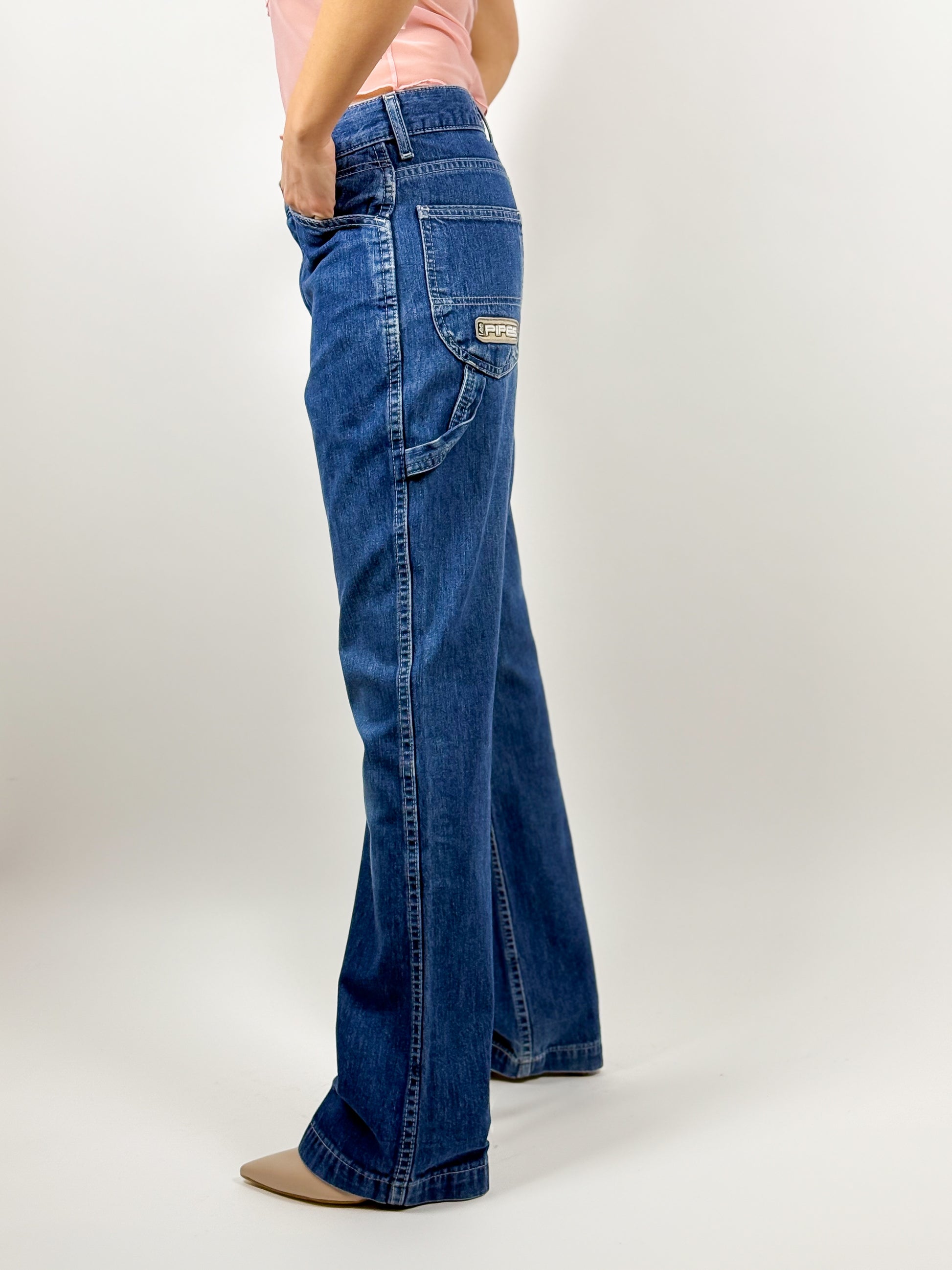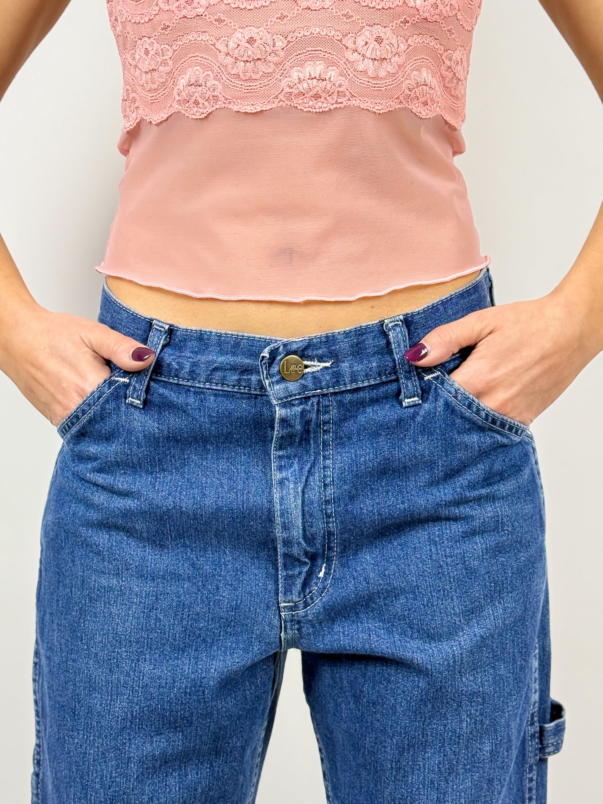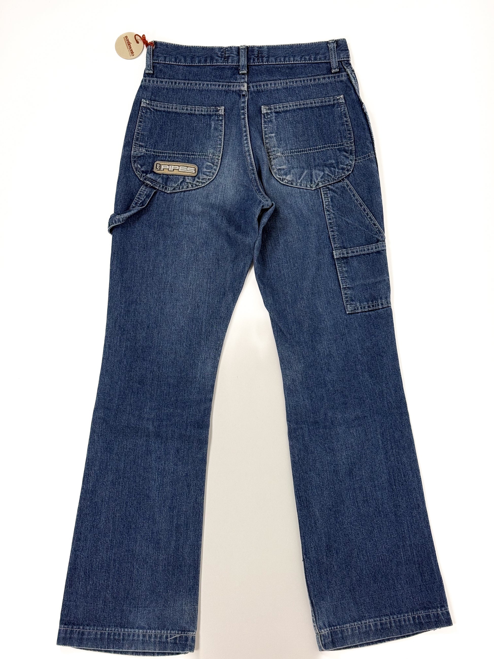 Jean évasé Lee Pipes Carpenter des années 90 avec logo sur la poche arrière. Modèle iconique avec passant pour marteau et poche à outils. Coupe régulière et droite, délavage moyen avec surpiqûres blanches. Fermeture zippée et bouton logo.