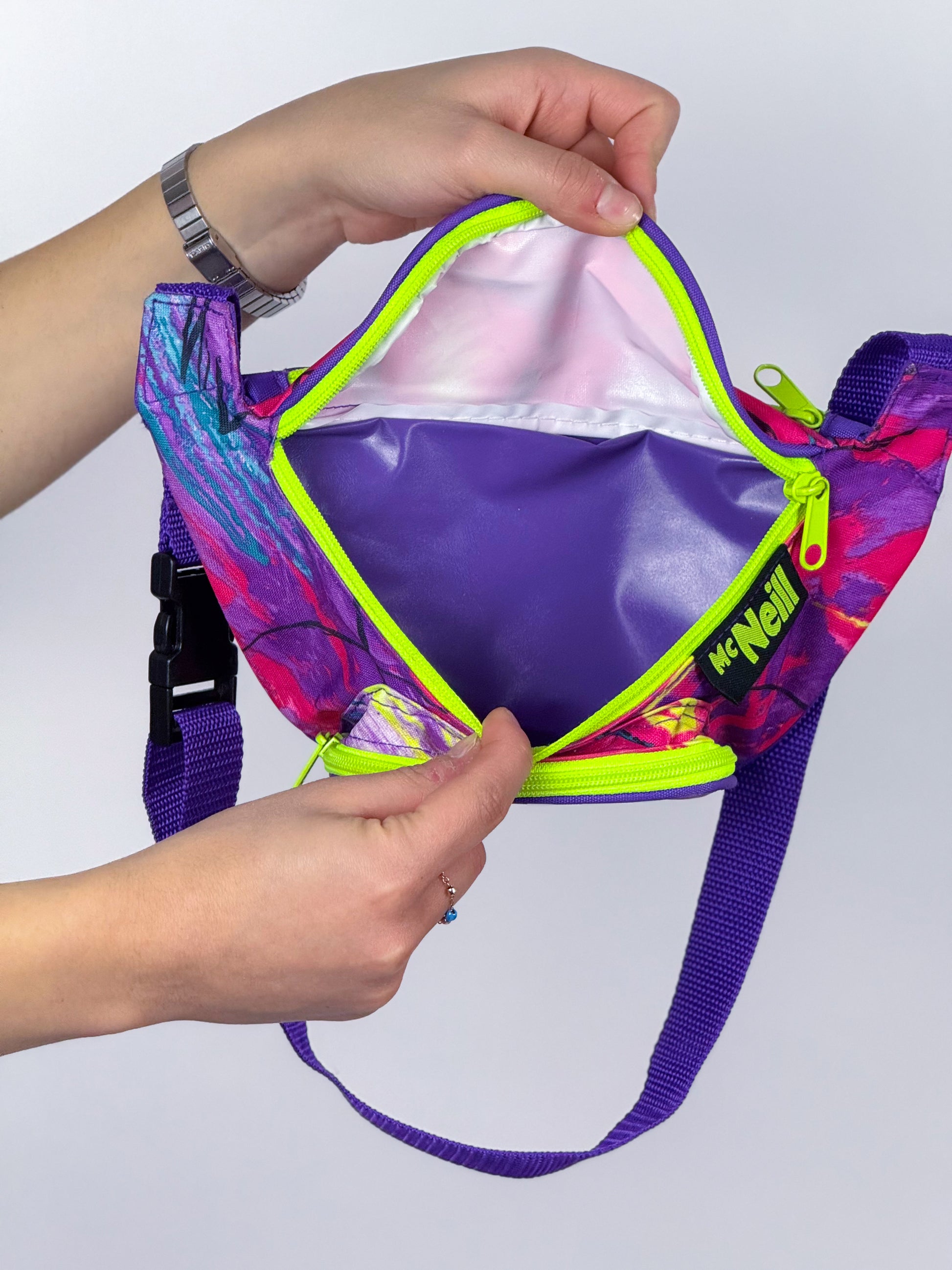 Marsupio anni ’90 McNeill, fantasia multicolor sui tonii del viola, fucsia e giallo fluo. Lunghezza regolabile. Vari scomparti.