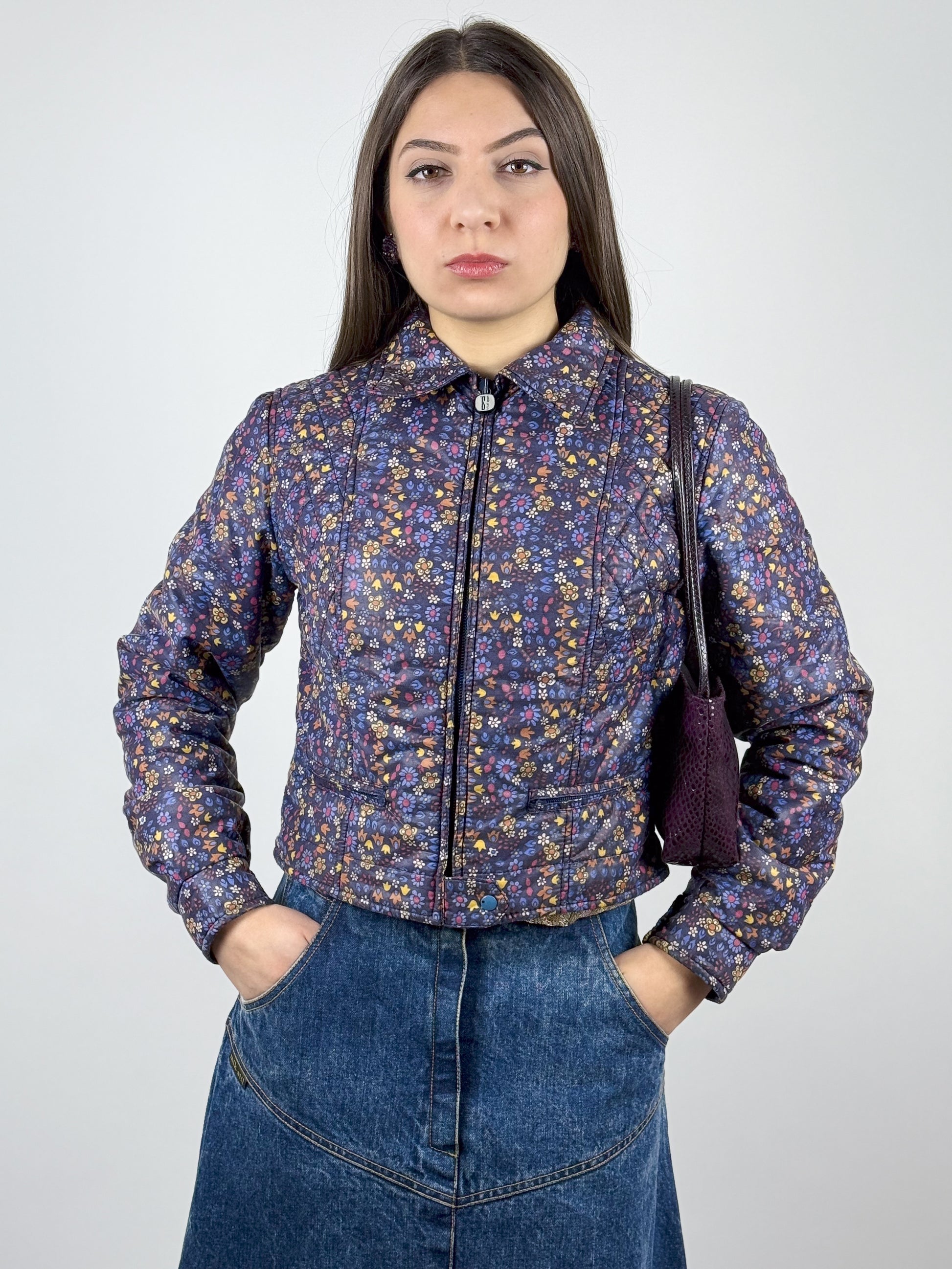 Veste de ski années 70 à motif floral. Léger et compact, mais très chaud. Modèle crop et fermeture zippée devant.