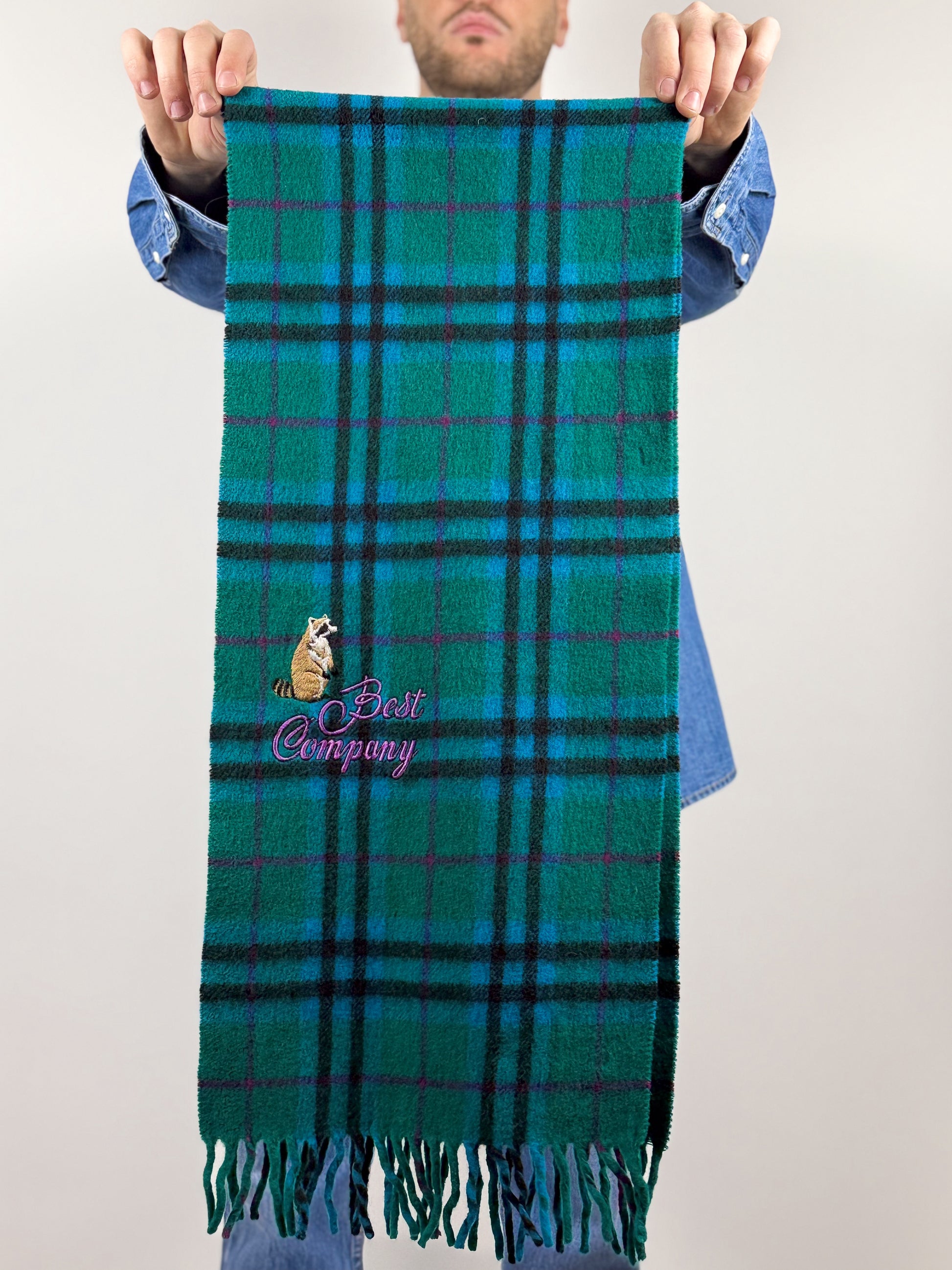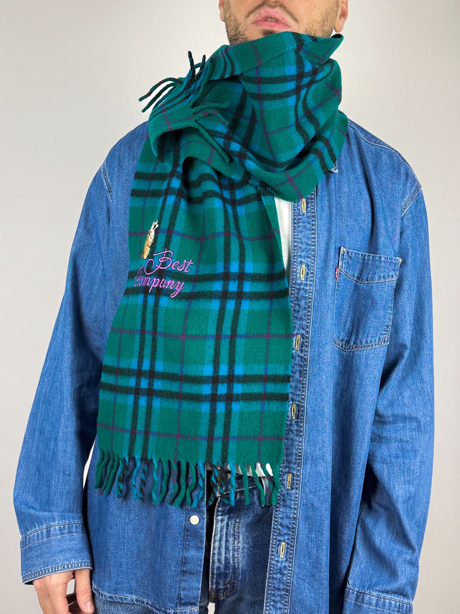 Écharpe en laine Best Company des années 80 fabriquée en Italie, tartan dans les tons de noir, vert, violet et bleu clair, avec logo et franges typiques de Best Company
