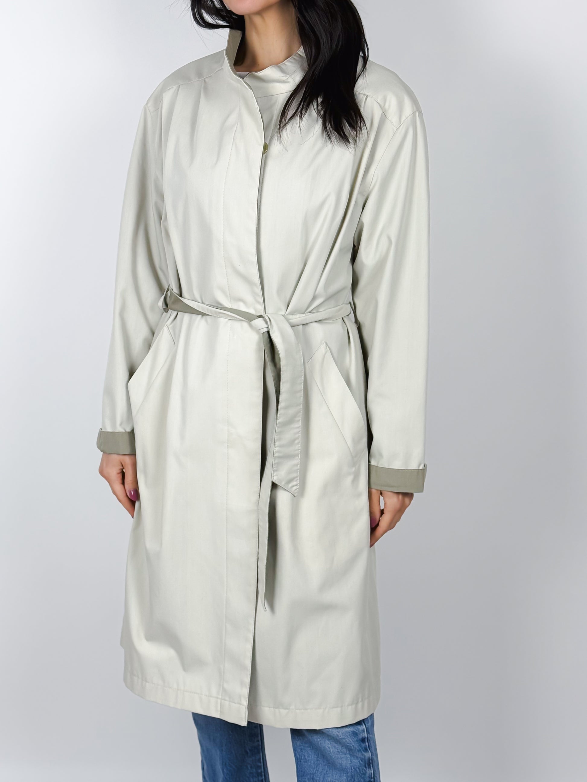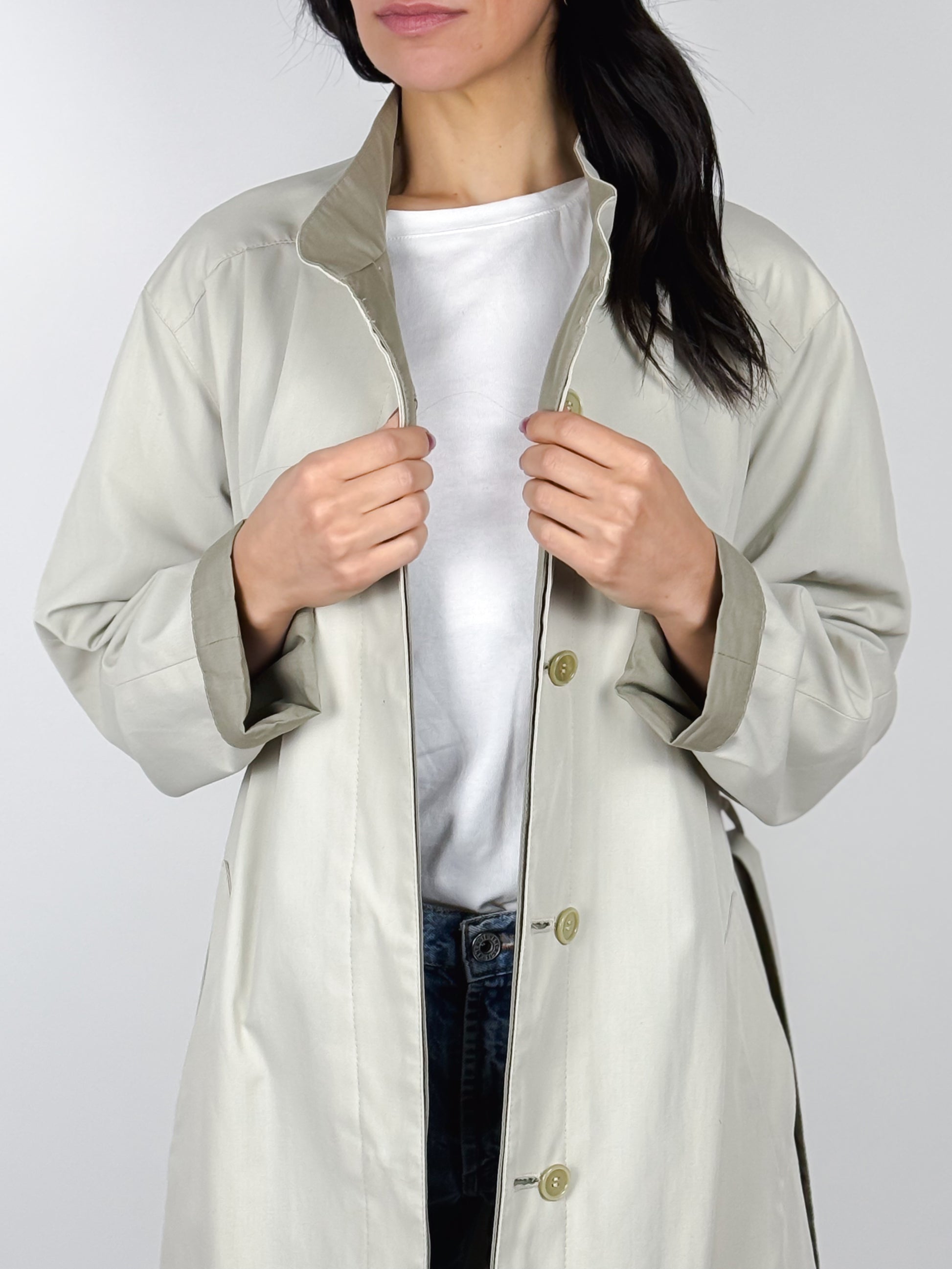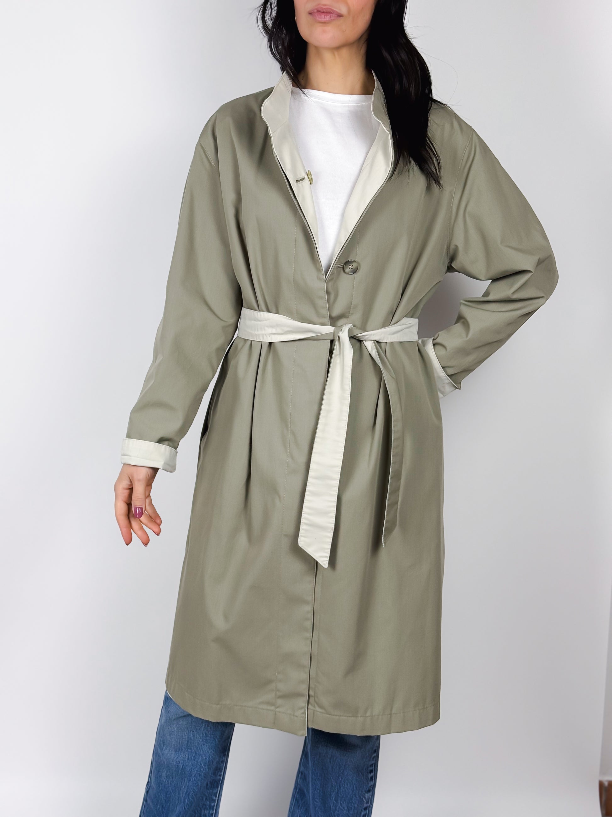 Trench reversibile in cotone con collo alla coreana. Da un lato è beige chiaro mentre dall'altro è verde militare. Presenta una cintura in vita e una chiusura frontale con bottoni.