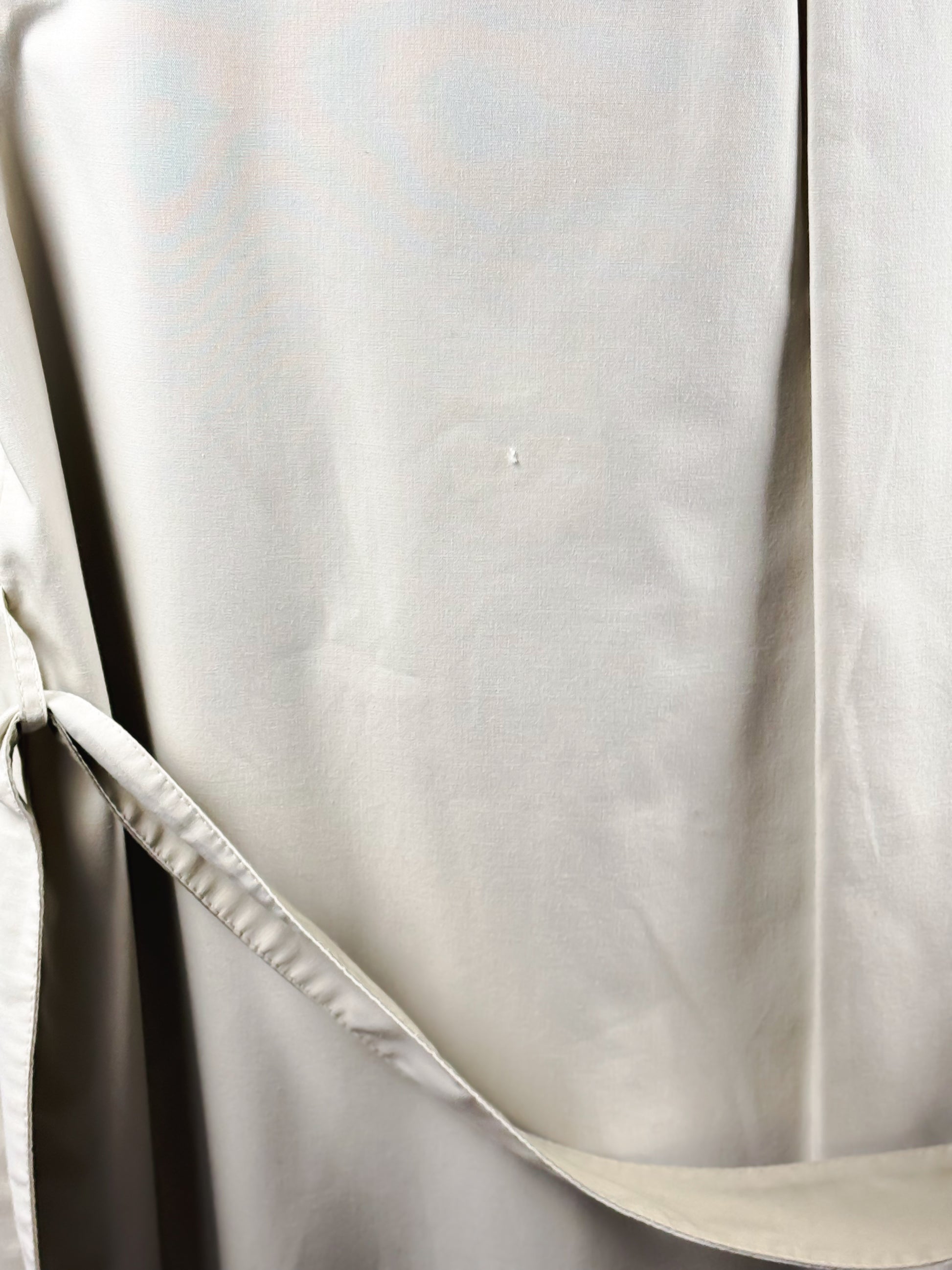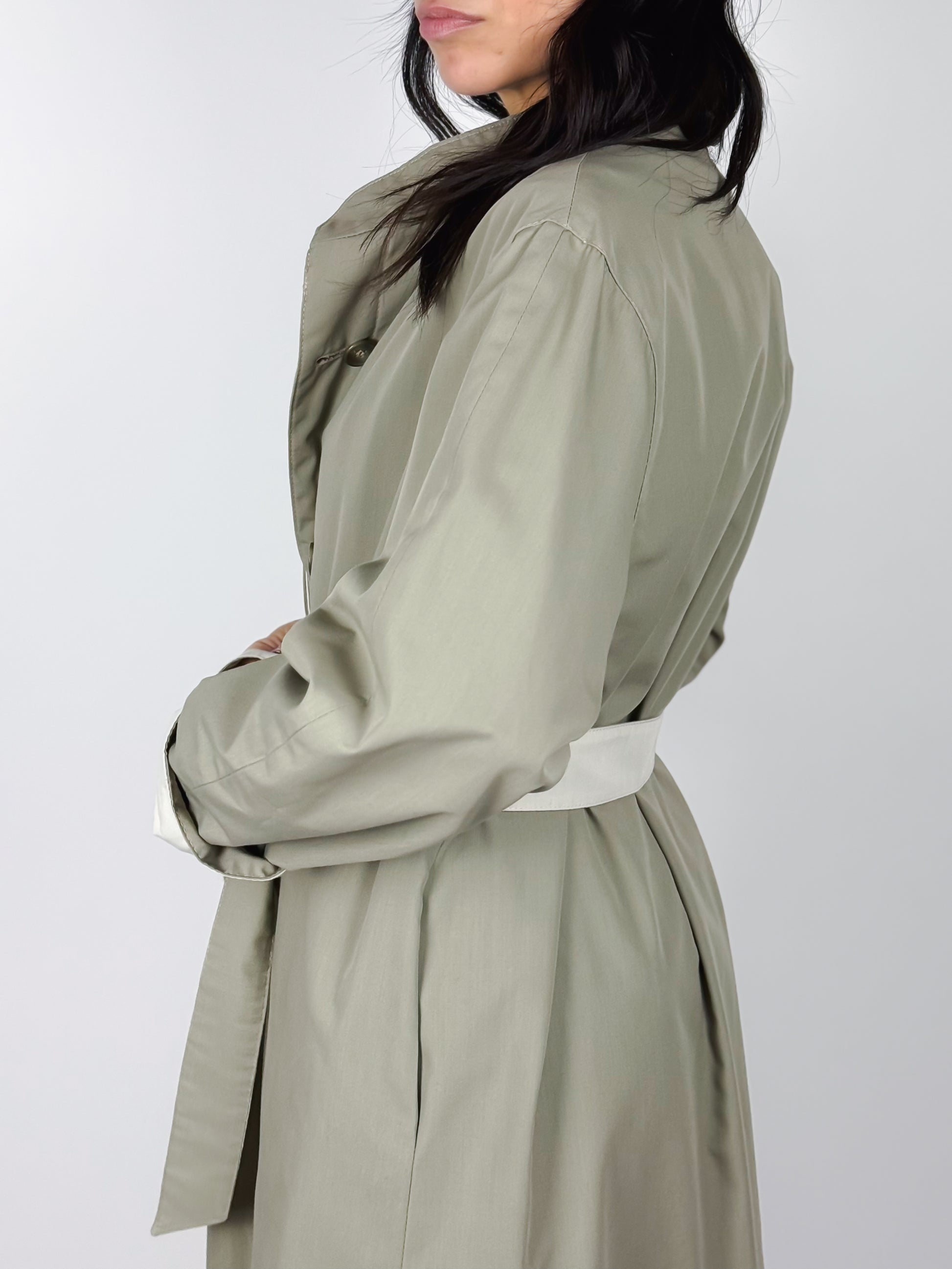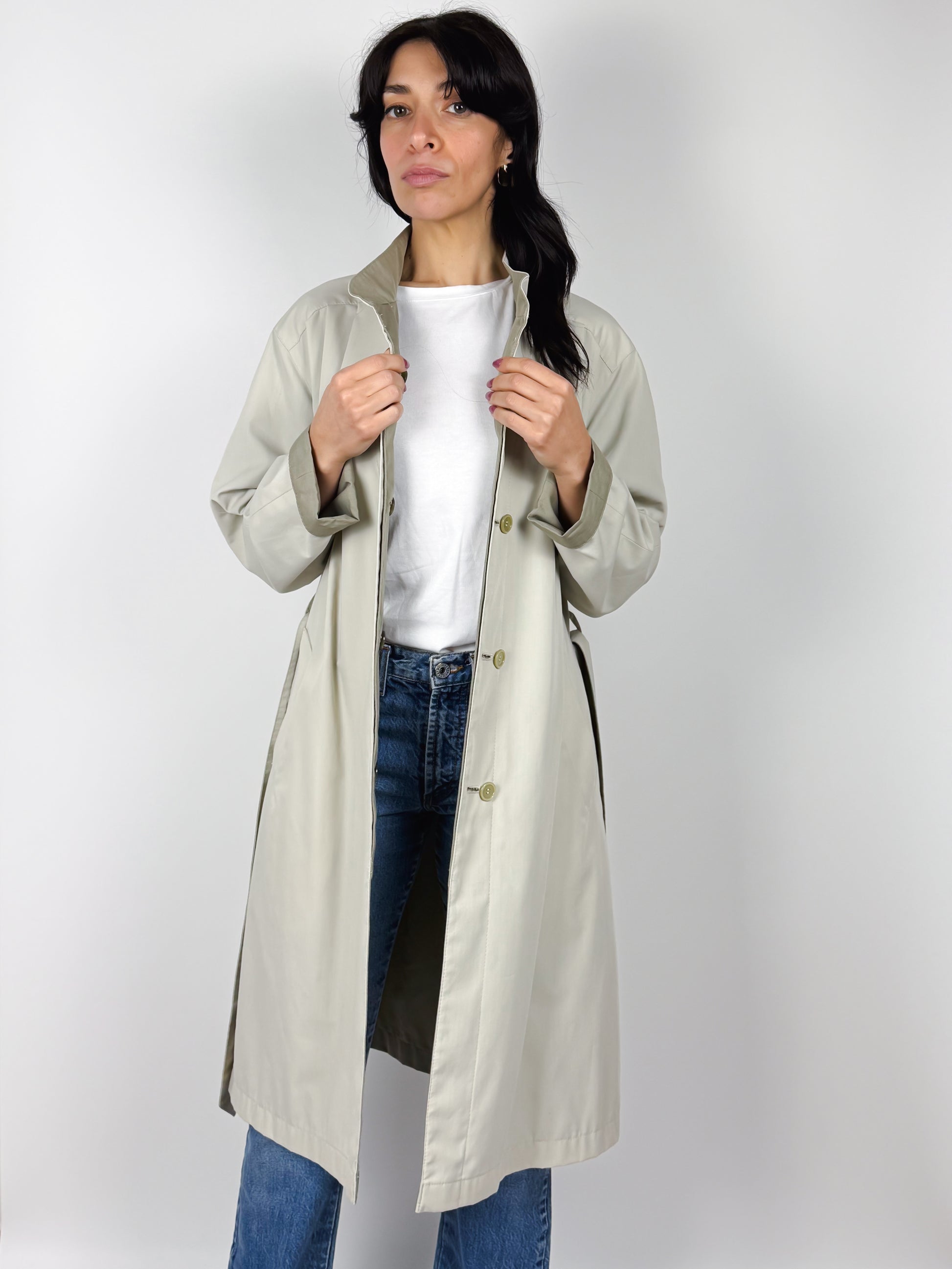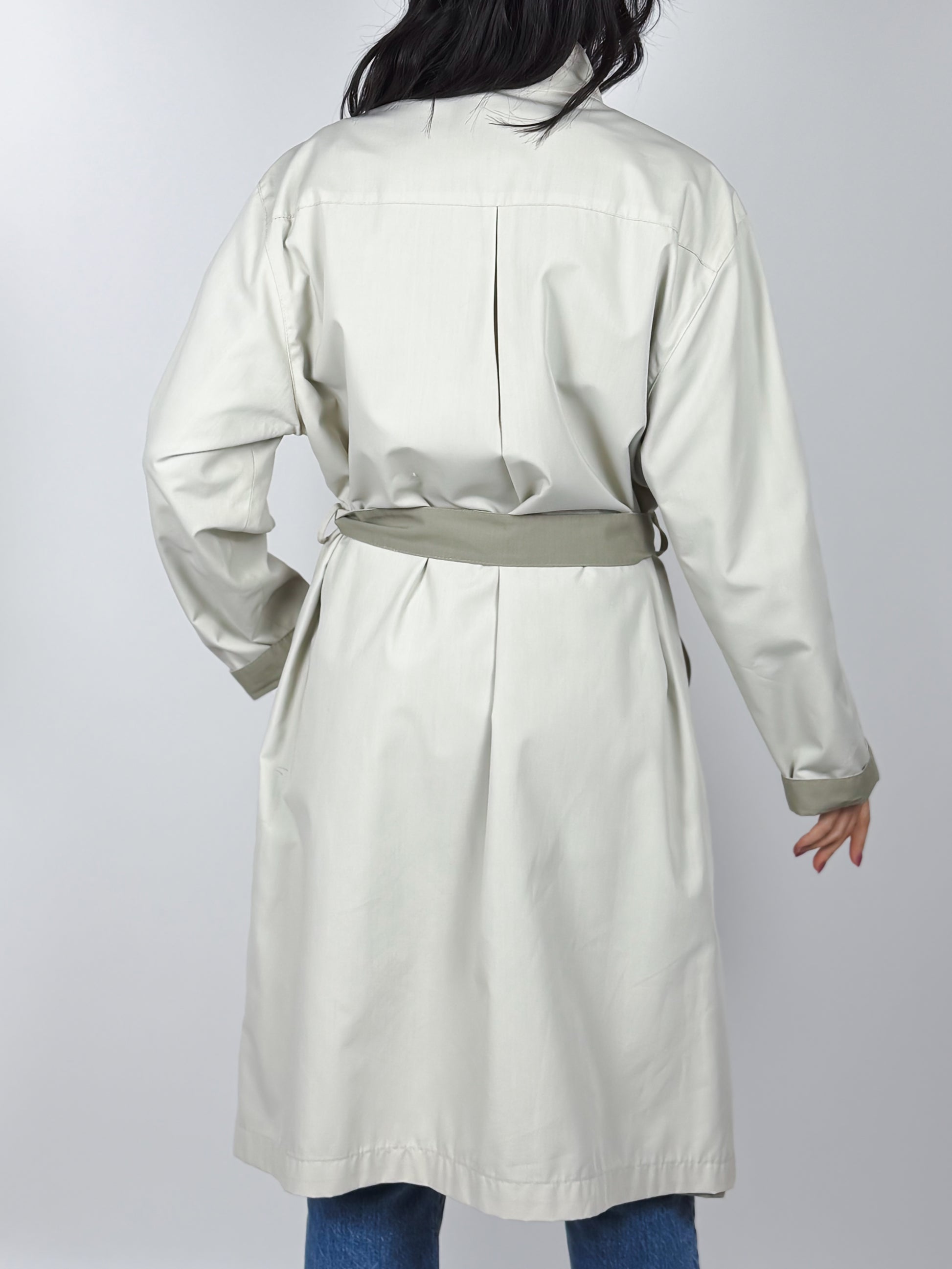 Trench reversibile in cotone con collo alla coreana. Da un lato è beige chiaro mentre dall'altro è verde militare. Presenta una cintura in vita e una chiusura frontale con bottoni.