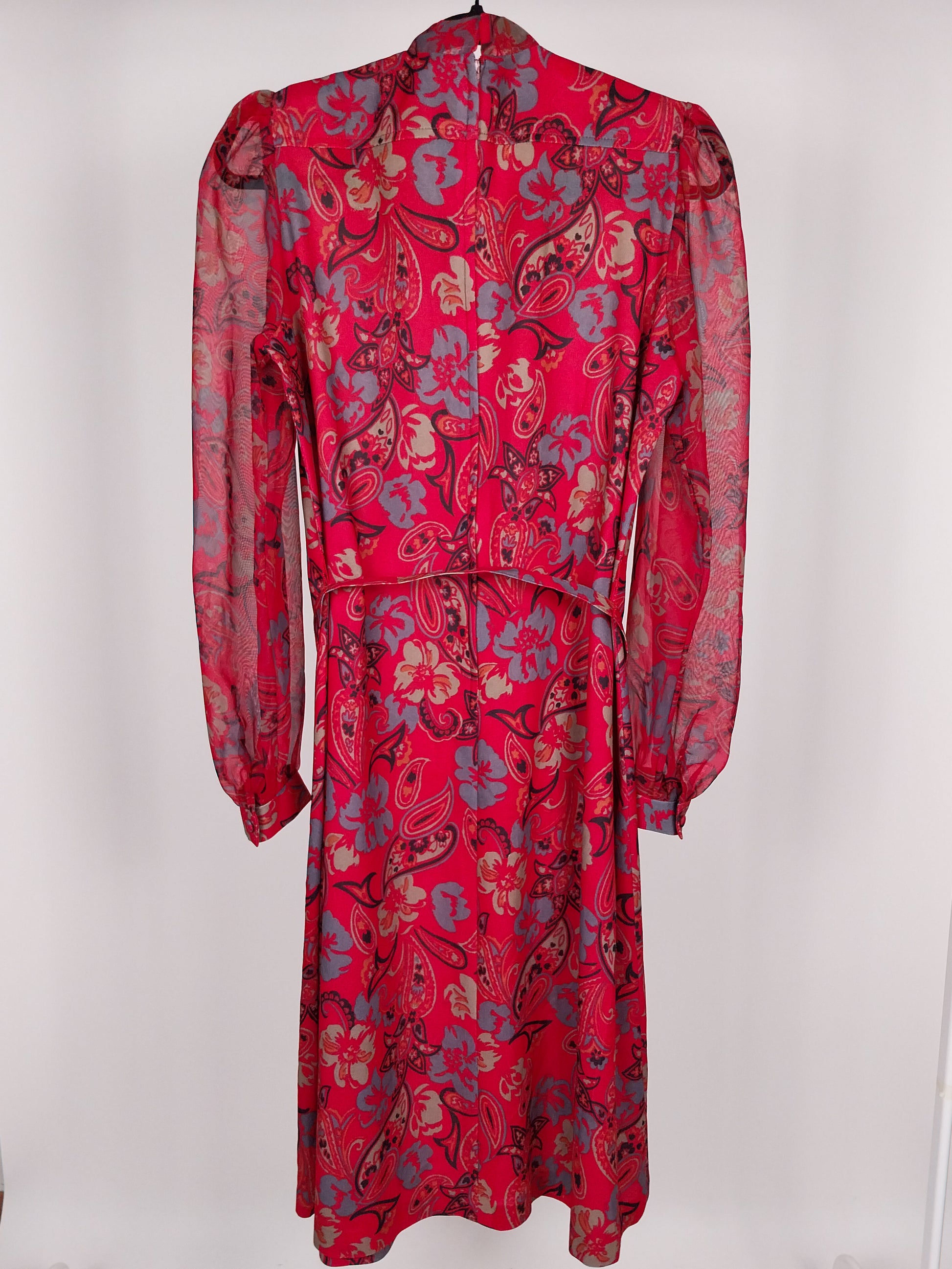 Iconico abito originale anni ’70 firmato Robert Newman London, Made in England. Un pezzo autentico dal fascino boho chic, caratterizzato da una vivace stampa paisley floreale nei toni del rosso lampone con dettagli grigio e beige.