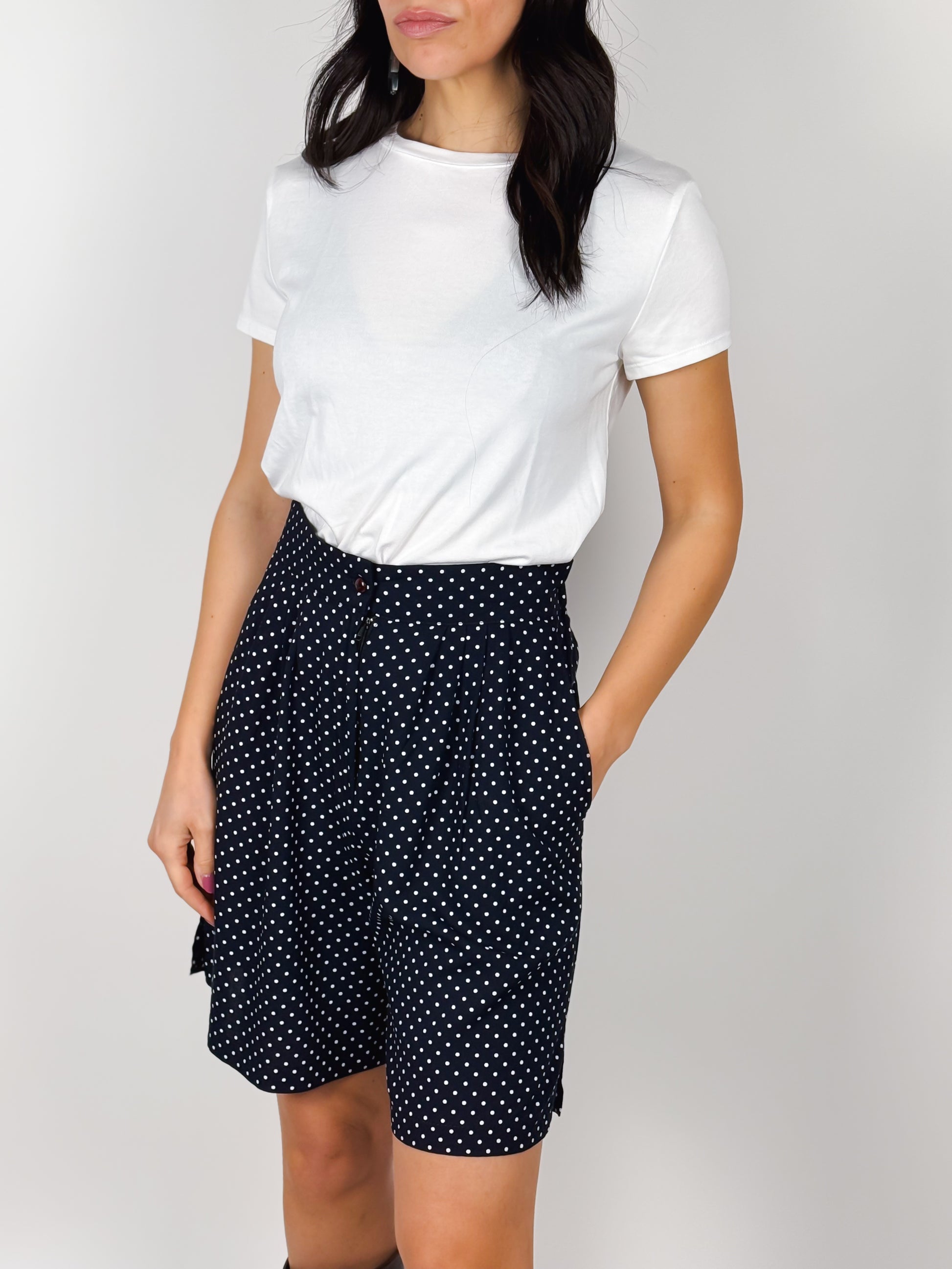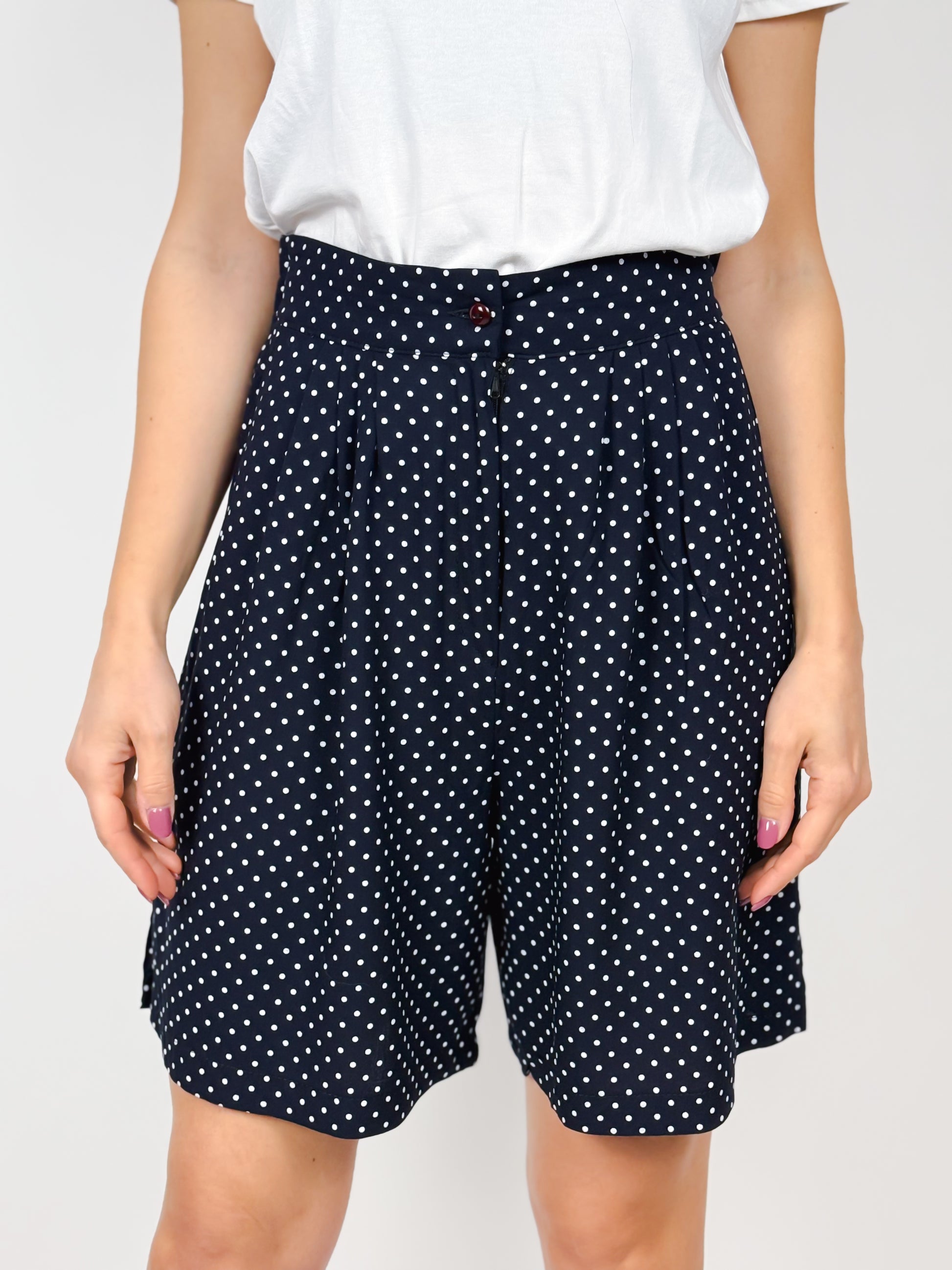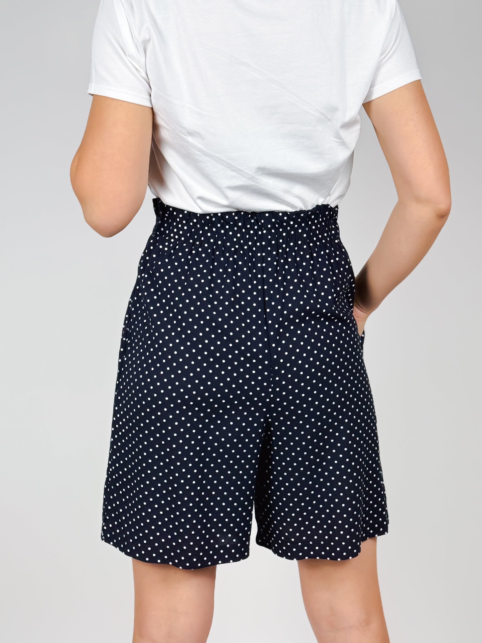 Pantaloncini bermuda blu con pois bianchi, in viscosa. Tessuto fresco e leggero. Chiusura frontale con zip e bottone, elastico in vita sul retro. Made in Italy.