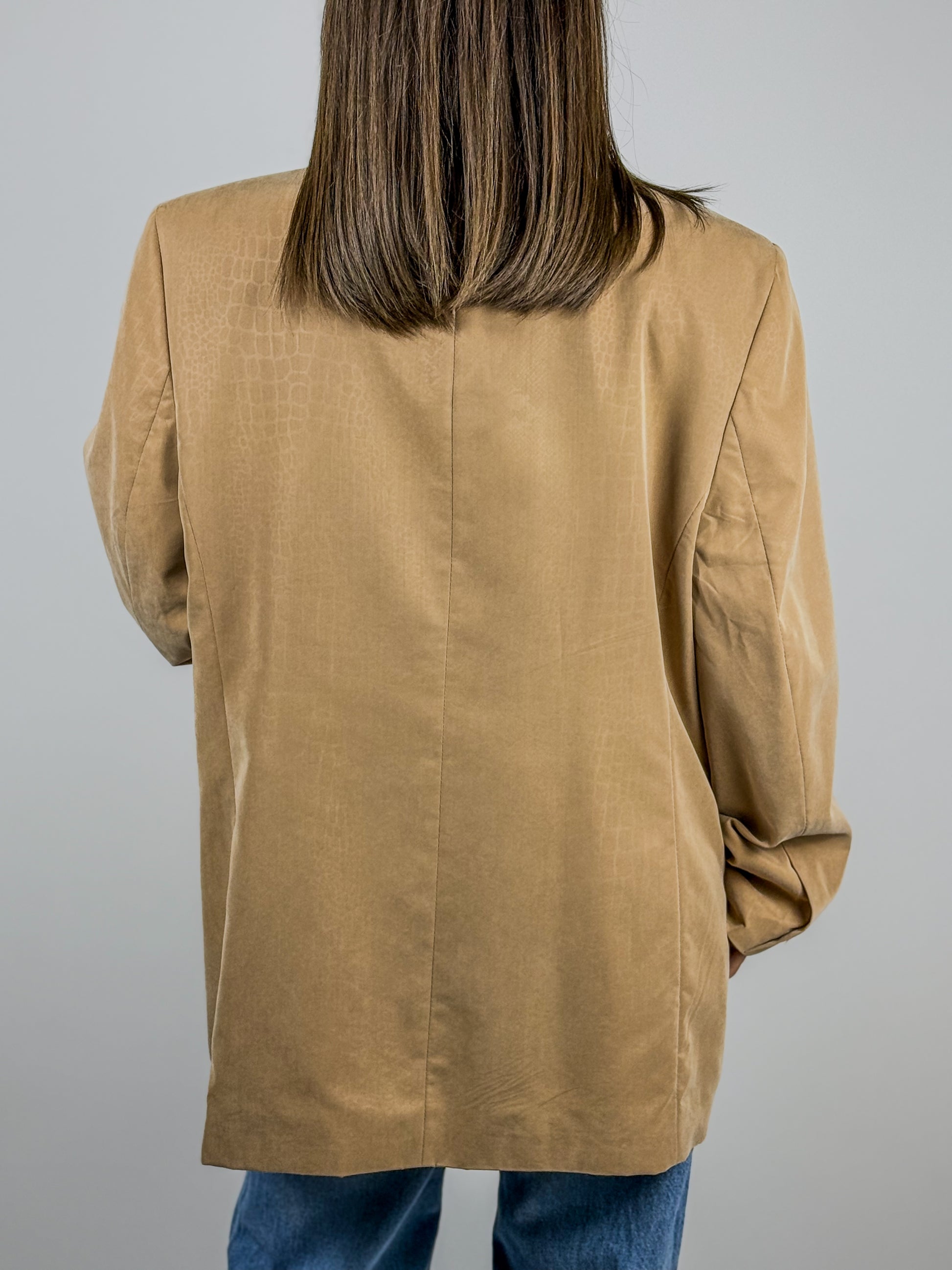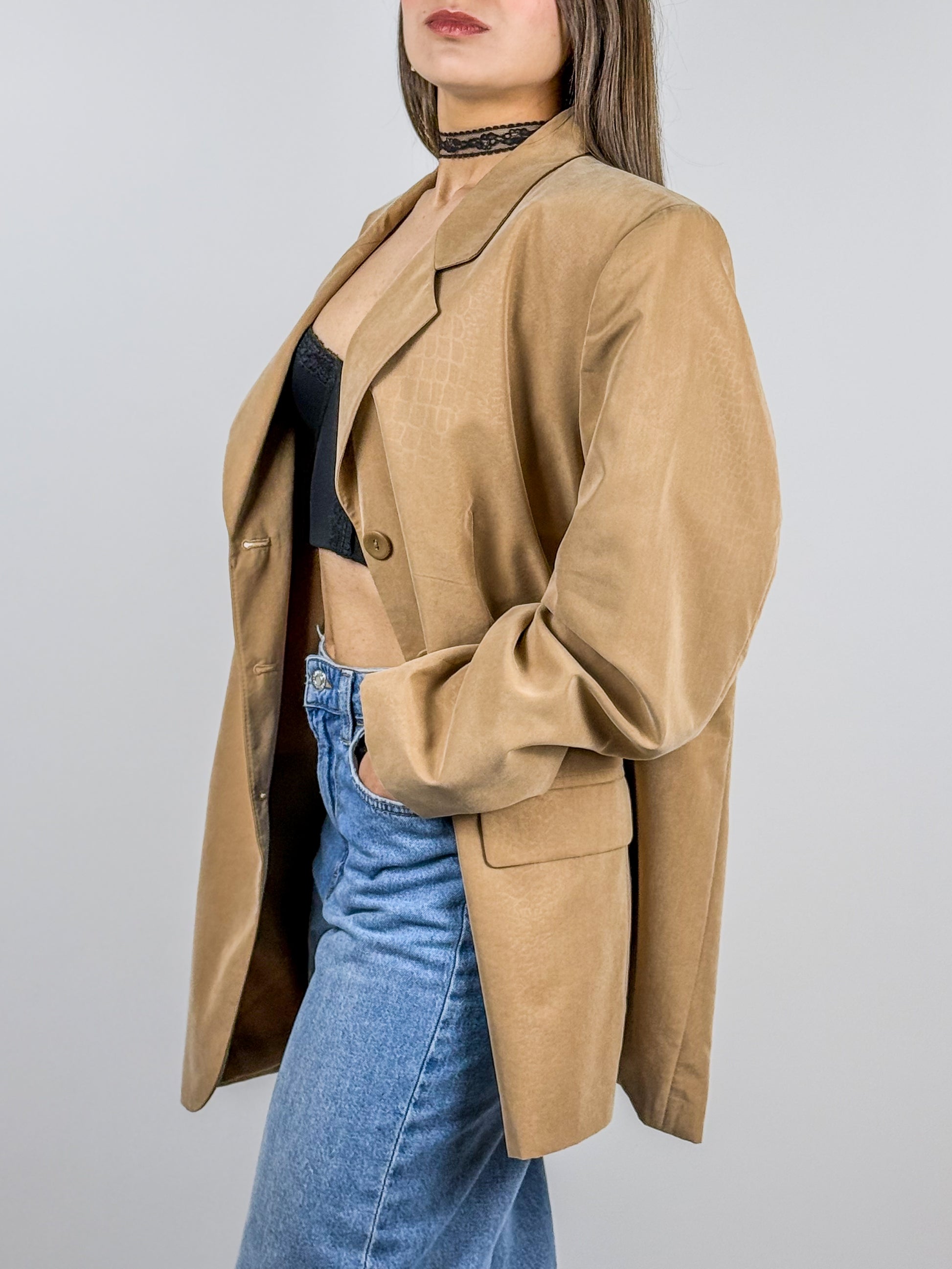 Blazer beige anni '90 a fantasia pitone, ton sur ton. Chiusura con tre bottoni, due tasche frontali e spalline imbottite.