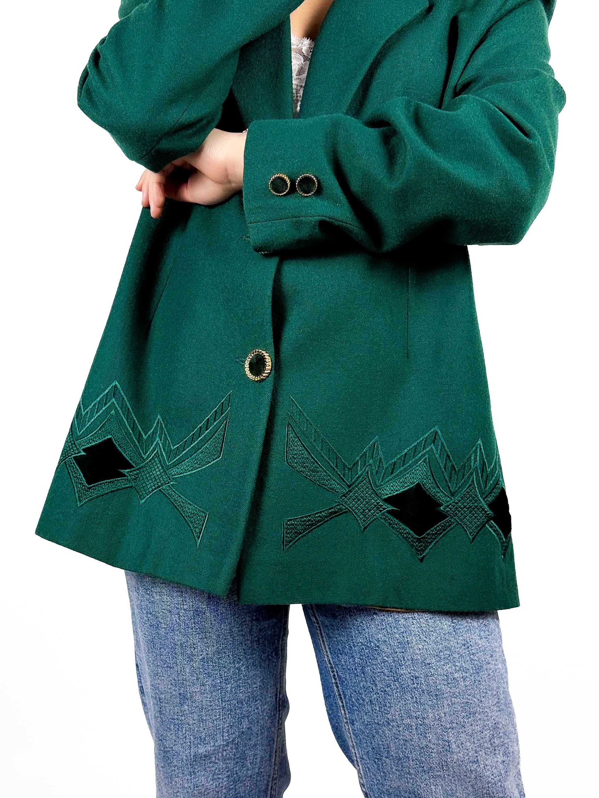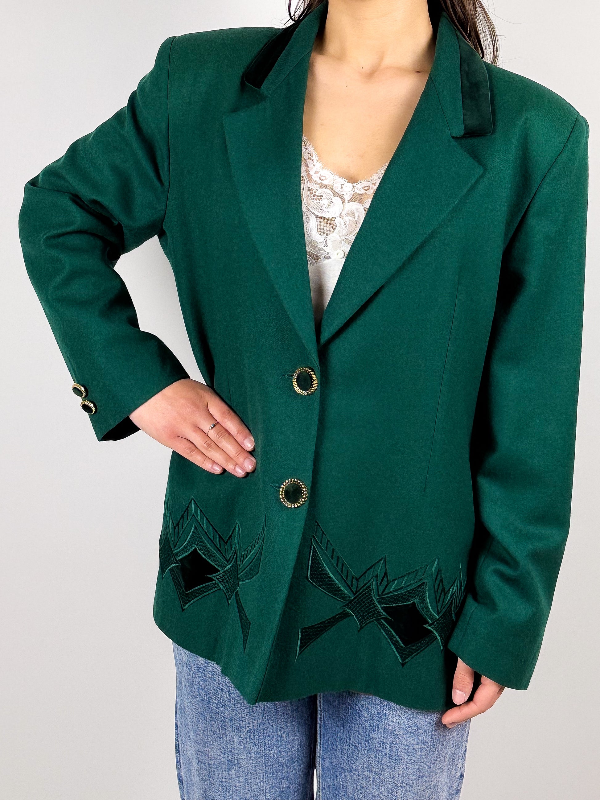 Blazer in lana anni '80 in un bellissimo verde, con dettagli in velluto e bottoni gioiello. Con spalline imbottite. Made in Italy "Titolo by Basile" storico marchio di abbigliamento italiano.