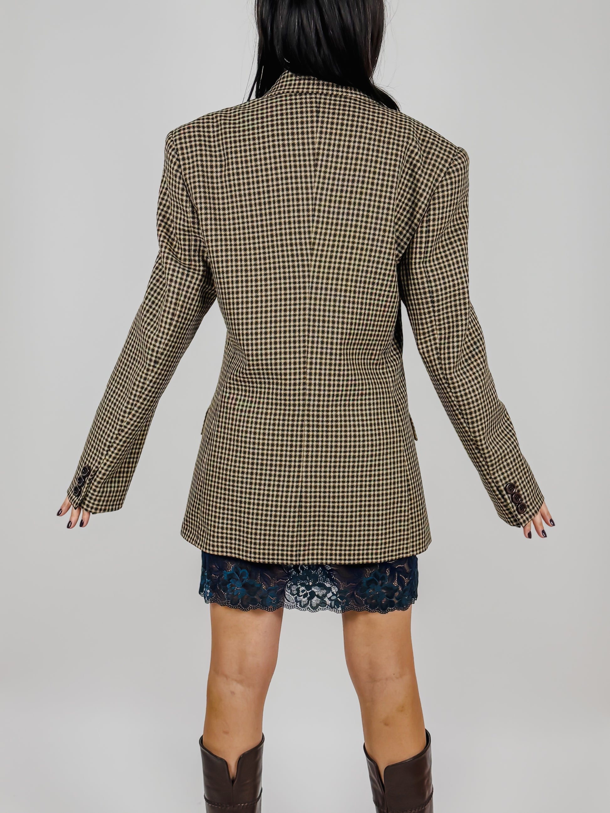 Blazer Sandro Ferrone Roma anni ’90 Made in Italy. Motivo a quadri sui toni del beige, nero e marrone; chiusura frontale con tre grandi bottoni neri mentre sulle maniche sono presenti tre bottoni marroni. Spalline imbottite e due tasche laterali.