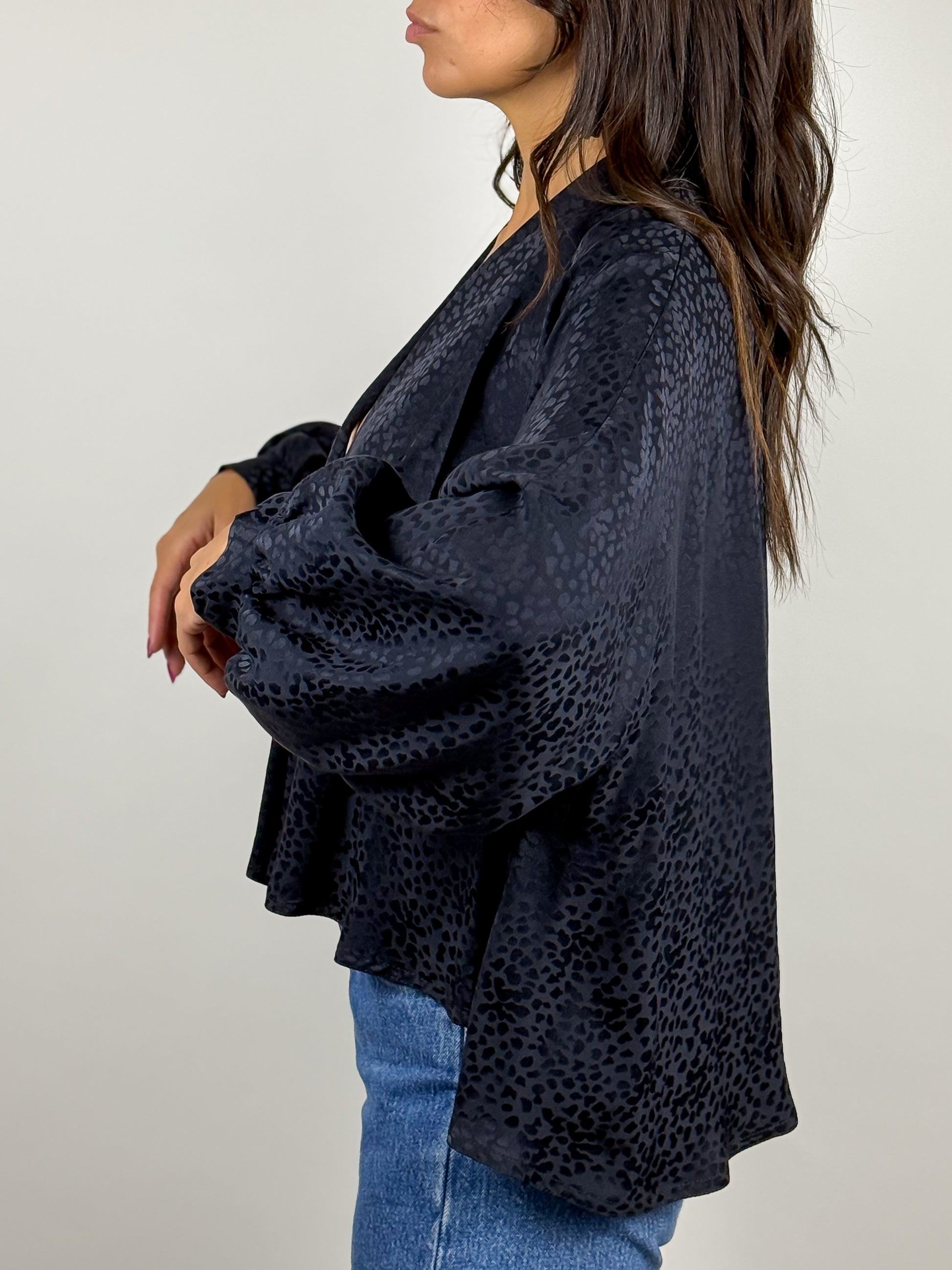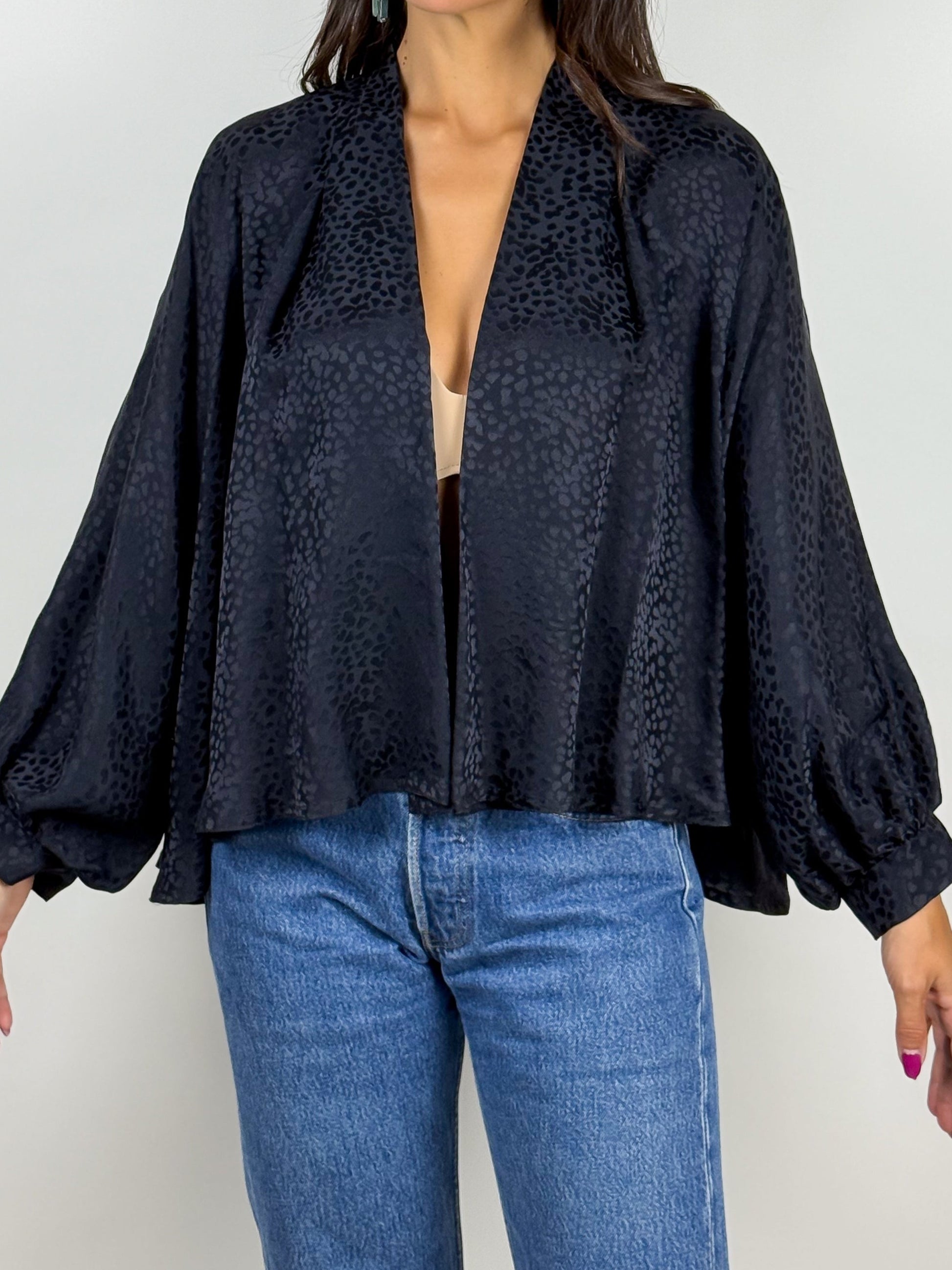 Bolero vintage nero in pura seta, realizzato in Italia. Il tessuto leggero e lucente presenta una stampa animalier ton sur ton.