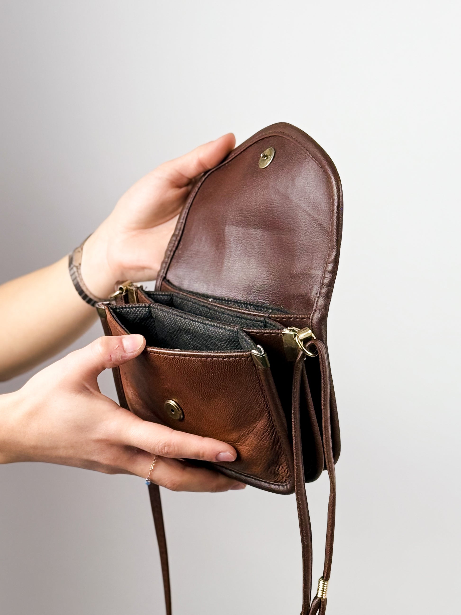 Borsetta in pelle marrone La Toscana, Made in Italy. Lunghezza tracolla regolabile con dettagli dorati e vari scomparti, chiusura a clip.