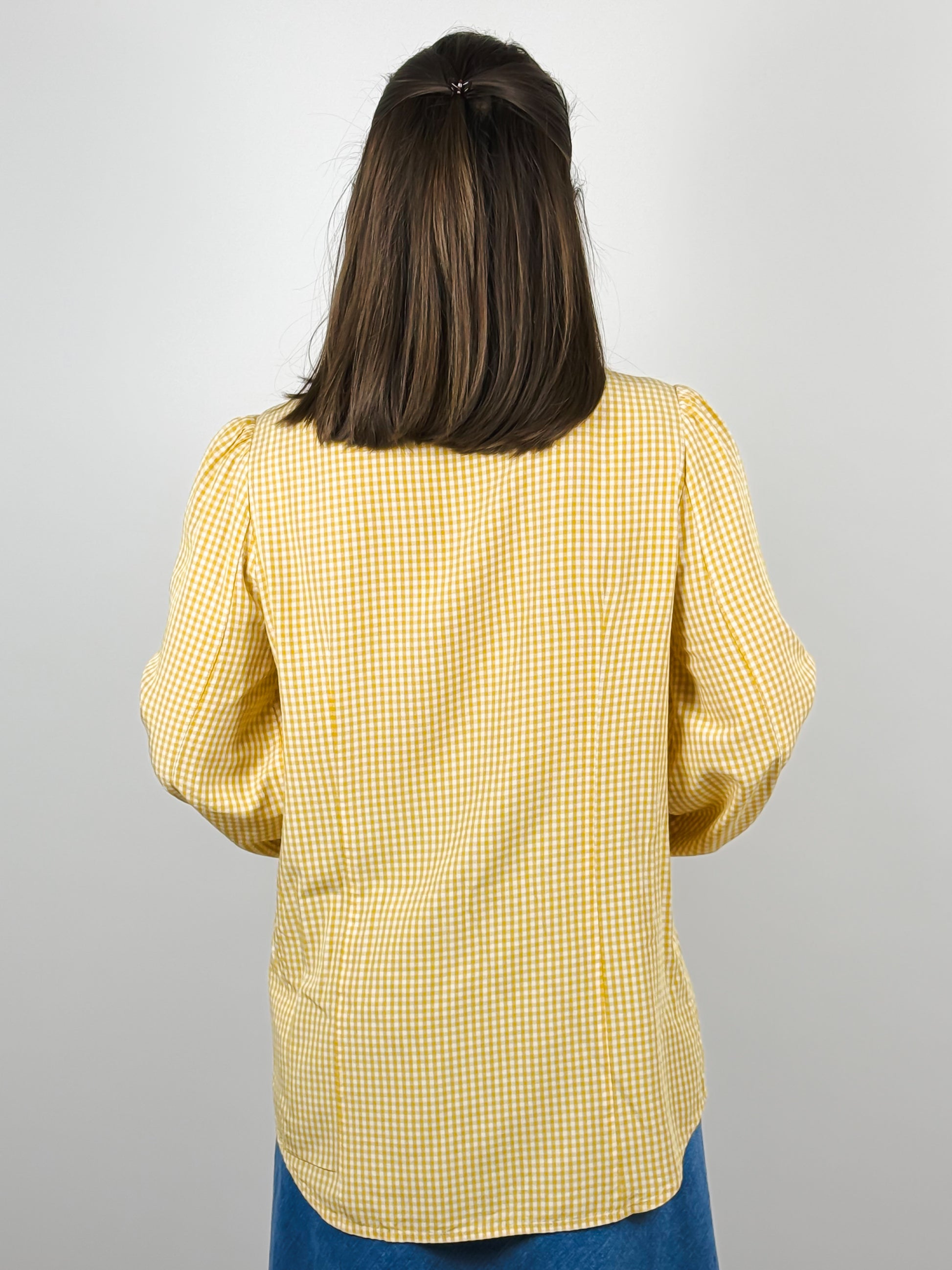 Camicia in viscosa Gas a fantasia vichy gialla e bianca. Tessuto fresco e leggero. Maniche lunghe leggermente a sbuffo sulle spalle e sui polsi e rouches sul petto.