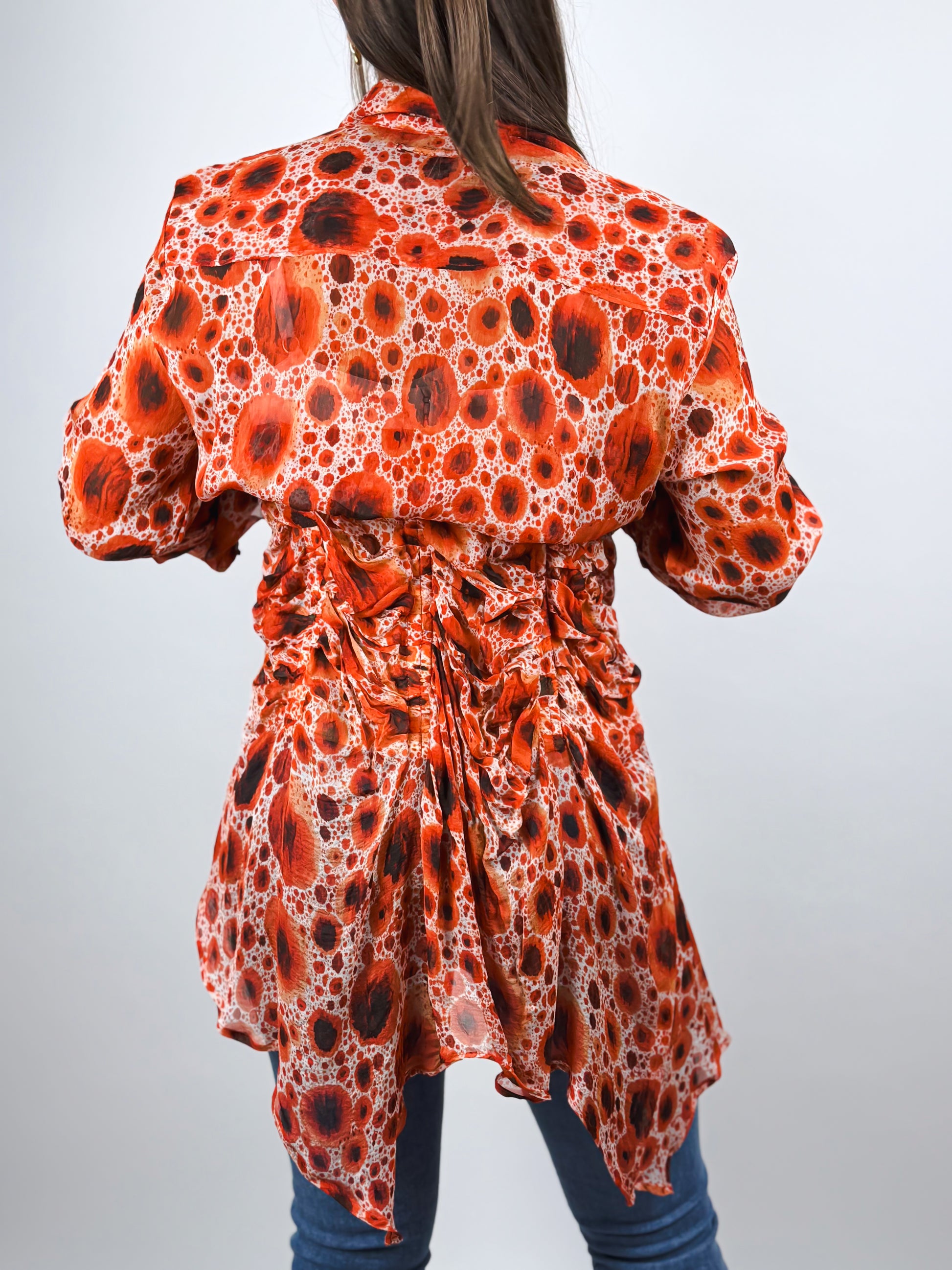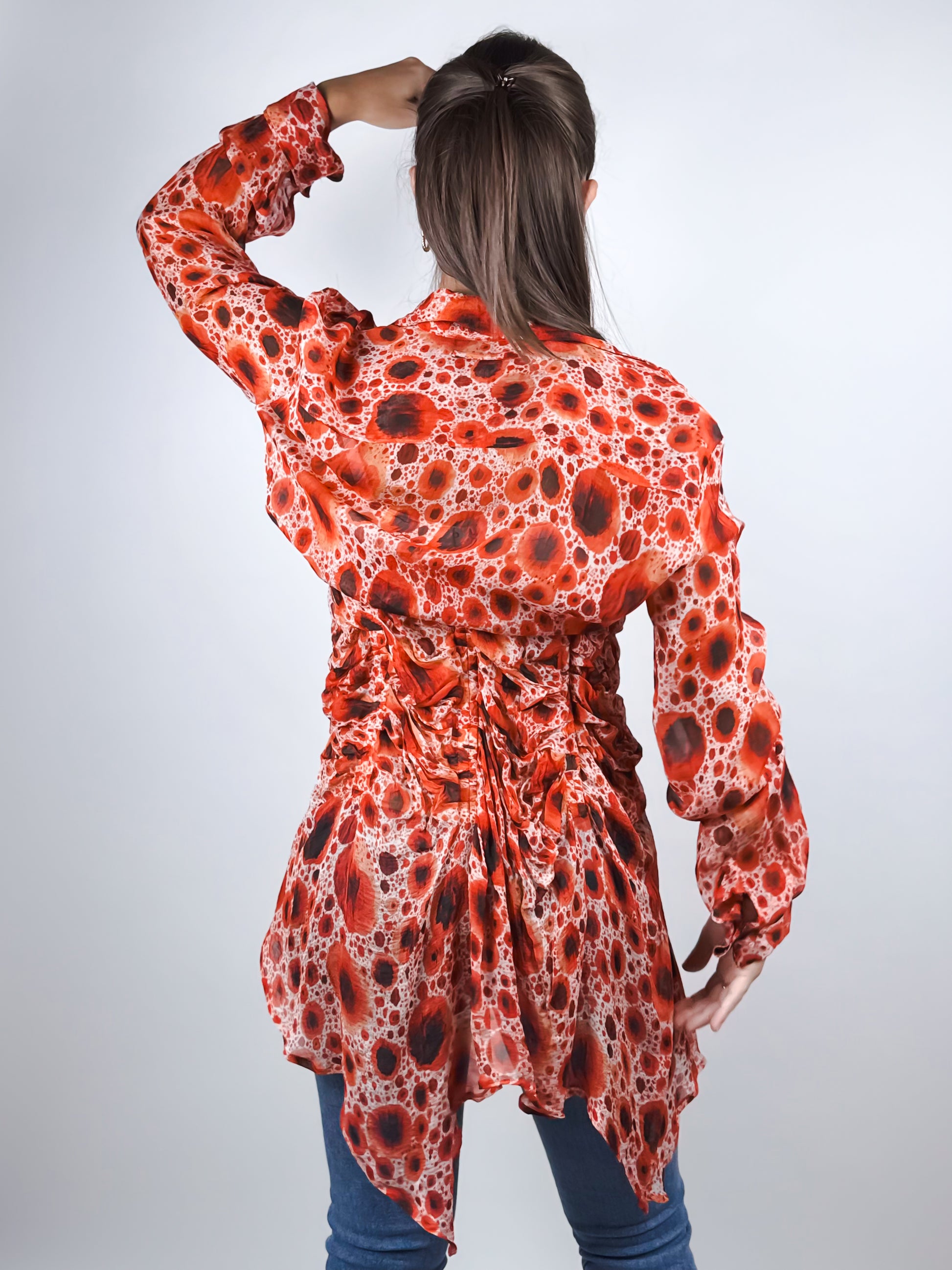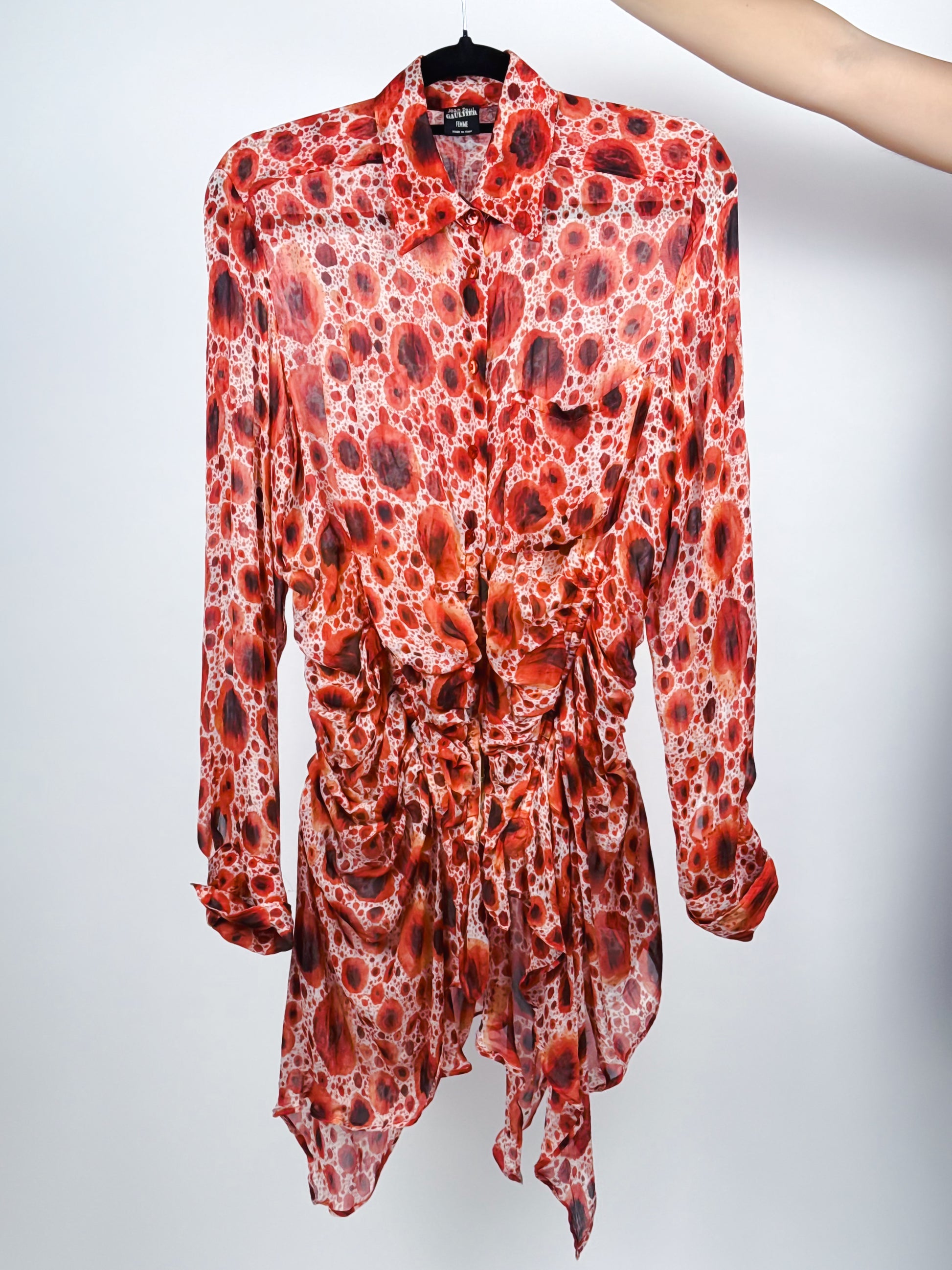 Camicia vintage Jean Paul Gaultier Femme, realizzata in 100% seta, “Made in Italy”. Stile Y2K. Presenta una stampa floreale astratta sui toni del rosso/arancio su fondo chiaro, maniche lunghe, colletto classico e chiusura frontale con bottoni.