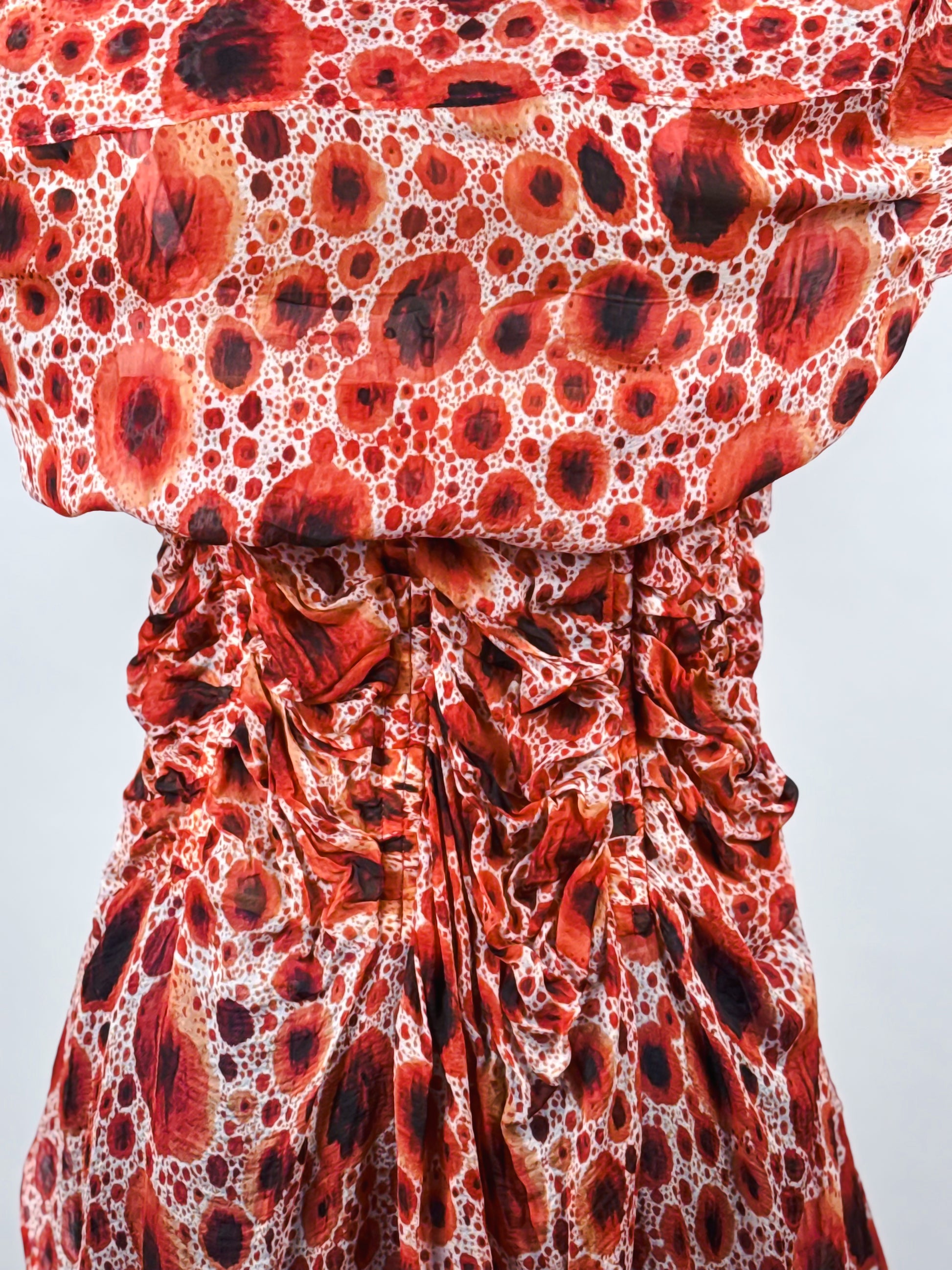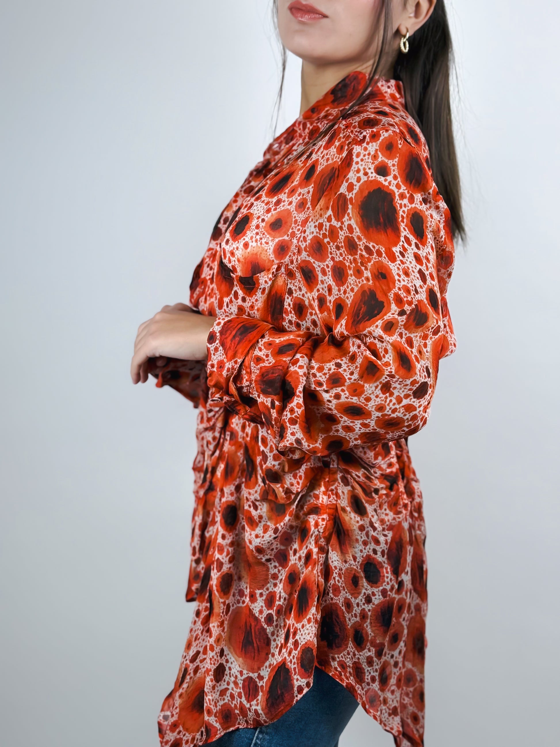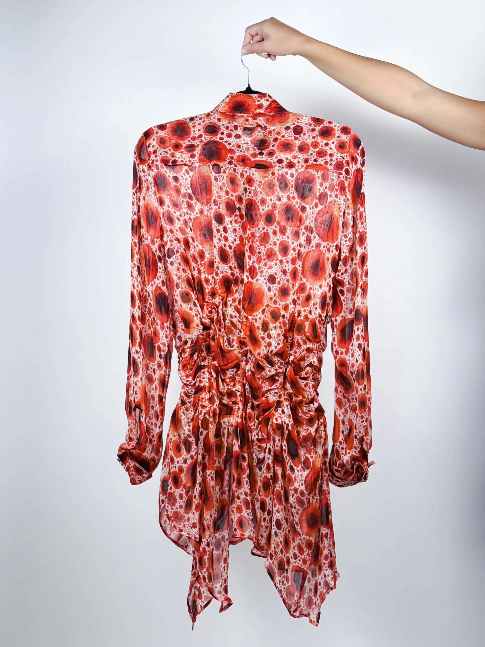 Camicia vintage Jean Paul Gaultier Femme, realizzata in 100% seta, “Made in Italy”. Stile Y2K. Presenta una stampa floreale astratta sui toni del rosso/arancio su fondo chiaro, maniche lunghe, colletto classico e chiusura frontale con bottoni.