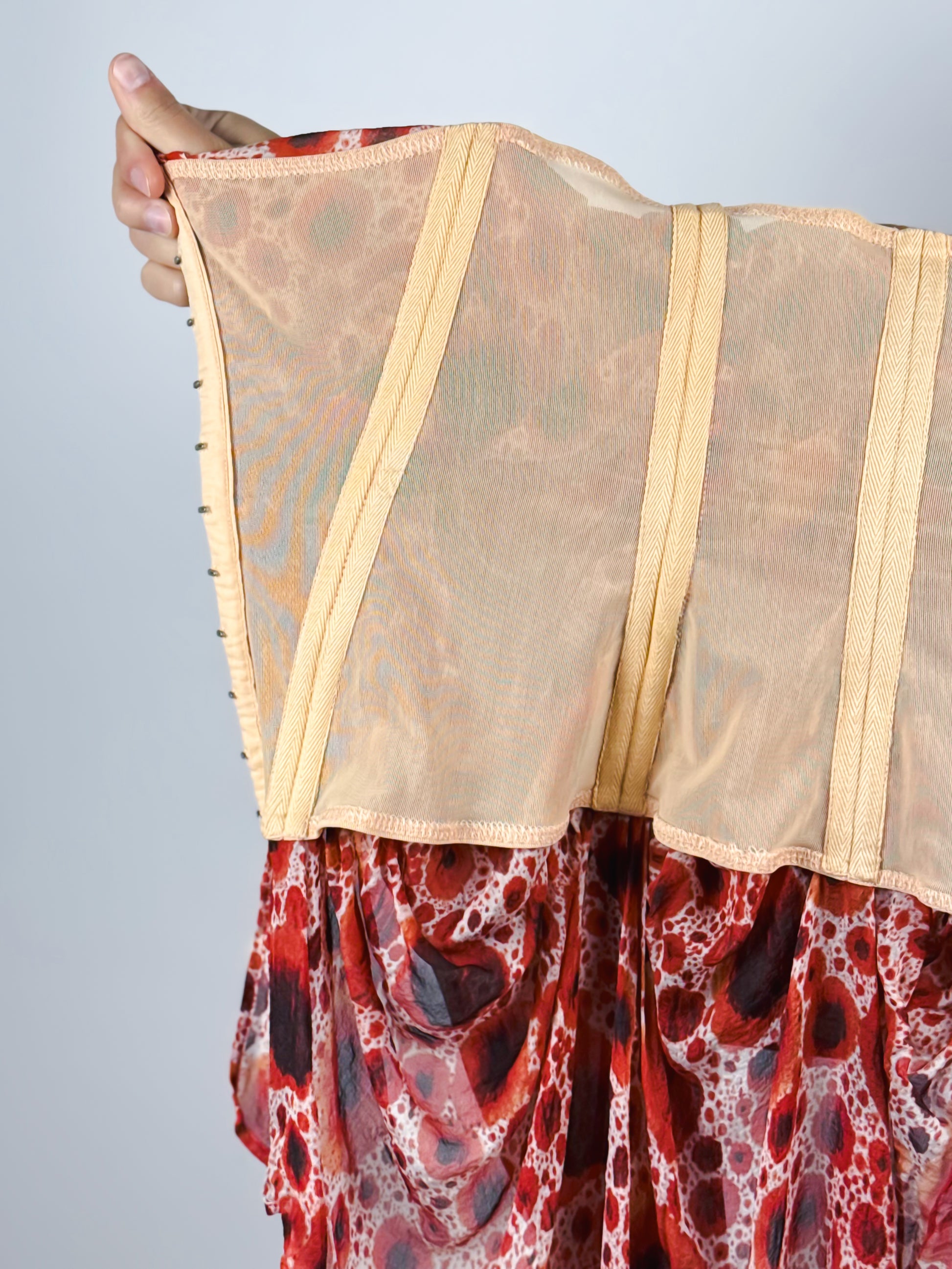 Il capo ha una sezione arricciata e drappeggiata al centro sorretta da un corsetto all'interno, che crea un effetto asimmetrico e voluminoso. L'orlo inferiore è anch'esso asimmetrico.