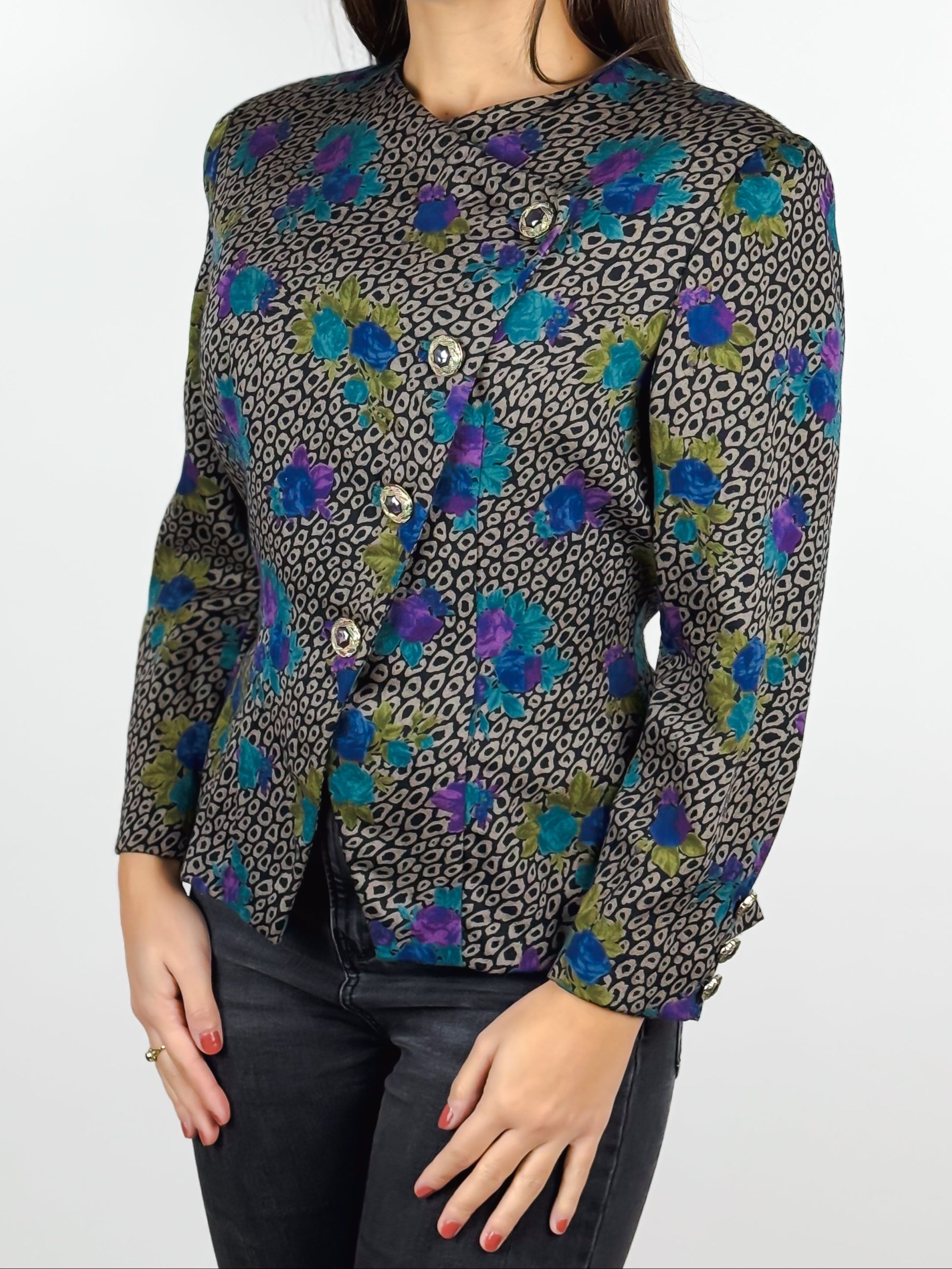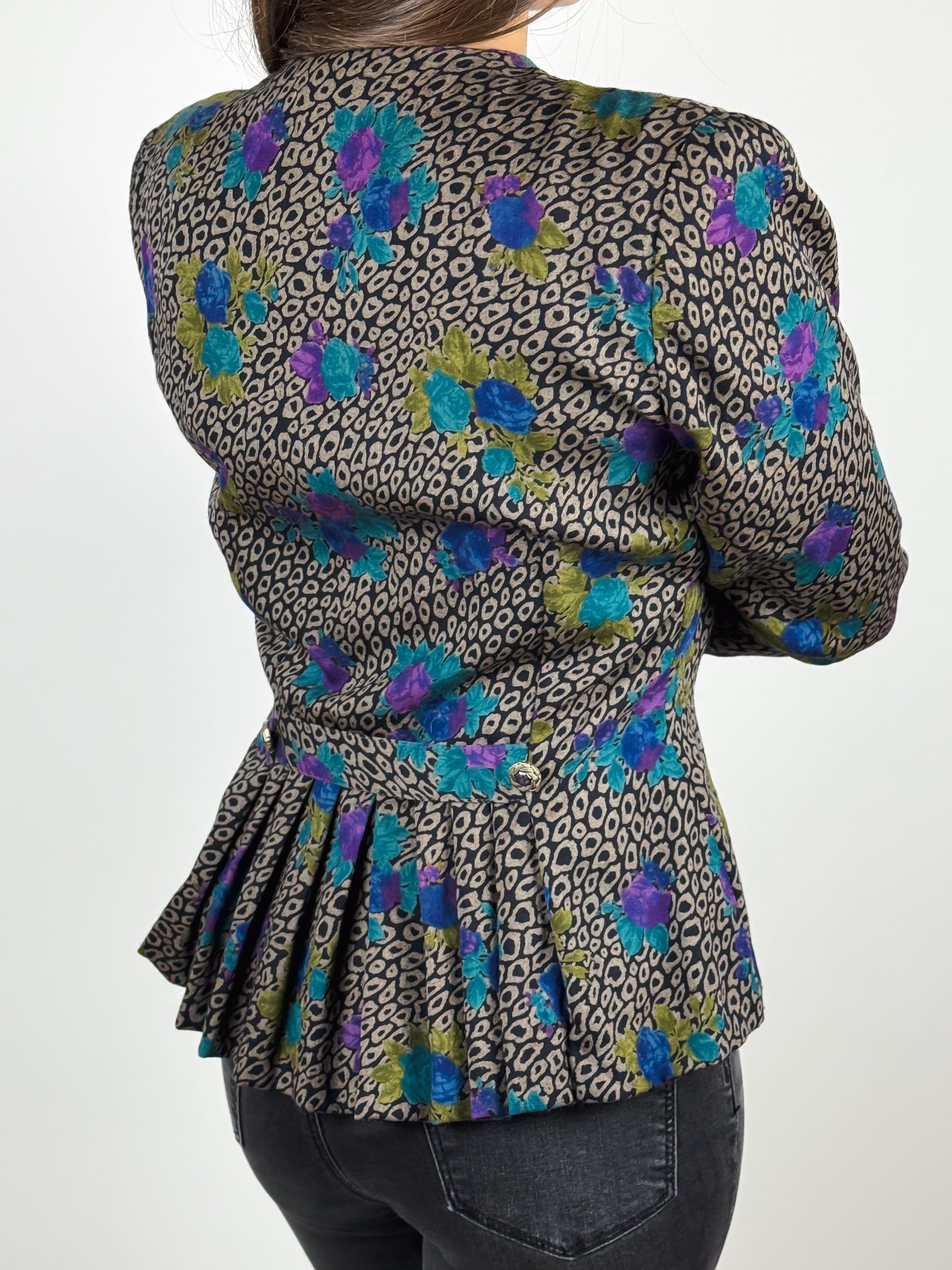 Camicia vintage da donna di manifattura sartoriale, caratterizzata da una particolare fantasia maculata con eleganti inserzioni floreali. Il modello presenta una linea strutturata, con spalline imbottite e vita aderente. La chiusura frontale è impreziosita da grandi bottoni gioiello, presenti anche sui polsini. Sul retro, la camicia è arricchita da una martingala decorativa e da un elegante volant a pieghe. Un capo unico, di alta qualità sartoriale.