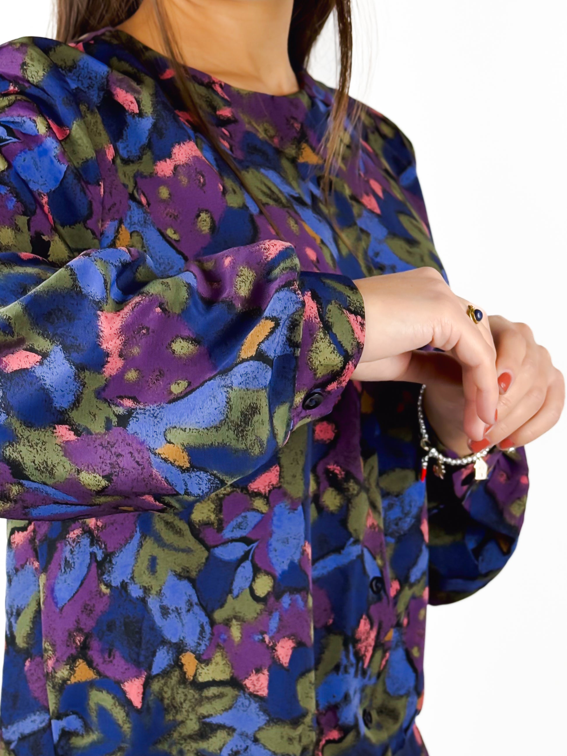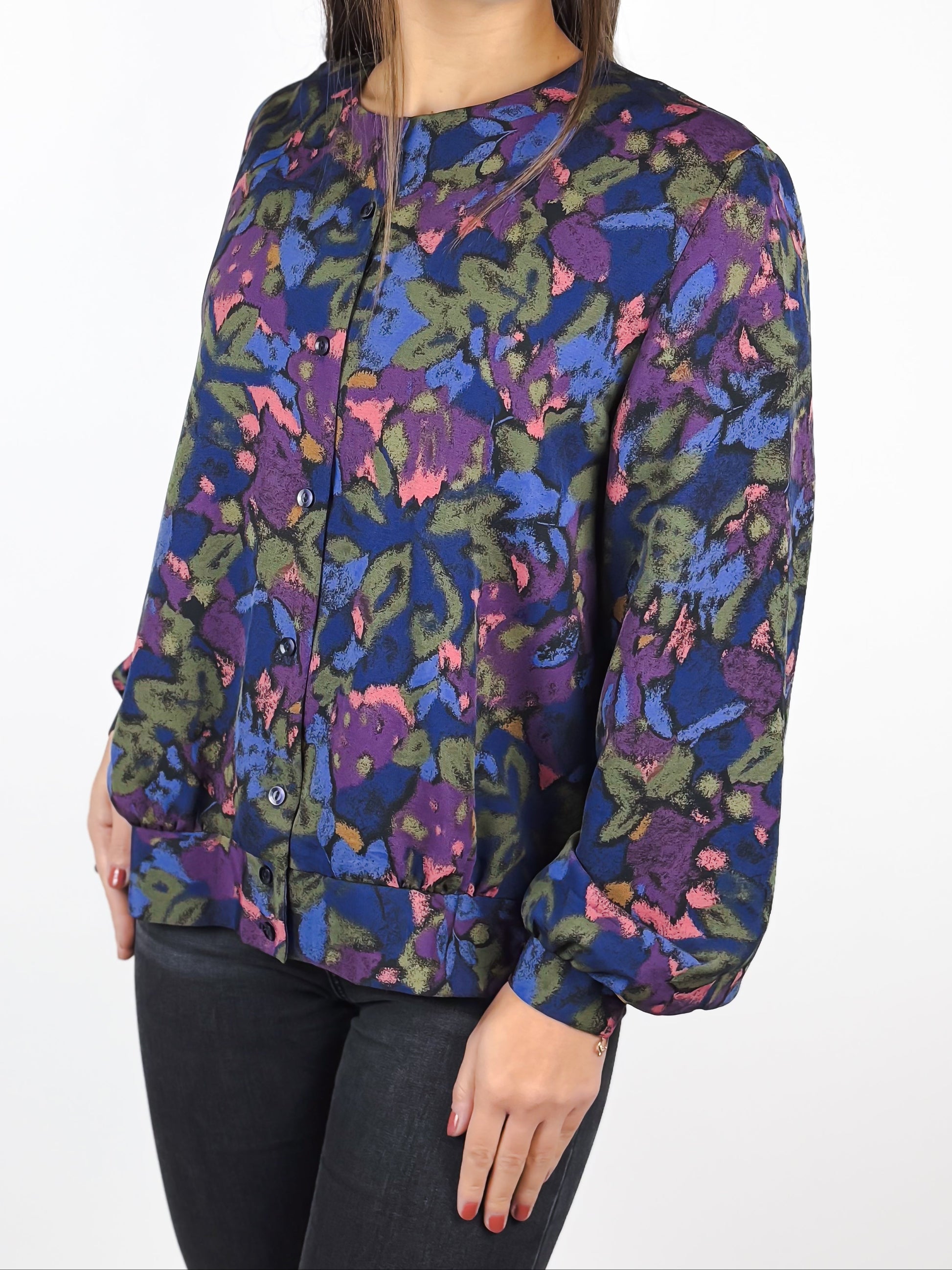 Camicetta vintage sartoriale, realizzata con cura artigianale. Presenta chiusura frontale con bottoni, collo tondo e una fascia sul fondo che crea un leggero effetto blusante. La fantasia è floreale sui toni del viola, blu e rosa. Un capo unico, dal fascino retrò e dalla qualità sartoriale evidente.