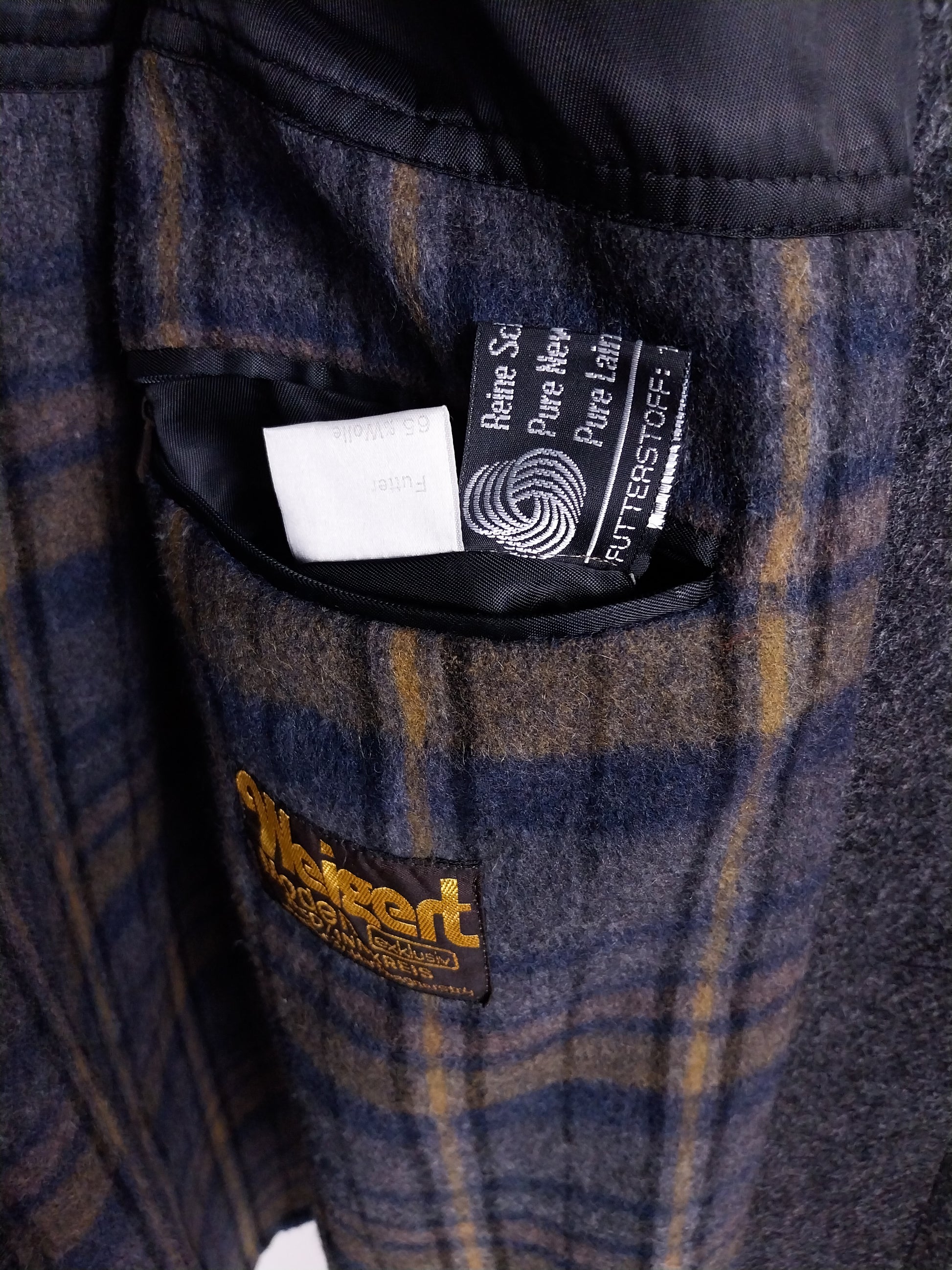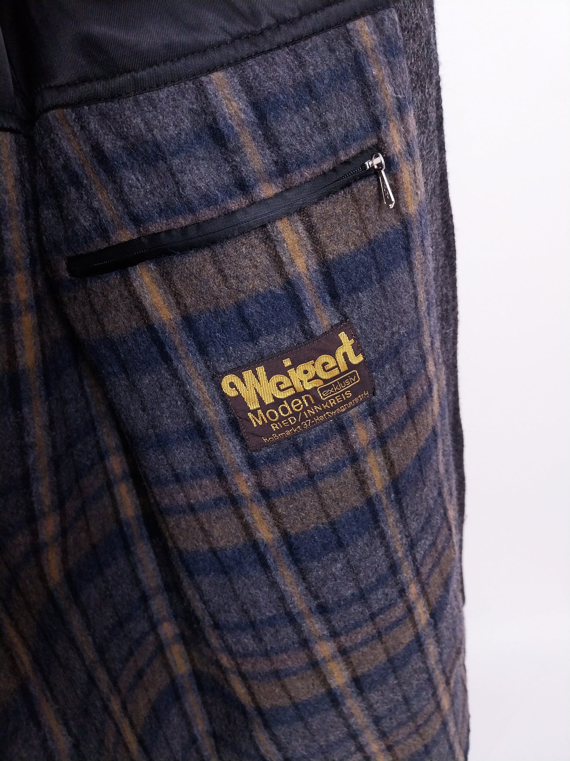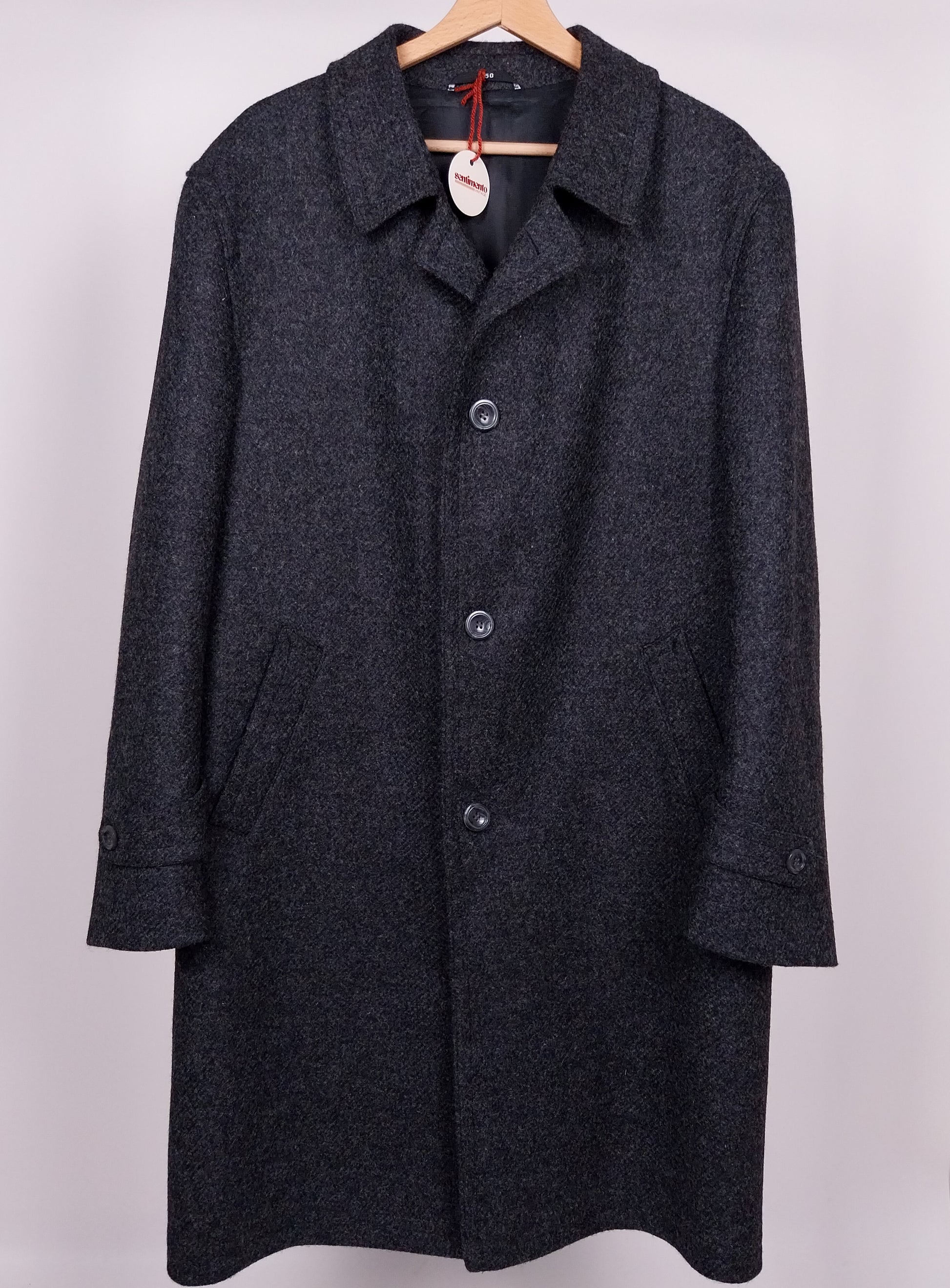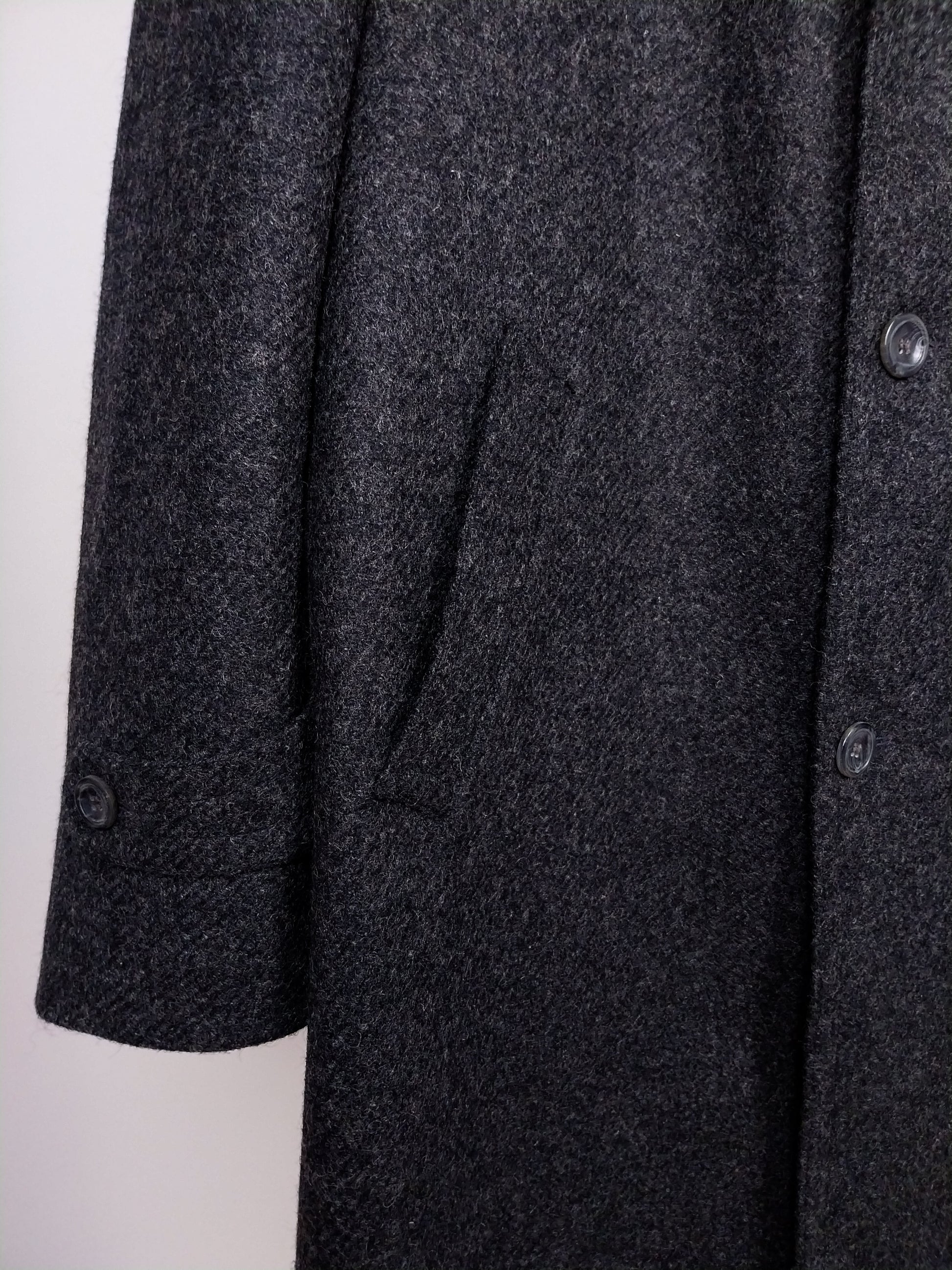 Cappotto grigio vintage in lana. Design classico, con vestibilità dritta, chiusura con 3 bottoni frontali, più un quarto bottone sotto il collo. Presenta una calda fodera in lana con motivo a quadri. Eccellente qualità, caldo e confortevole