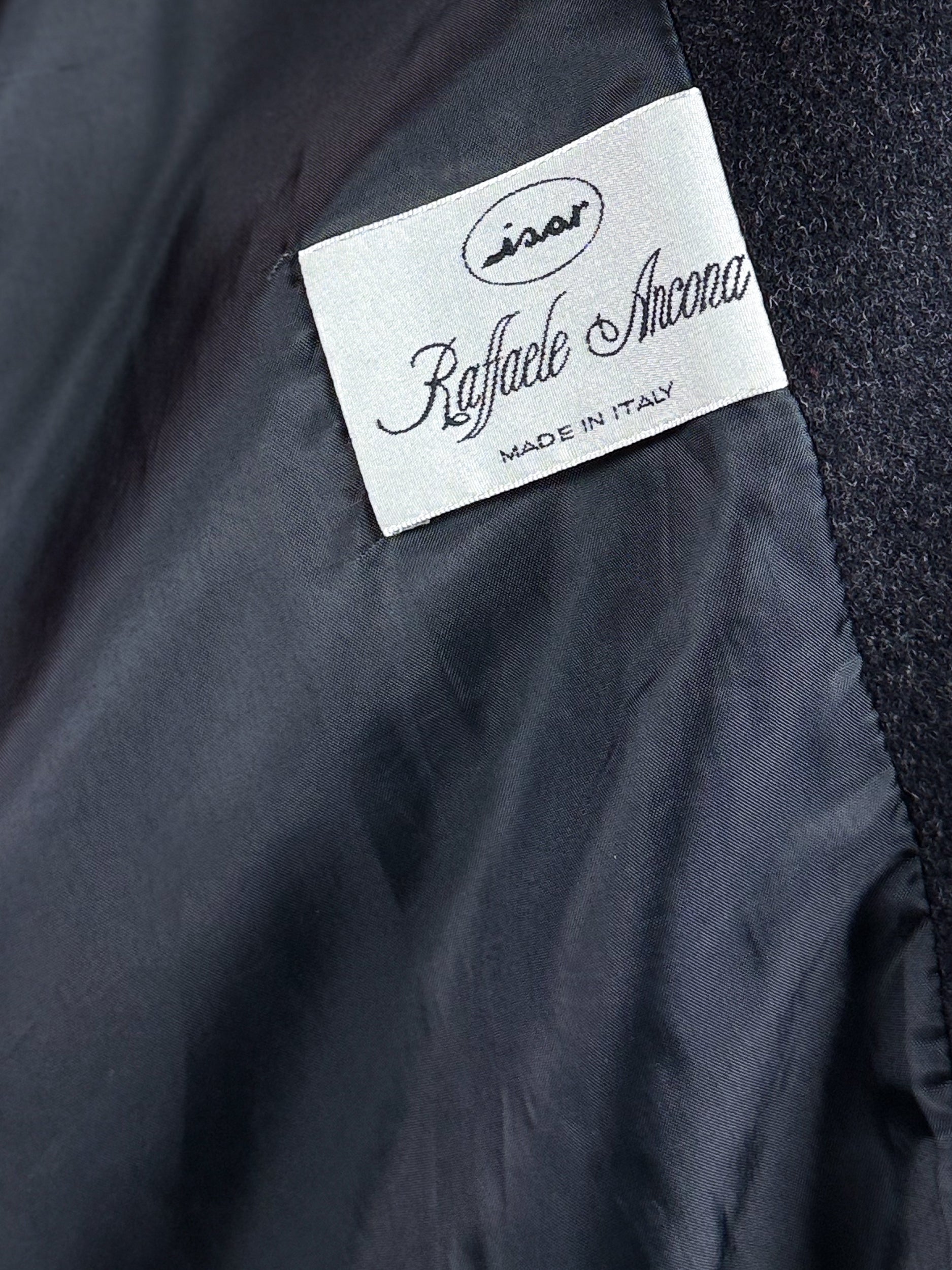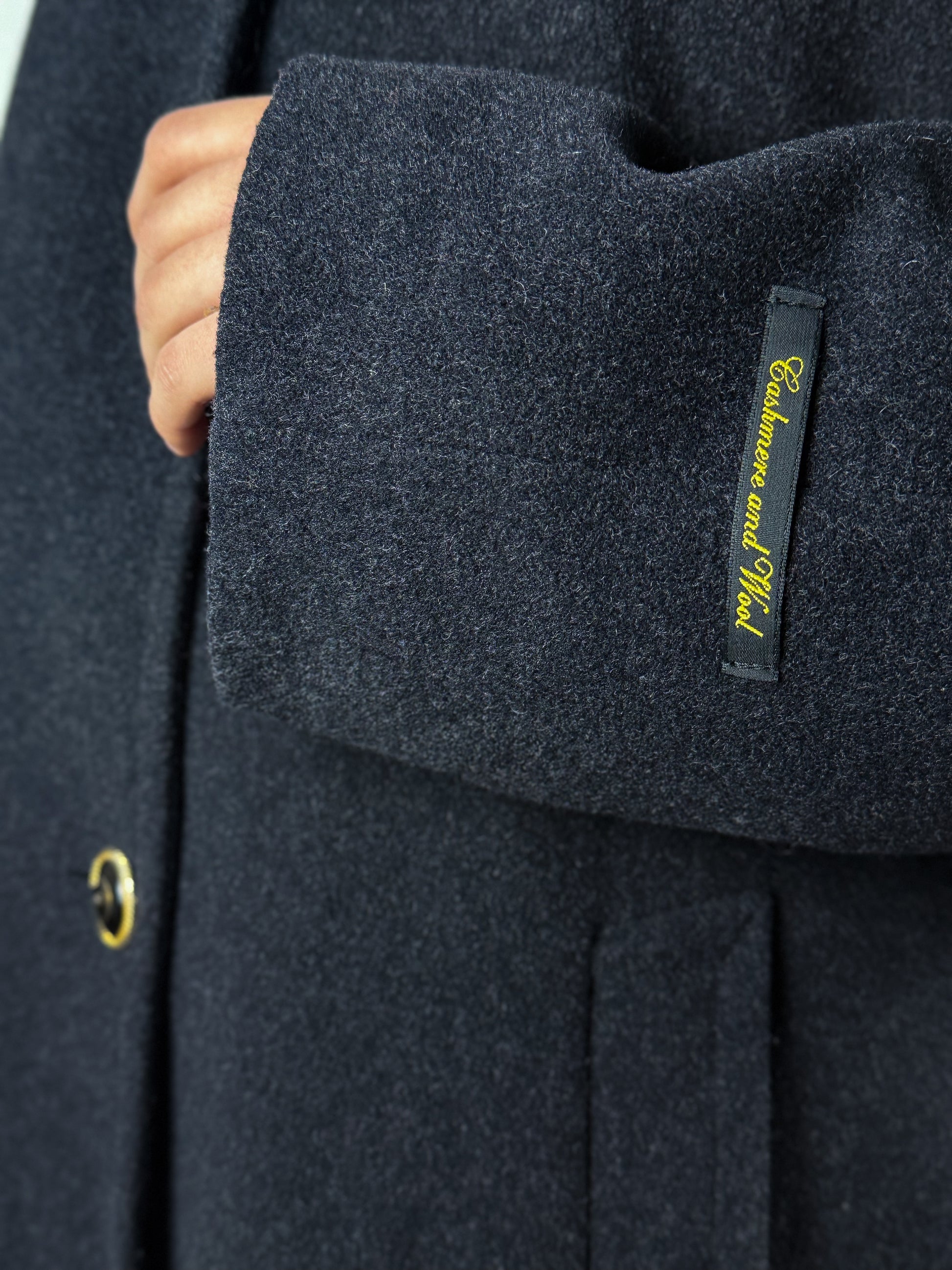 Cappotto vintage in lana e cashmere, grigio scuro. Vestibilità morbida, ma strutturata e lineare con spalline leggermente imbottite. Chiusura con tre bottoni bottoni gioiello dorati e due tasche laterali. Made in Italy, realizzato con materie prime di qualità.