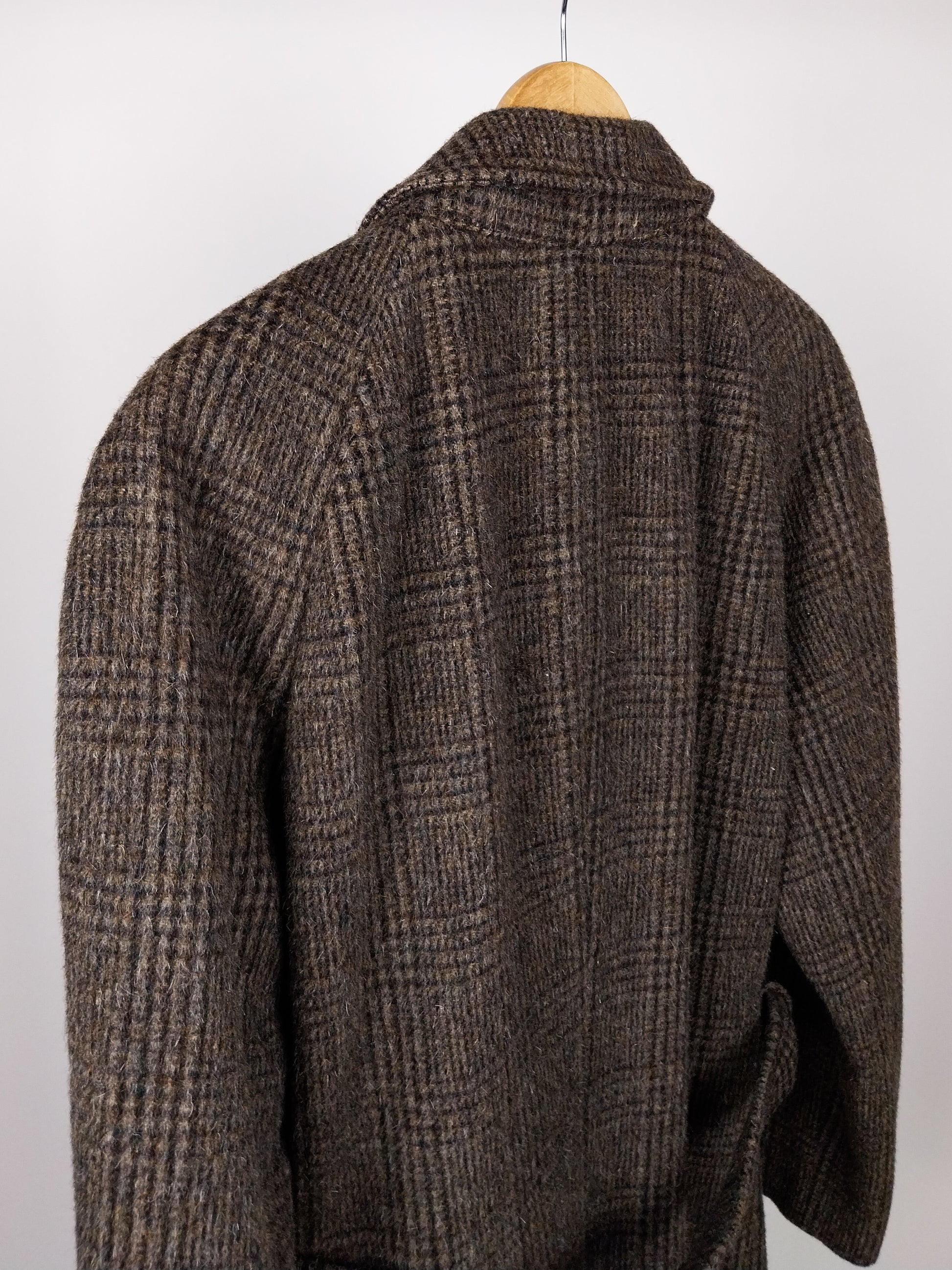 Elegante cappotto vintage da uomo realizzato in un pregiato mix di 35% mohair e 65% pura lana, firmato Moessmer, storica azienda altoatesina nota per i suoi tessuti di qualità superiore. Il mohair conferisce morbidezza e isolamento termico, mentre la lana dona solidità e resistenza.