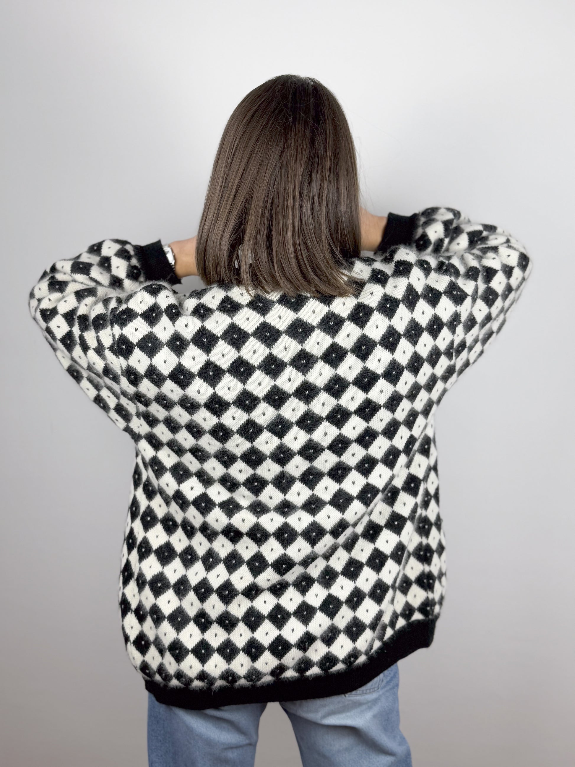 Cardigan anni ’80 bianco e nero con fantasia a rombi, con collo tondo e tasche, interamente foderato, è molto soffice e caldo, ideale da utilizzare anche come giacca.