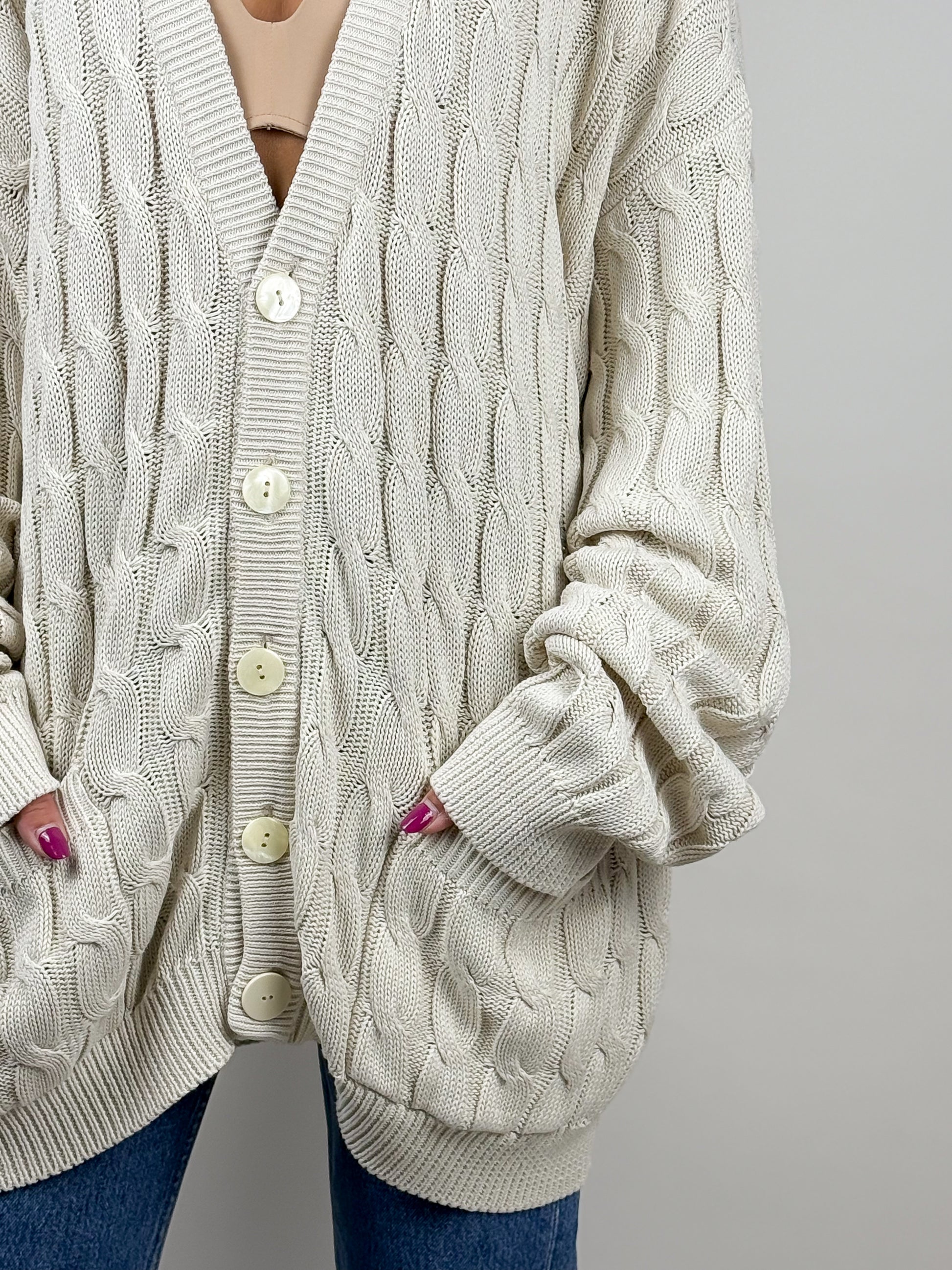 Cardigan vintage beige in cotone con trecce, chiusura a bottoni e tasche. Stile oversize unisex perfetto per look casual. Ideale per le mezze stagioni o da indossare a strati