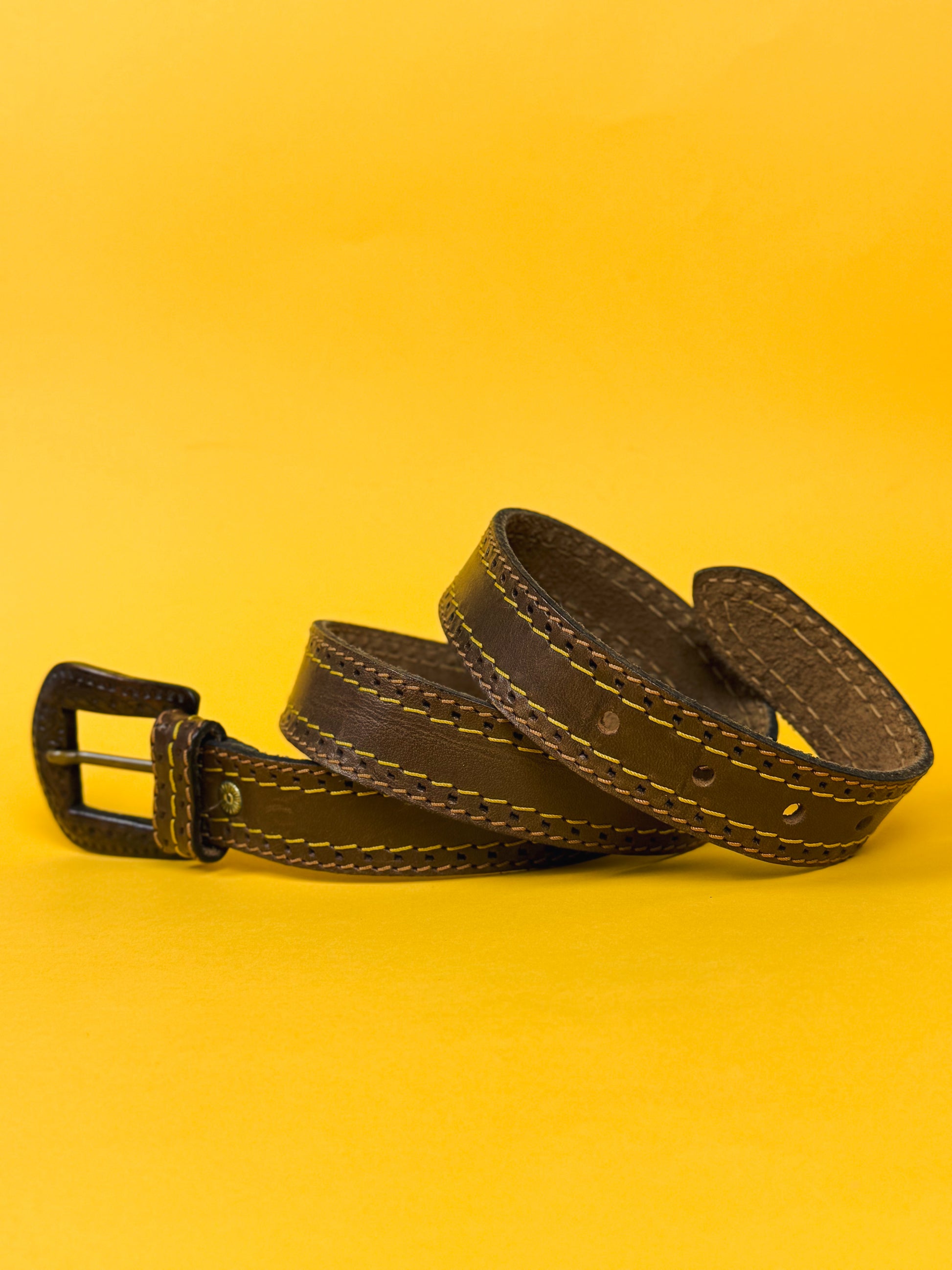 Cintura in vero cuoio con cuciture gialle e fibbia decorata. Ottima qualità.