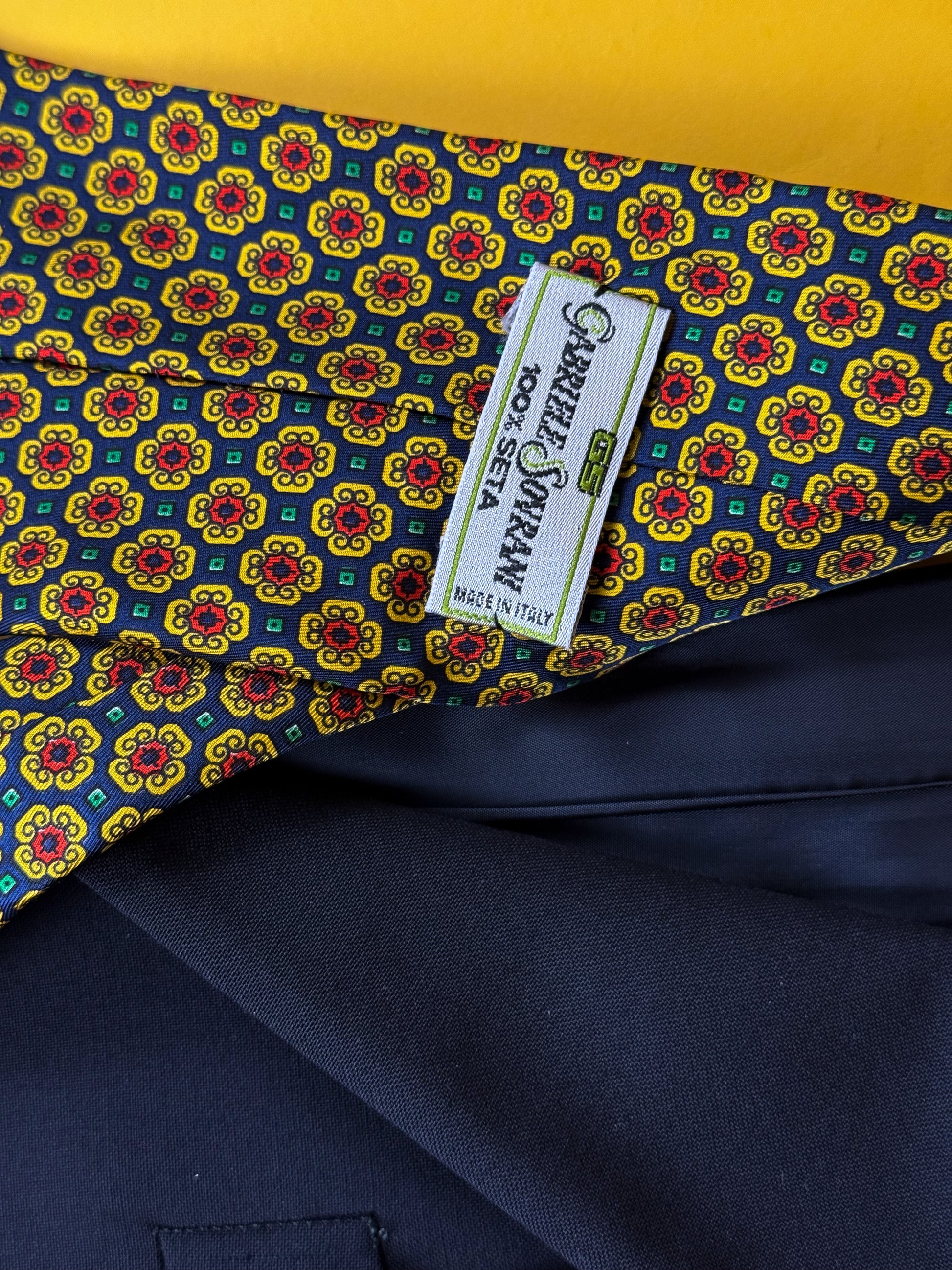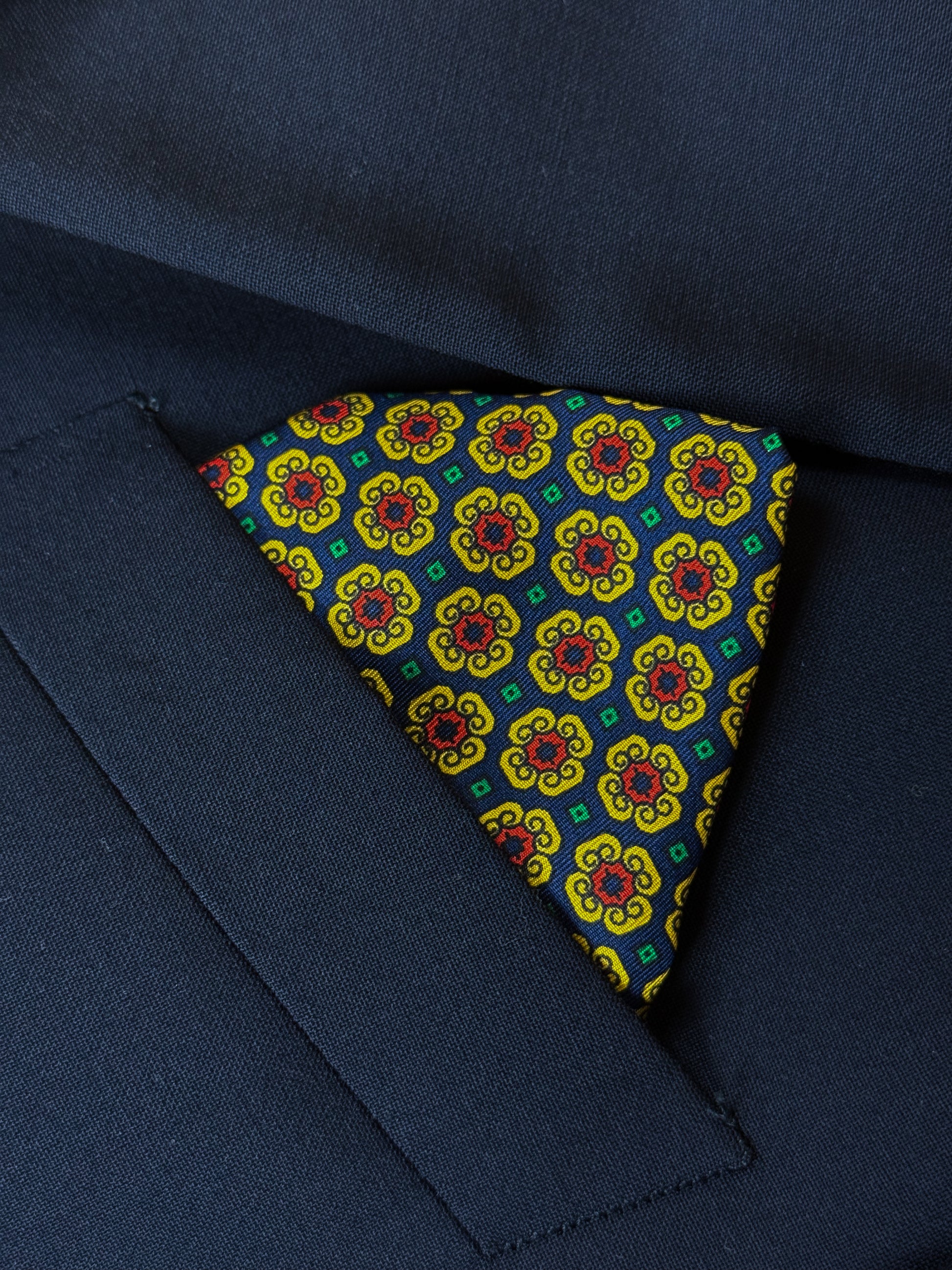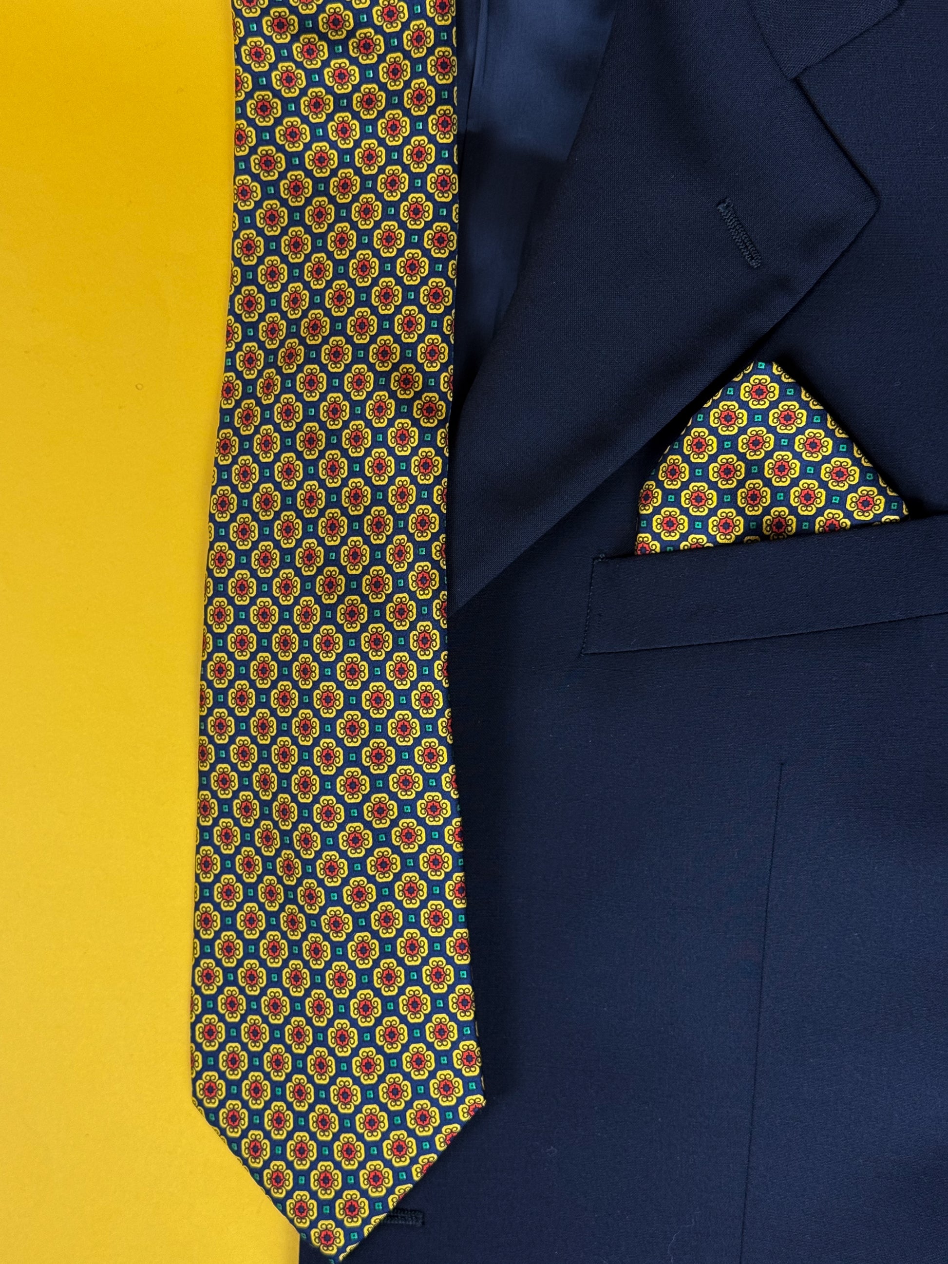 Cravatta con abbinato fazzoletto da taschino in 100% seta, Made in Italy. Anni '90. Fantasia a fiori gialli e rossi su base blu.