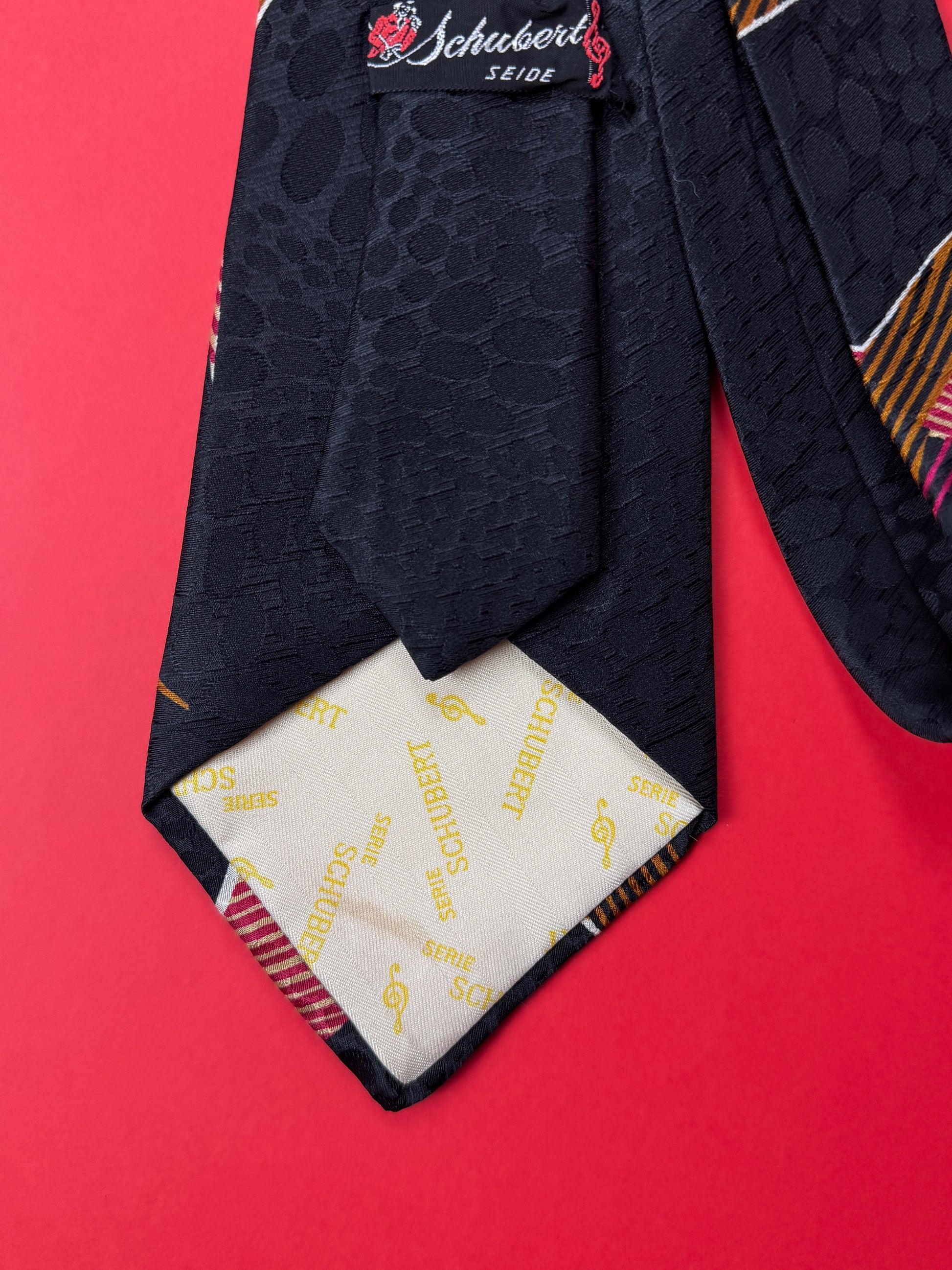 Cravatta anni '90 in 100 % seta, marchio Schubert. Nera con motivi geometrici fucsia e rossi.