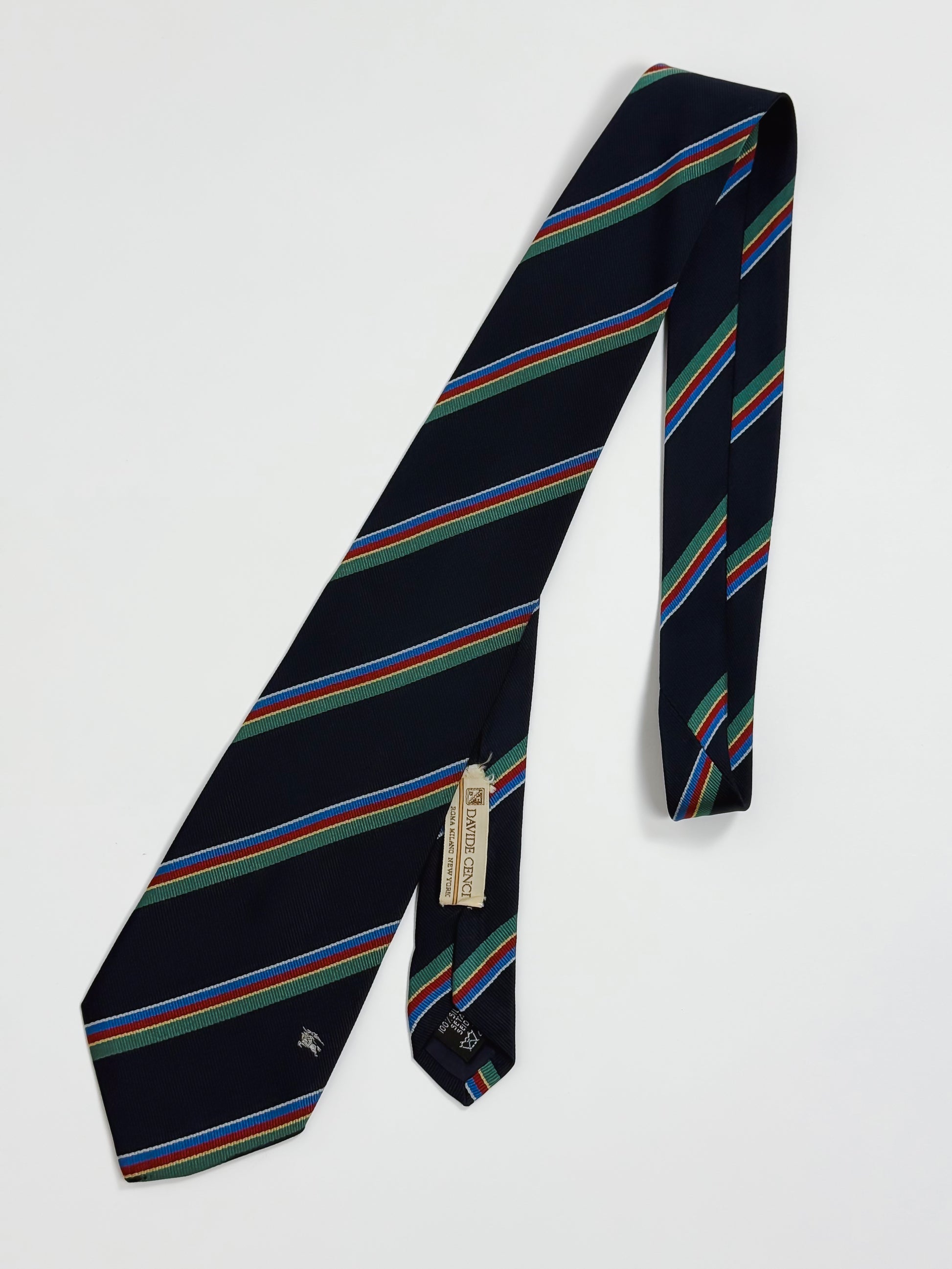 Un pezzo di storia della sartoria inglese, esclusiva cravatta vintage Burberrys Made in England in purissima seta, confezionata dalla prestigiosa sartoria romana Davide Cenci. Un connubio perfetto tra tradizione britannica e maestria italiana. Fantasia iconica: Elegante regimental blu con righe verdi, rosse e celesti. Logo del marchio Burberrys presente fronte e retro.