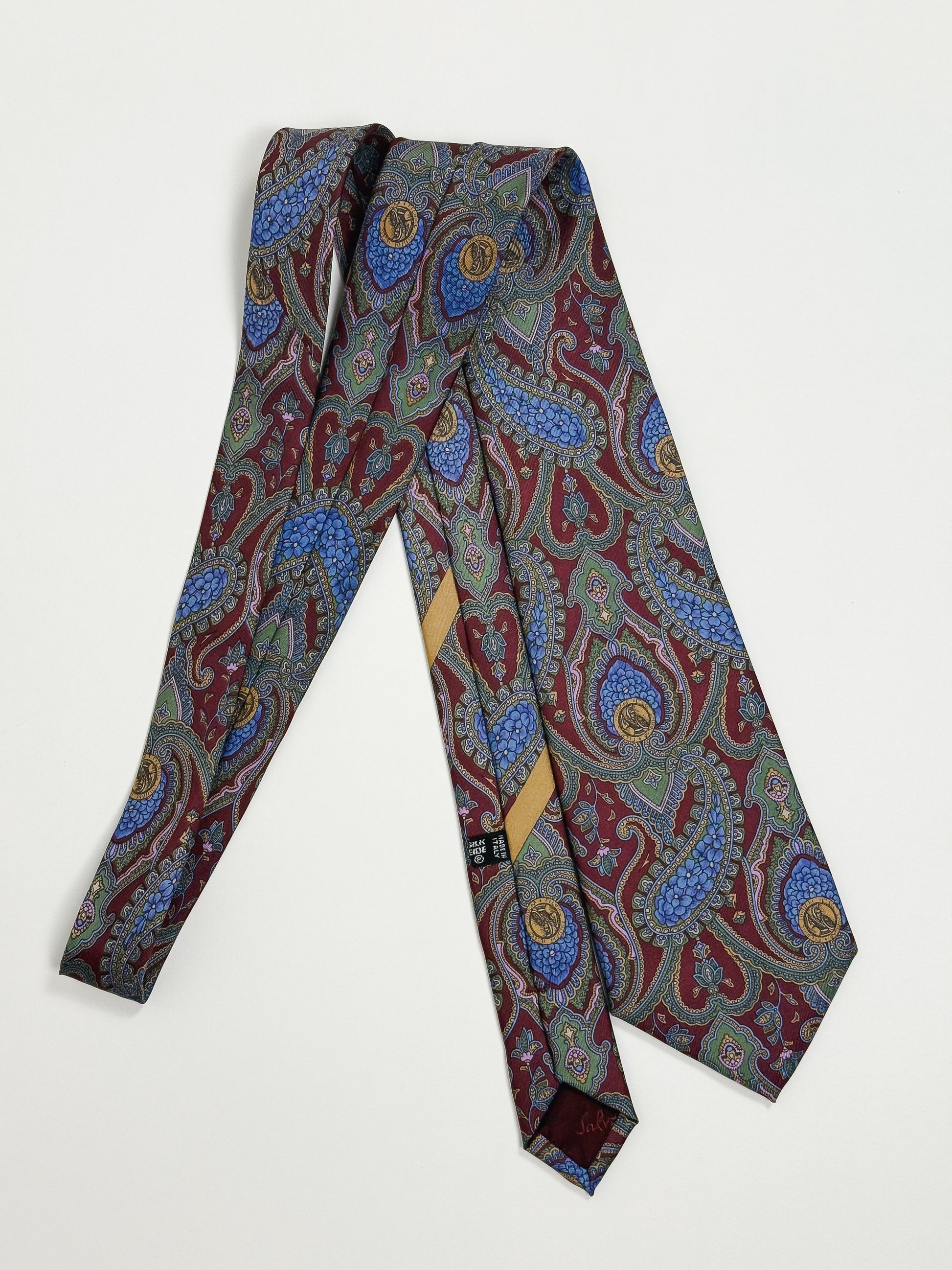 Raffinata cravatta vintage del prestigioso brand italiano Salvatore Ferragamo, realizzata in 100% seta di alta qualità. Il design elegante presenta una splendida fantasia paisley floreale su fondo bordeaux, arricchita da dettagli in verde e celeste.