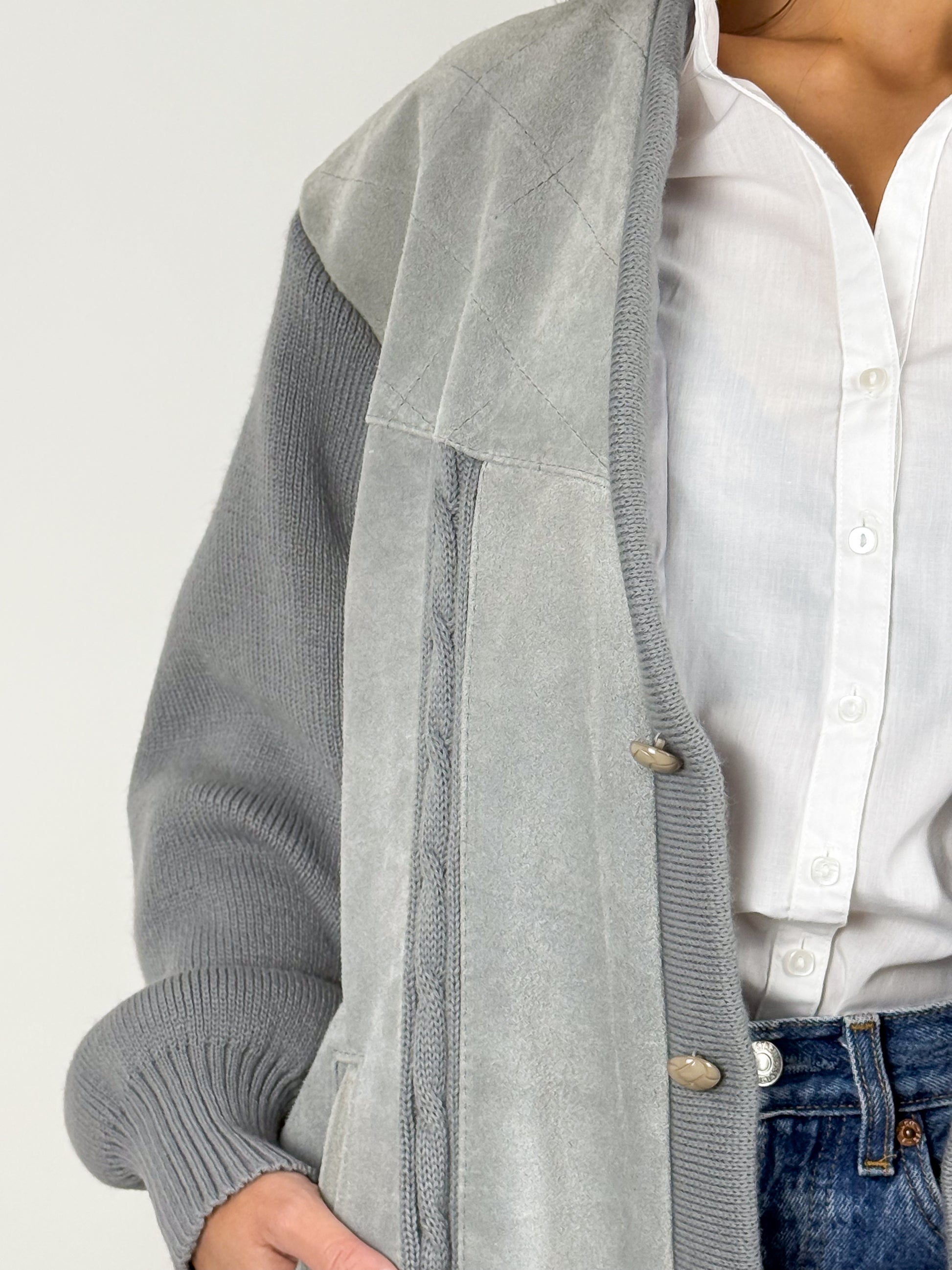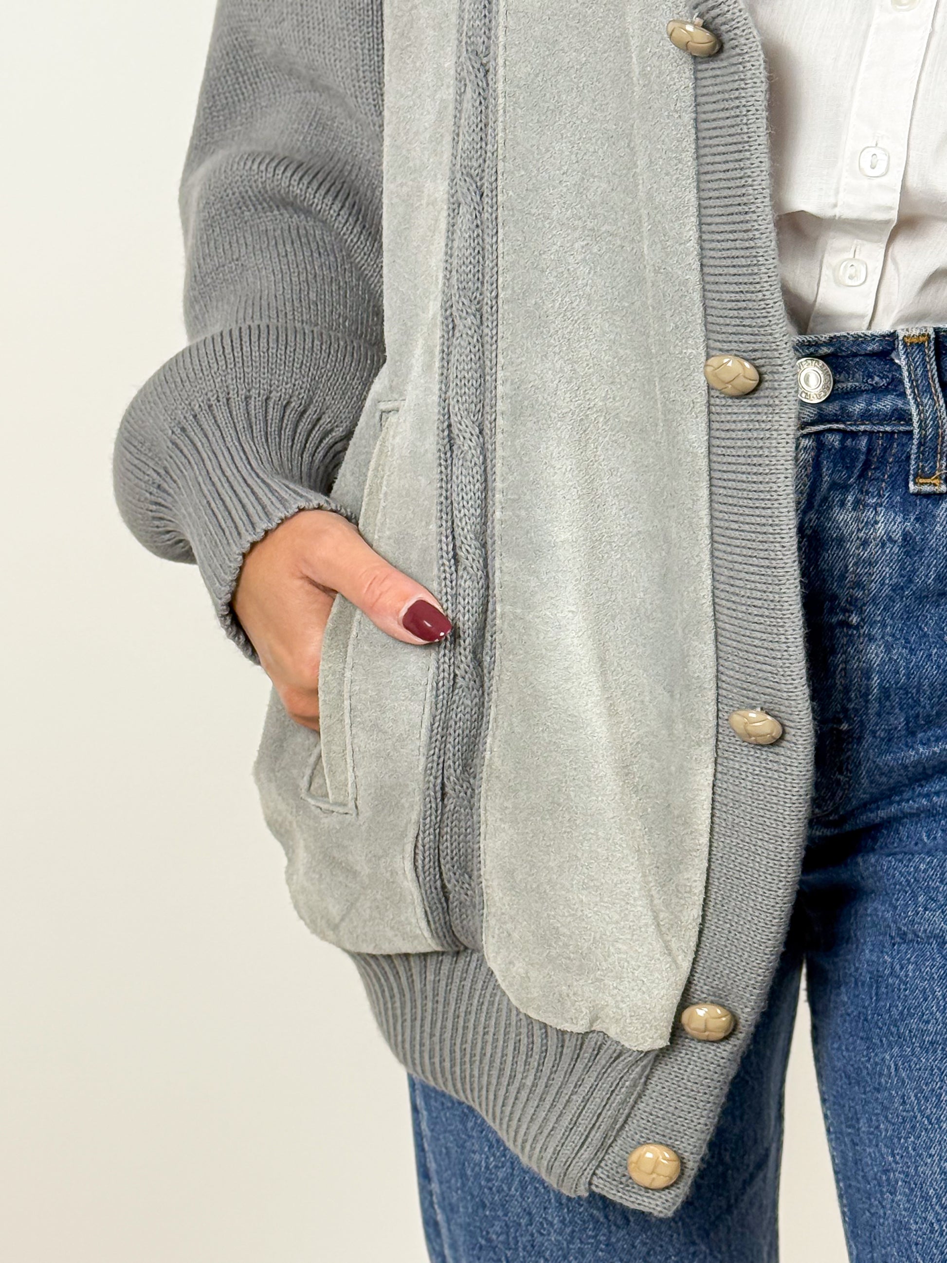 Giacca grigia in pelle scamosciata e maglia. Vintage anni '70, chiusura con bottoni e tasche laterali. elastico sul fondo e ai polsi.