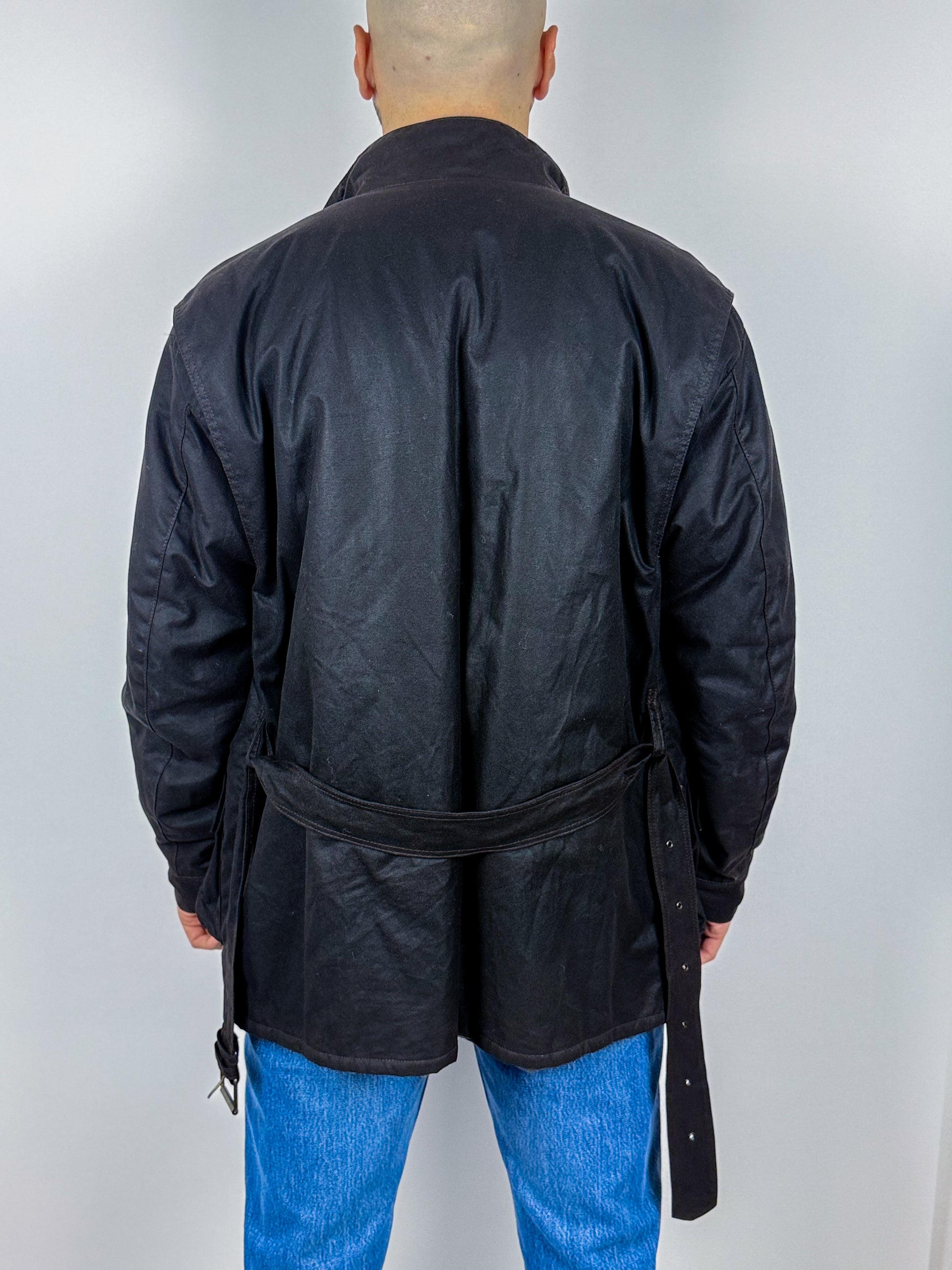 Autentica giacca cerata Belstaff Trialmaster degli anni '90, un pezzo iconico della moda vintage che unisce stile e funzionalità. Realizzata con il caratteristico tessuto cerato impermeabile, questa giacca rappresenta l'eccellenza della tradizione britannica.