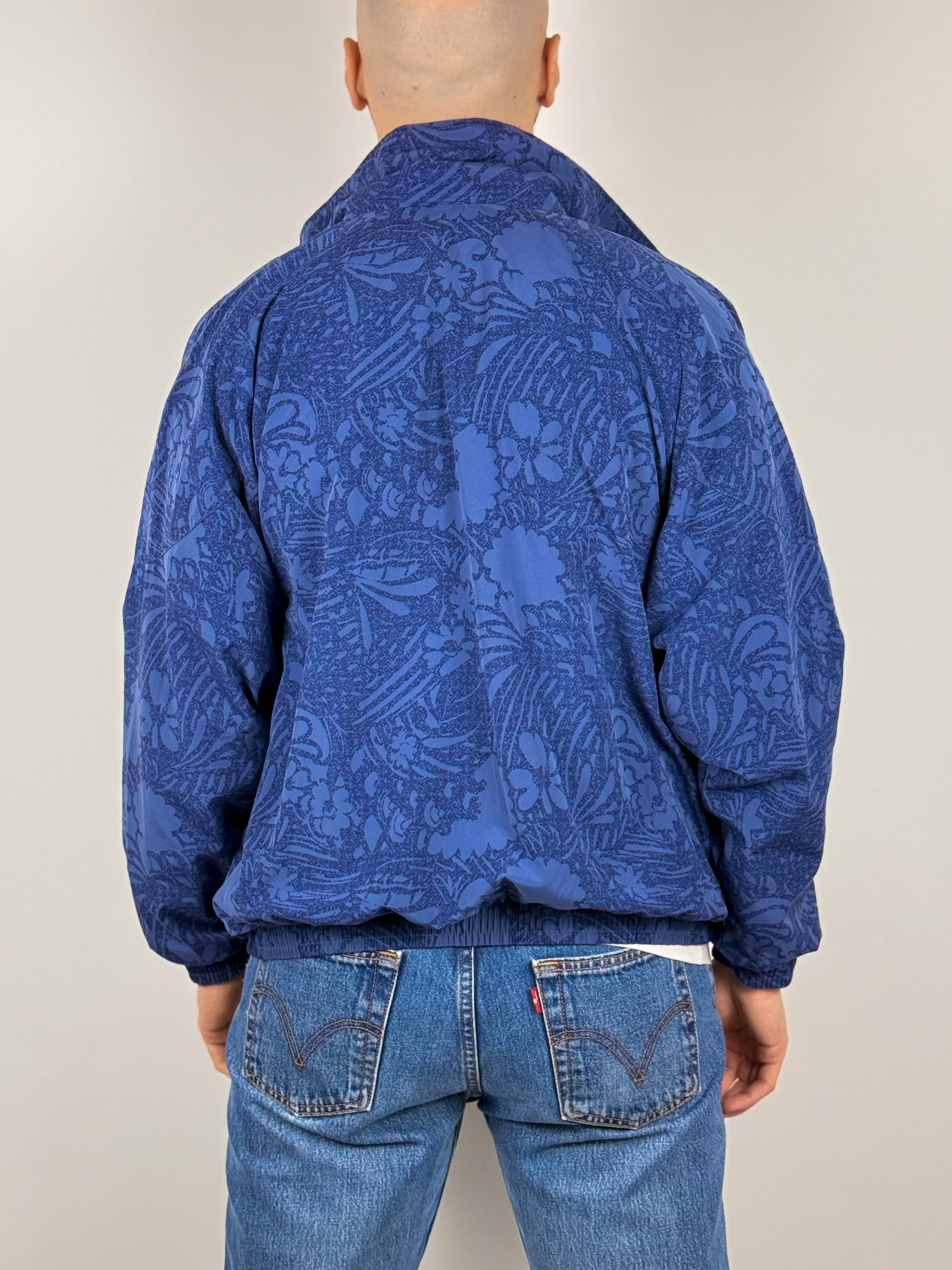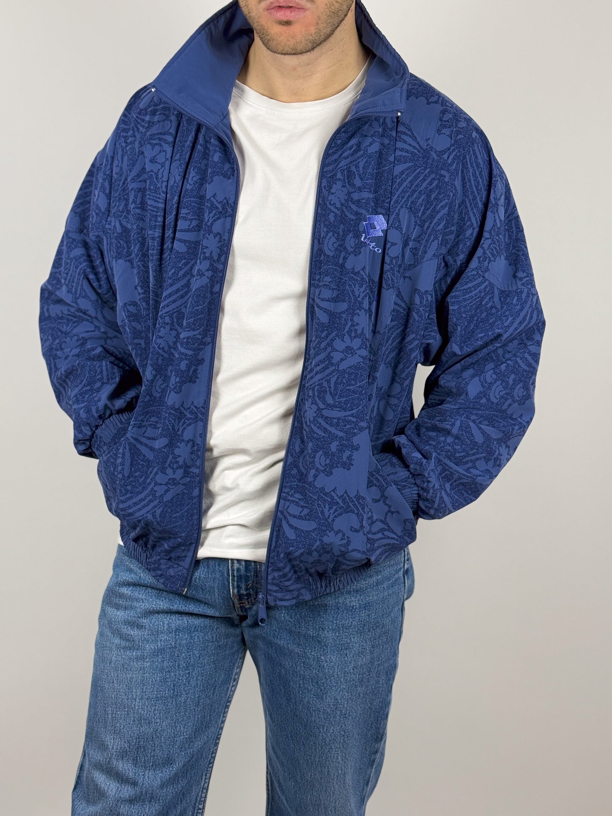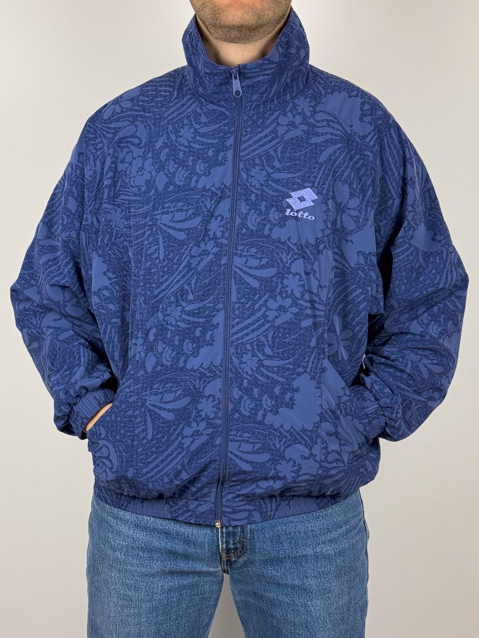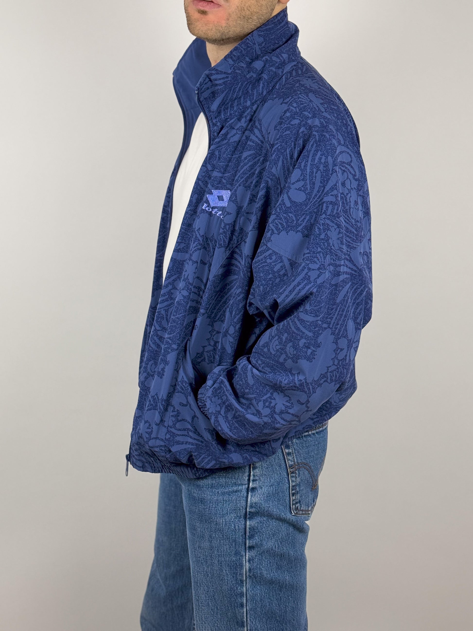 Giacca tuta a fantasia blu anni ’90 Lotto. Chiusura con zip e collo alto, due tasche laterali. Elastico sul fondo e sui polsi. Logo ricamato sul petto.