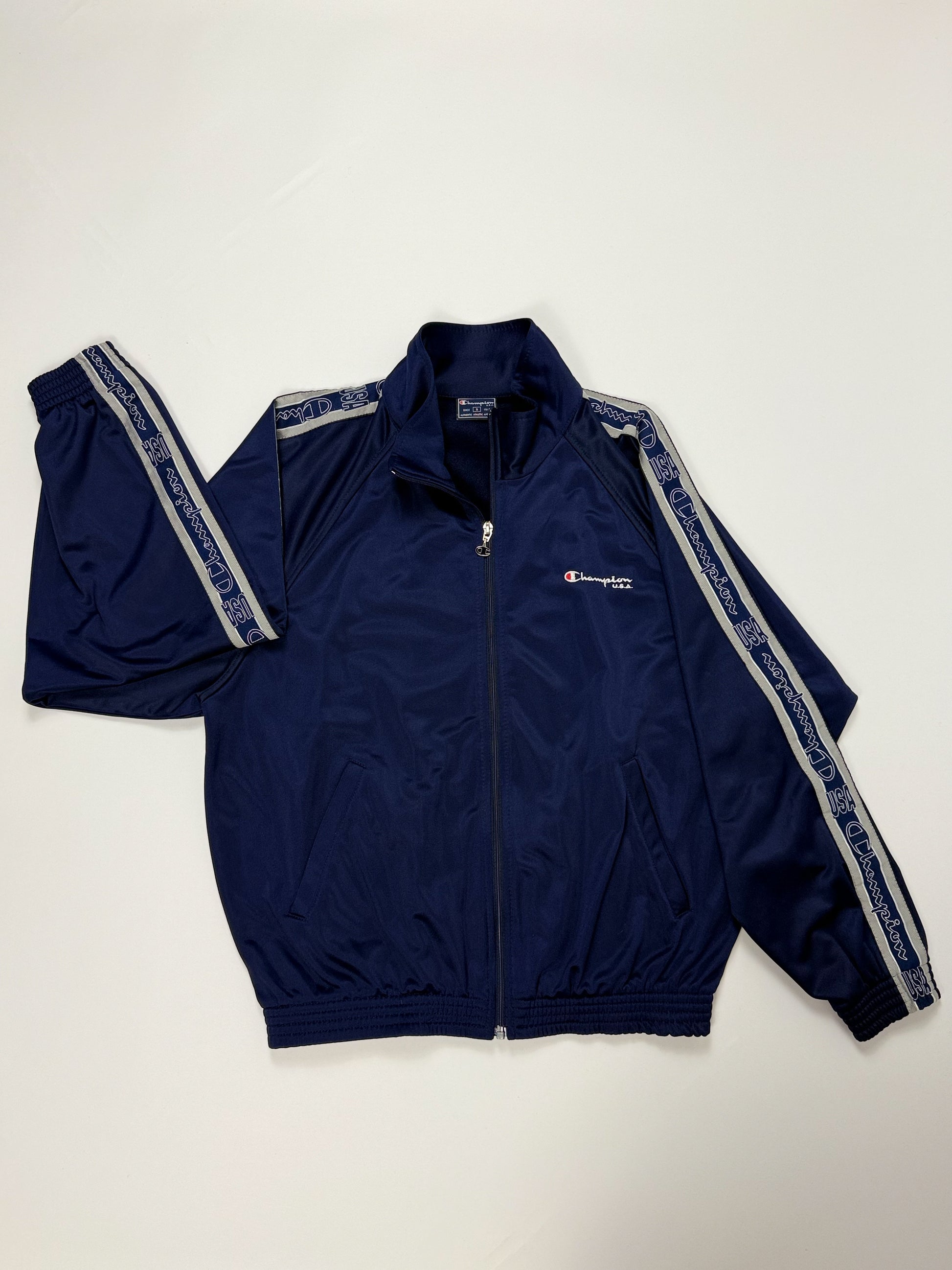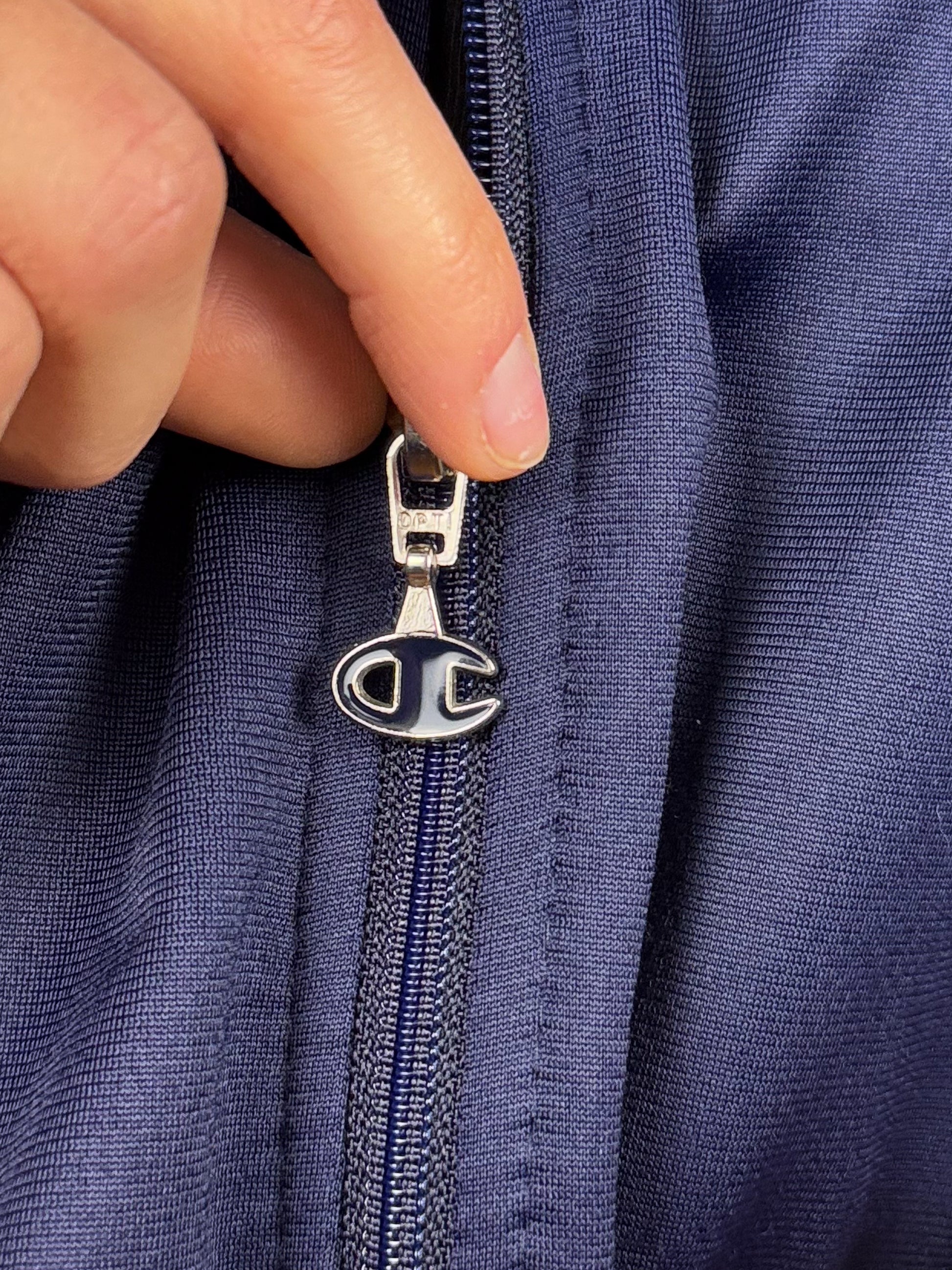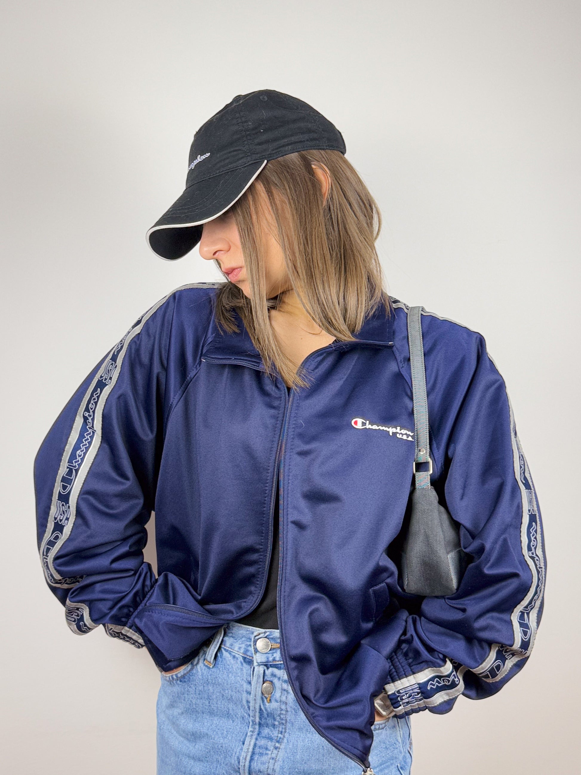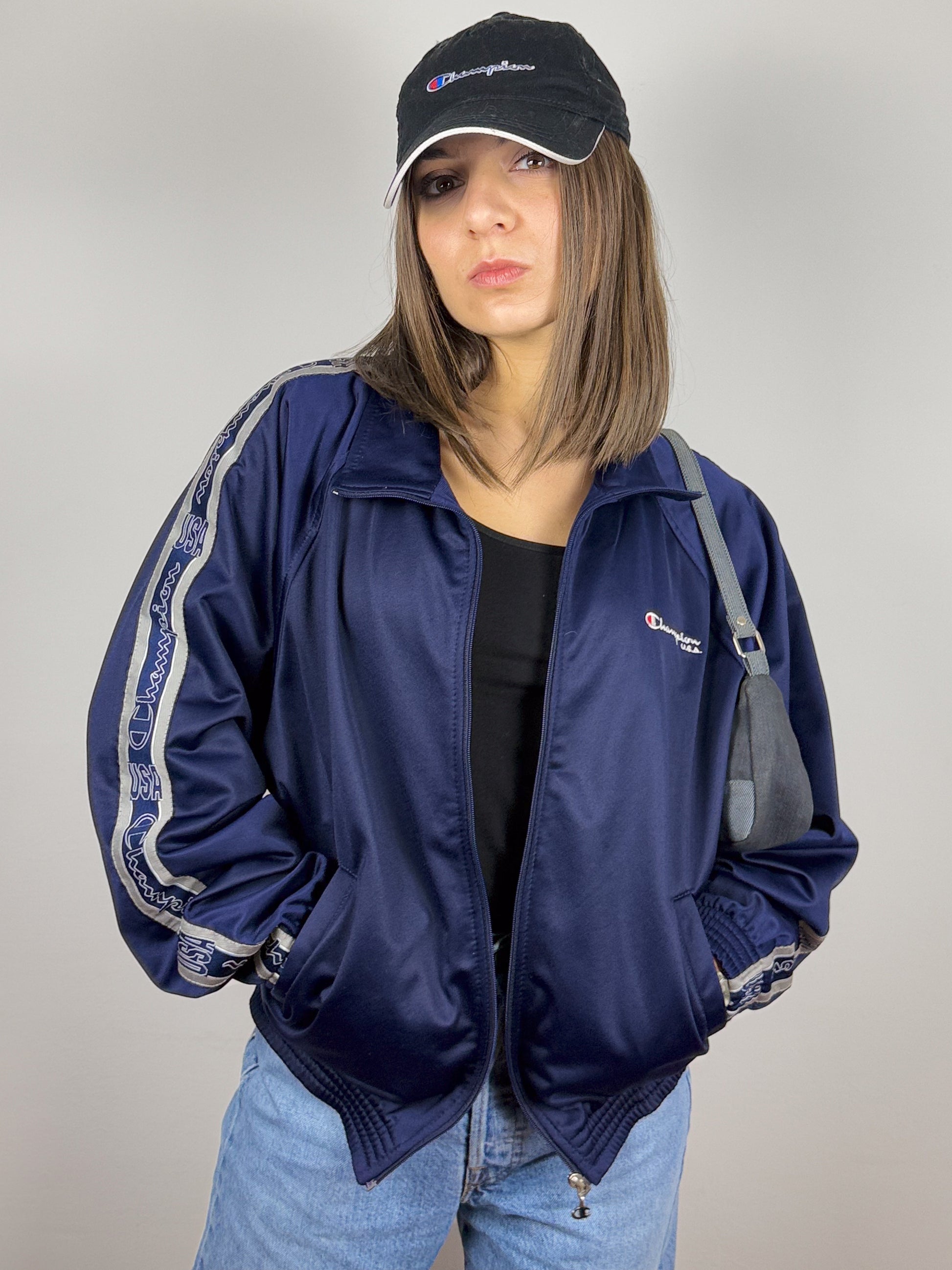 Giacca tuta blu in acetato Champion con zip frontale, due tasche laterali. Logo sul petto e sulle maniche.